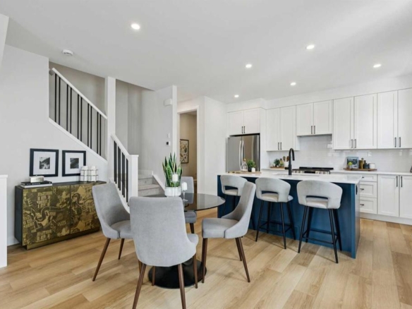The main floor offers a seamless blend of style and everyday functionality, featuring a spacious family room with a floor to ceiling stone gas fireplace and built in surround sound system. The heart of the home is the stunning open concept kitchen, living, and dining areas. The kitchen is complete with stainless steel appliances, upgraded cabinetry, a large corner pantry, beautiful granite countertops, and a generous island, while the dining nook provides direct access to the back deck and yard. A versatile front flex room with large windows offers the perfect space for a home office, sitting area, or additional living space. A conveniently located laundry area and a 2-piece bath complete this level.