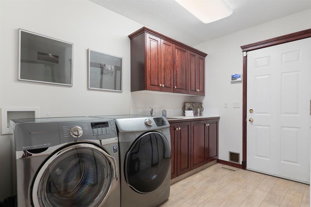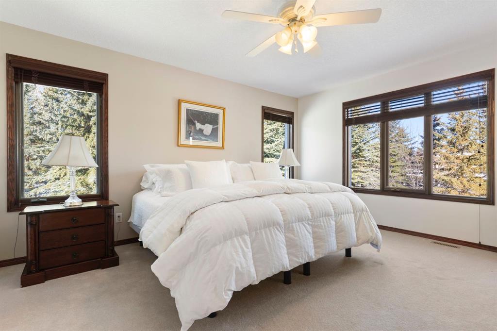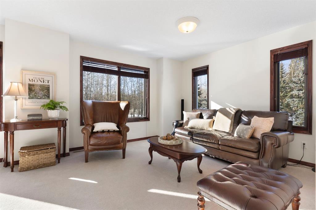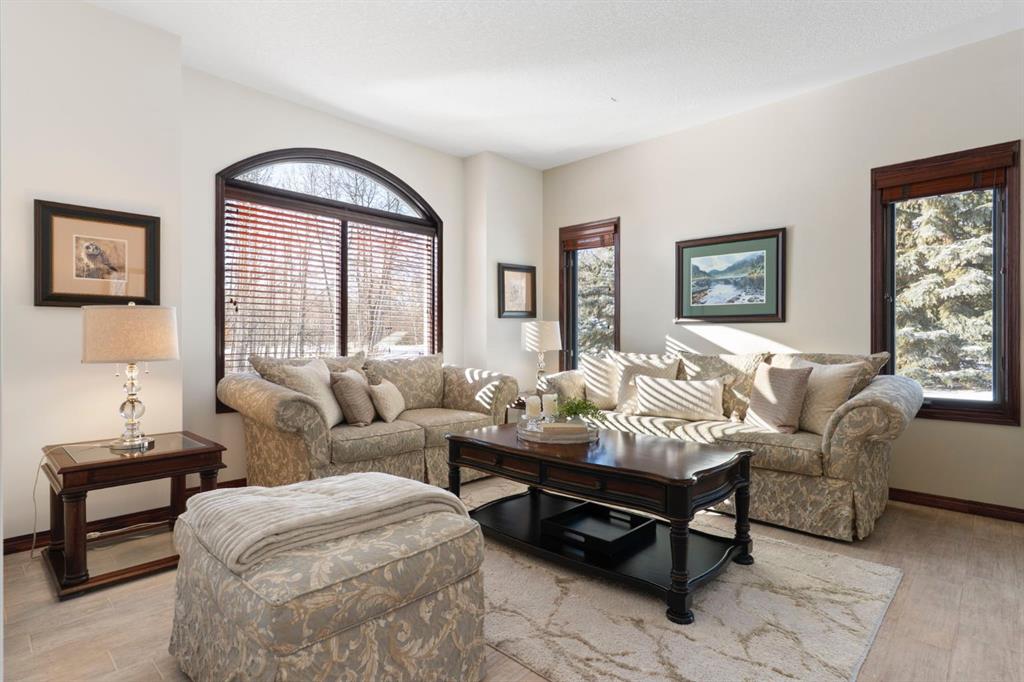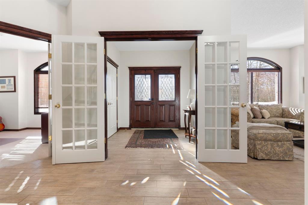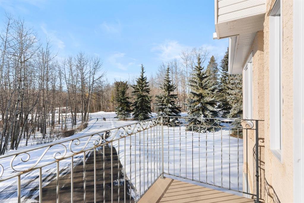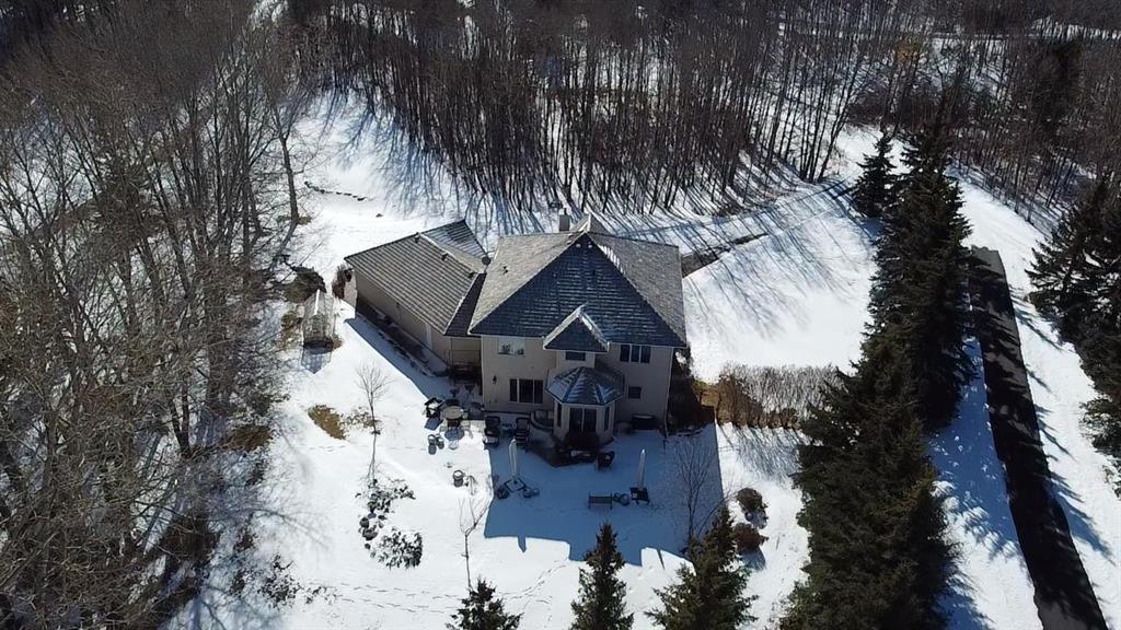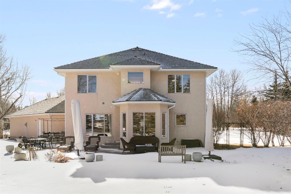 ** Watch the full CINEMATIC property tour** Welcome to this custom two-storey 4213 sqft home by Maillot Homes, perfectly positioned on a private, treed 2-acre parcel in the HEART OF BEARSPAW. Offered by the original owners, this elegant country home blends timeless design with thoughtful updates. It is METICULOUSLY maintained and a truly peaceful setting just 5 minutes from the city limits and amenities. Step through the enclosed entry into a dramatic vaulted foyer where a graceful curved staircase and sparkling chandelier create a memorable first impression. Large picture windows fill the home with natural light, highlighting the spacious principal rooms designed for both everyday living and entertaining. The kitchen features refinished oak cabinetry, GRANITE COUNTERTOPS, stainless steel appliances, a corner pantry, island, and tiled backsplash. The sunny-bayed breakfast nook opens to a large exposed aggregate patio overlooking the beautifully landscaped yard, while the adjoining family room offers a cozy FIREPLACE with custom built-ins and stone surround. A main floor office with south-facing windows, convenient laundry with garage access, and elegant living and dining rooms complete the main level. Upstairs, the home offers three generous bedrooms plus a bright bonus room with deck access to a Juliet balcony. The primary retreat includes a large walk-in closet and a luxurious 5-piece ensuite with jetted tub and double vanity. The fully developed basement provides a spacious recreation area with endless potential, a fourth bedroom, and abundant storage. RECENT UPDATES: Include: $40K in groundworks, NEW hot water tanks, sump pumps, septic tank pump and plumbing, Moen Flo device on main water line, NEW dishwasher, Induction range, and upright freezer. Additional HIGHLIGHTS include central air conditioning, newer furnace, triple attached oversized insulated garage, dry riverbed landscaping, greenhouse, and a private yard surrounded by mature trees. A rare opportunity to enjoy the tranquility, space, and lifestyle that make Bearspaw one of the region’s most sought-after acreage communities.