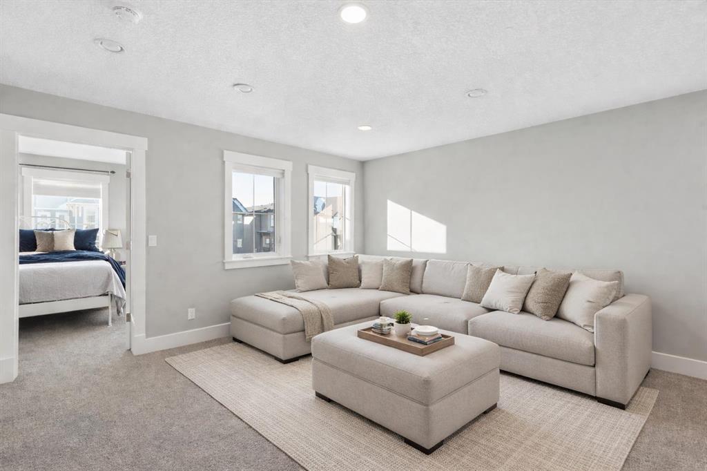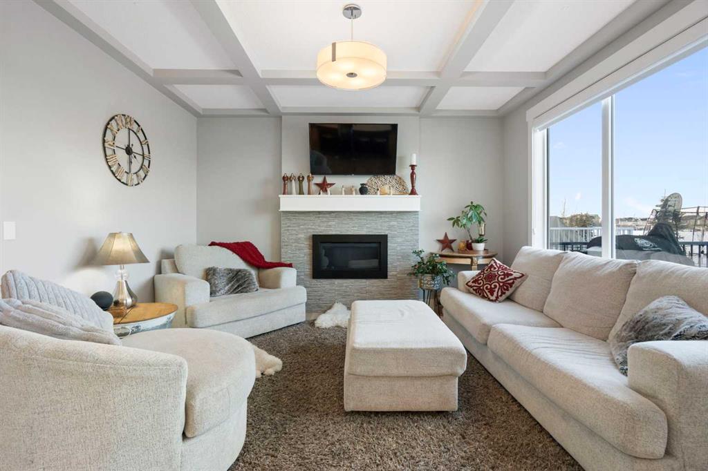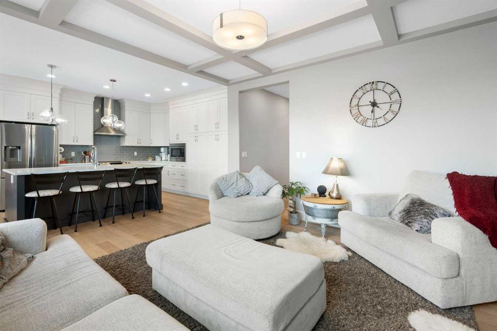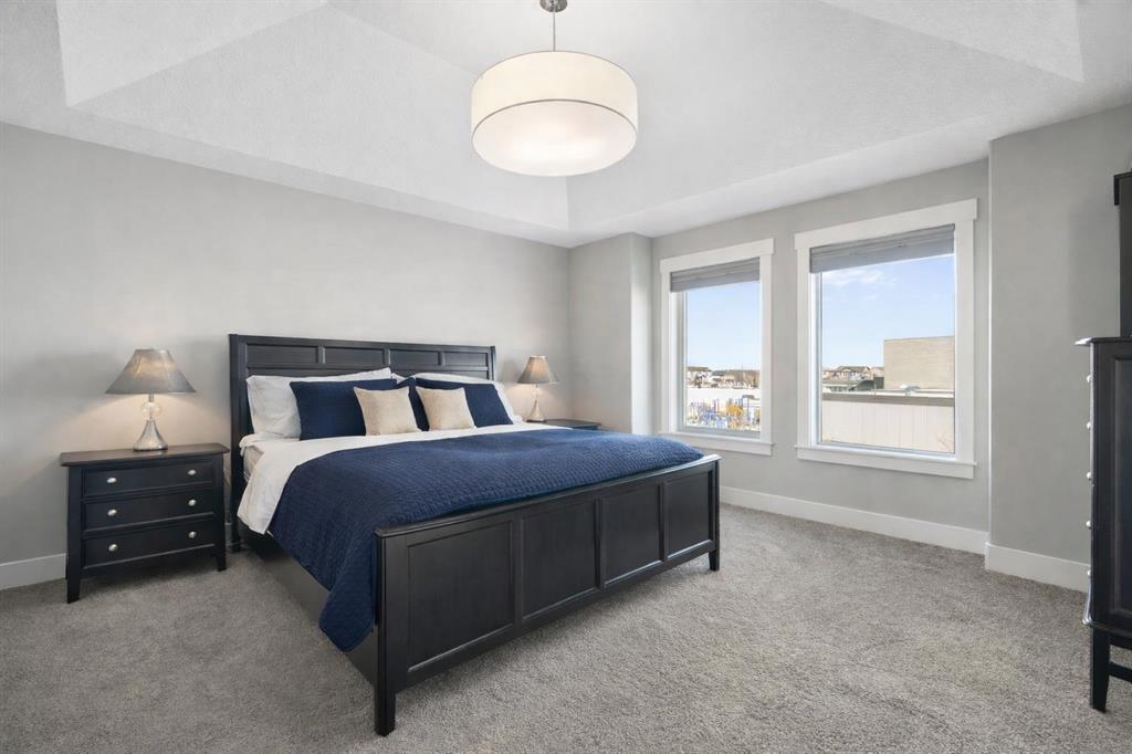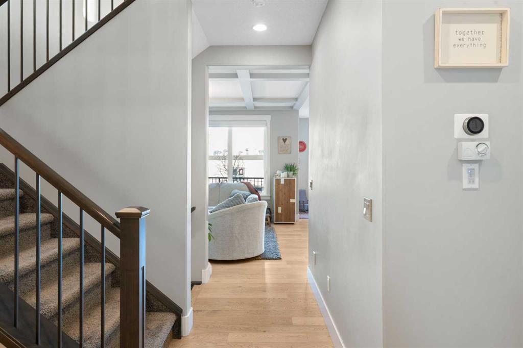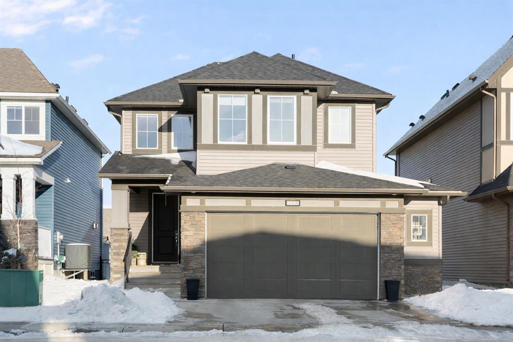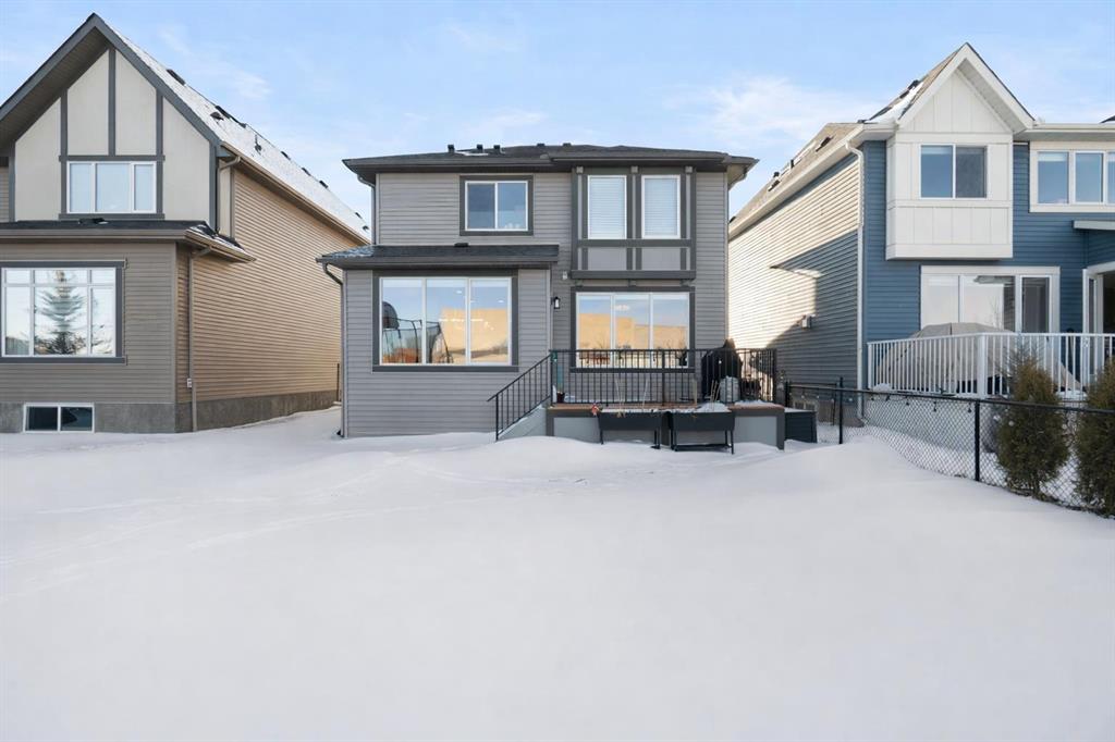 Welcome to a home that feels elevated from the very first step inside. Custom built by Harder Homes, this beautifully crafted two storey in Coopers Crossing offers over 3000 square feet of thoughtfully developed living space. With its distinctive exterior, sloped roof lines, and MASSIVE GARAGE, the curb appeal makes a strong first impression. Inside, the sense of space and intention continues. The main floor unfolds with a grand foyer that opens into a warm and welcoming great room, anchored by coffered ceilings and a GAS FIREPLACE that invites slow evenings and enjoyable gatherings. ENGINEERED HARDWOOD floors carry throughout, paired with 9′ CEILINGS and 8′ DOORS that add both height and presence. The kitchen is truly the heart of the home. Beautifully finished with ceiling height cabinetry, stainless steel appliances, and a generous center island, it offers exceptional storage and space to cook, host, & connect. The dining area sits just off the kitchen, filled with natural light and perfectly positioned for everyday meals or weekend entertaining. A dedicated MAIN FLOOR OFFICE creates a quiet place to work or study, tucked away yet still connected to the rhythm of the home. The mudroom leading to the garage is complete with built-ins and a charming barn door, keeping busy days organized. Every detail feels considered, right down to the Nest thermostat and the added AIR CONDITIONING (2022) for year round comfort. Upstairs, the layout is as functional as it is spacious. The primary suite feels like a true retreat, with room to unwind, a large WALK-IN CLOSET with custom built-ins, and a luxurious 5 piece ensuite featuring dual sinks, a deep soaker tub, & a spacious shower. Two additional bedrooms are generously sized and share a well appointed 5 piece bath with double sinks, ideal for growing families. The BONUS ROOM offers flexibility for movie nights or play space, complete with a rough in for speakers to elevate your home entertainment experience. An upgraded railing adds a refined architectural touch as you move between levels. The fully developed basement extends the living space even further, with a massive recreation and media area that easily adapts to your needs. A 4th bedroom, separate den and full 4 piece bathroom make it perfect for guests, teens, or multi generational living. Backing directly onto a school, the backyard setting offers both privacy and convenience, with no rear neighbours and quick access to green space and community pathways. Living in Coopers Crossing means being part of one of Airdrie’s most sought after neighbourhoods, known for parks, schools, and a strong sense of community. It is the kind of place where families put down roots and stay awhile. Book your private showing and experience it for yourself! *Some photos have been virtually staged*