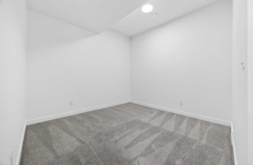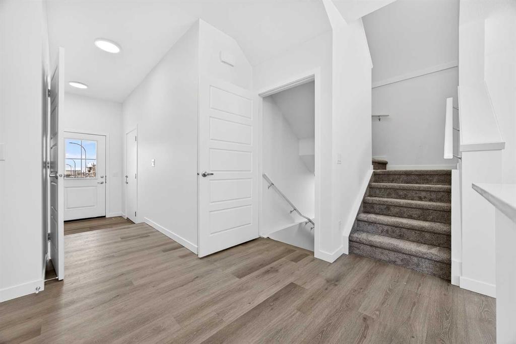 This fully finished two-storey townhome offers exceptional flexibility with four bedrooms and four bathrooms across three levels of developed living space. The main floor features a bright open-concept layout connecting the kitchen, dining area, and living room, creating a comfortable space for both everyday living and entertaining. The kitchen is beautifully finished with modern slab-style cabinetry featuring 42” upper cabinets, a full bank of drawers, soft-close doors, polished white quartz countertops, tile backsplash, stainless steel Whirlpool appliances, and a polished chrome Moen high-arc faucet with pull-down sprayer. Luxury vinyl plank flooring runs throughout the main living areas, bathrooms, and laundry room, while contemporary lighting selected by professional designers completes the modern interior.