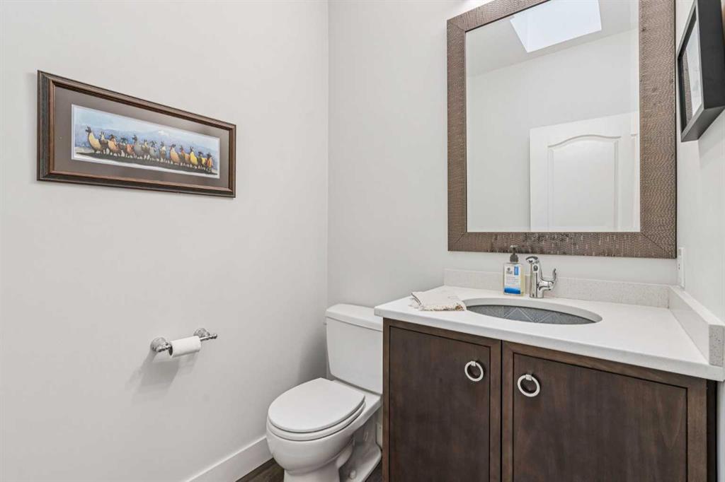 The main floor has smooth ceilings throughout, a newer foyer skylight, and Divine Flooring white oak hardwood that runs through the entire level and down the stairs. The home features 9 foot ceilings on both levels and a cathedral ceiling in the main floor living and dining area. Off the foyer is an office/den with French doors that can be closed off from the rest of the main floor. The kitchen was fully gutted in 2016 with quartz countertops, full-length upper cabinetry, tile backsplash, and new appliances, with an island open to the dining area. The dining area has room for a full-sized table and connects the kitchen to the living room. The living room has a brand new freestanding fireplace, south-facing windows, and walks out to the back deck which has an awning for shade and a door with embedded blinds. The primary bedroom has a custom walk-in closet with pocket door and built-in shelving, and the ensuite has been updated with a granite countertop, newer vanity, Moen fixtures, and newer flooring. The powder room has a custom cabinet and decorator sink. The main floor also has a laundry room just off the garage entry. A glass panel stair railing with painted oak leads down to the lower level.