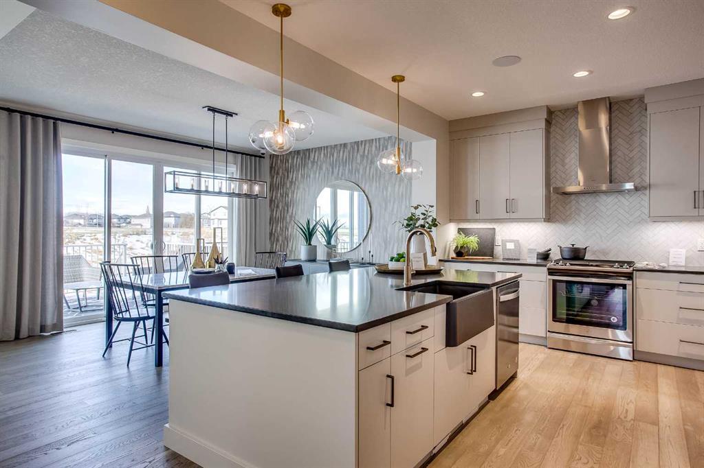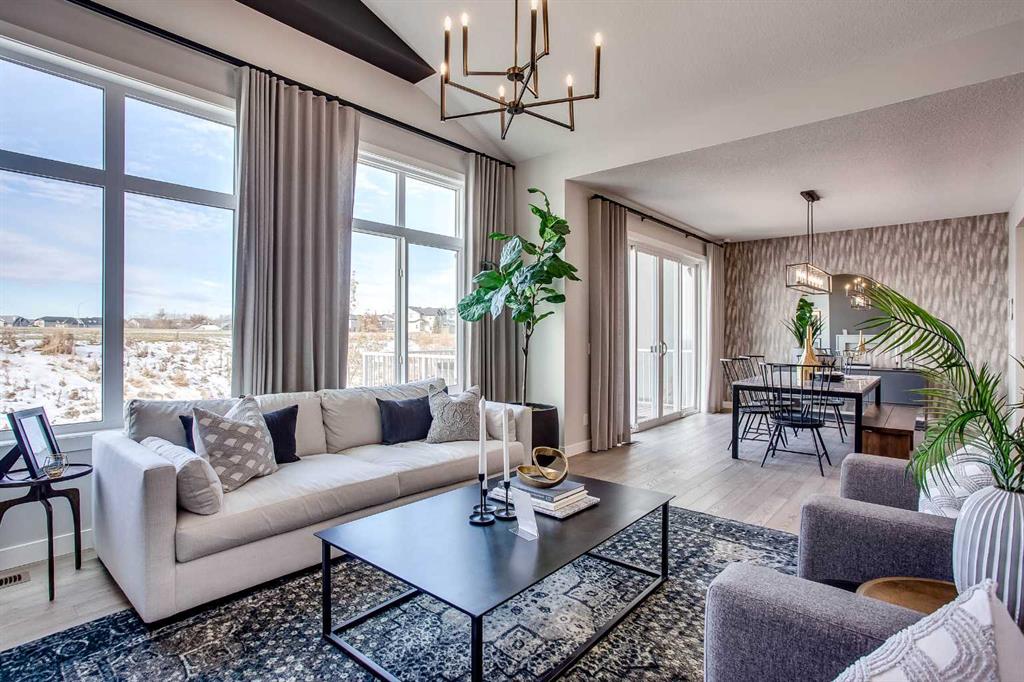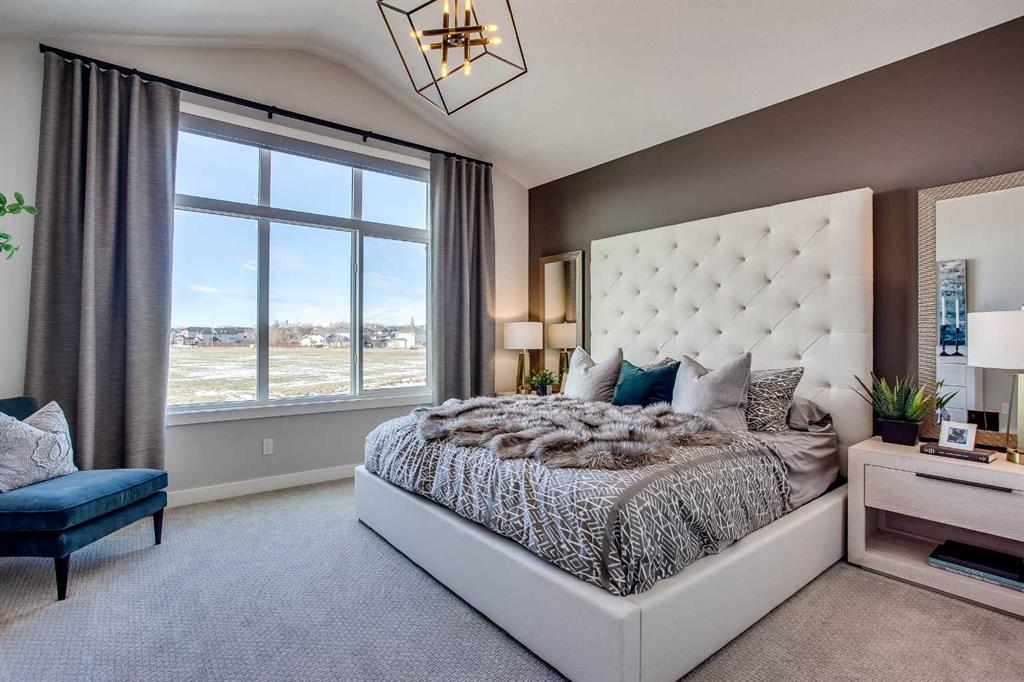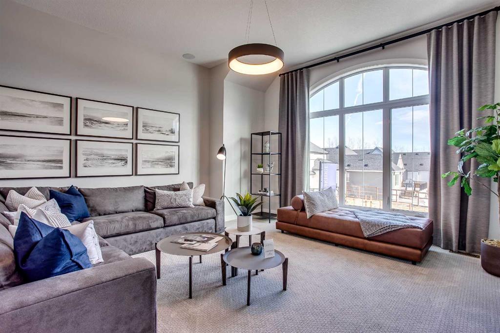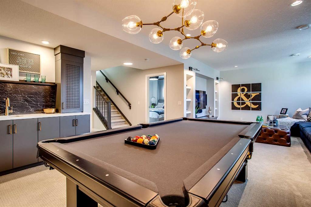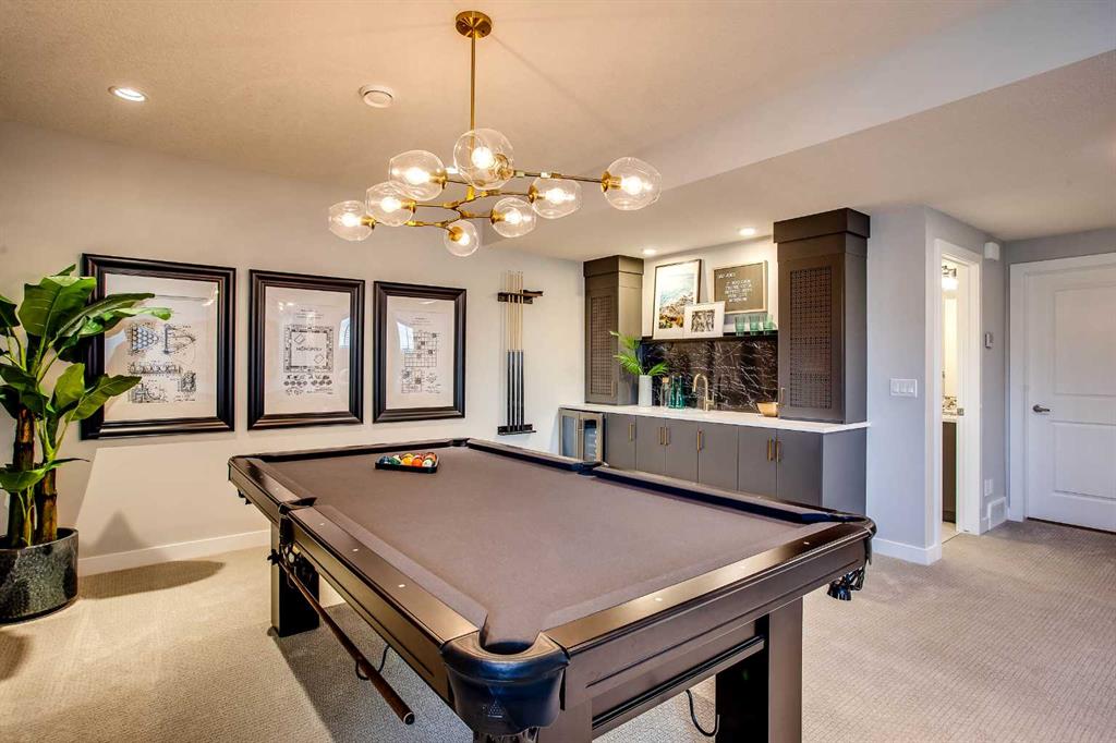 Exquisite Former Show Home with Majestic Mountain Views. Welcome to the “Hennessy III” by Calbridge Homes, an award-winning former show home where sophisticated designer upgrades meet an unparalleled lifestyle location. Backing onto a serene green space with a coveted west-facing backyard, this residence offers a front row seat to breathtaking Rocky Mountain sunsets. The interior is bathed in natural light, highlighted by wide-plank hardwood floors and custom designer lighting throughout an open-concept layout masterfully planned for both intimate family life and grand-scale entertaining. The gourmet chef’s kitchen serves as the heart of the home, featuring full-height cabinetry, a massive breakfast bar island, premium stainless steel appliances with a gas range, and a substantial butler’s pantry for seamless organization. In the grand great room, soaring vaulted ceilings with wood beams and a tiled fireplace create a sense of scale, while a signature wall of windows perfectly frames the outdoor oasis. For those seeking a quiet workspace, elegant French doors lead to a dedicated den perfect for a sophisticated home office. The upper level is a true sanctuary of comfort, led by a primary retreat featuring a massive walk-in closet and a spa-inspired ensuite with dual vanities, an oversized shower, and a deep soaker tub. A versatile central bonus room offers the ideal loft space for movie nights, complemented by three additional bright bedrooms, a full family bathroom, and a conveniently located laundry room. The professionally finished basement significantly extends the living space, offering a massive recreation area and a fully equipped wet bar with a beverage fridge. A large fifth bedroom and full bathroom provide a private suite for guests or older children. Complete with a generous triple-car garage, this home is close to the incredible walking paths that lead you throughout the parks and playgrounds this community has to offer. Enjoy unbeatable convenience being just minutes from the C-Train, YMCA, community center, and a vibrant array of local shops and dining. Experience the pinnacle of craftsmanship and scenery in this rare property. Call today for your personal viewing.
