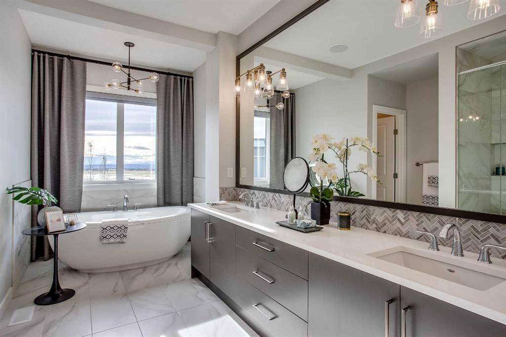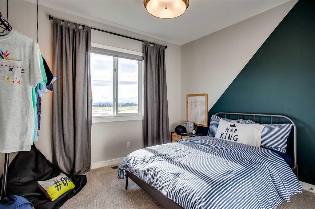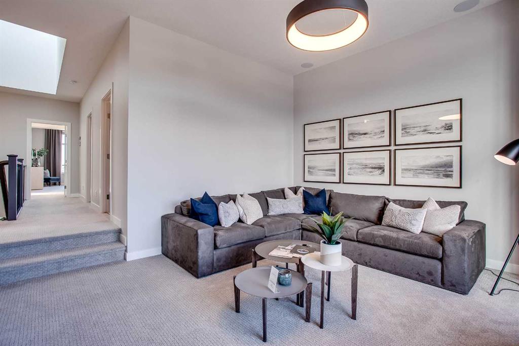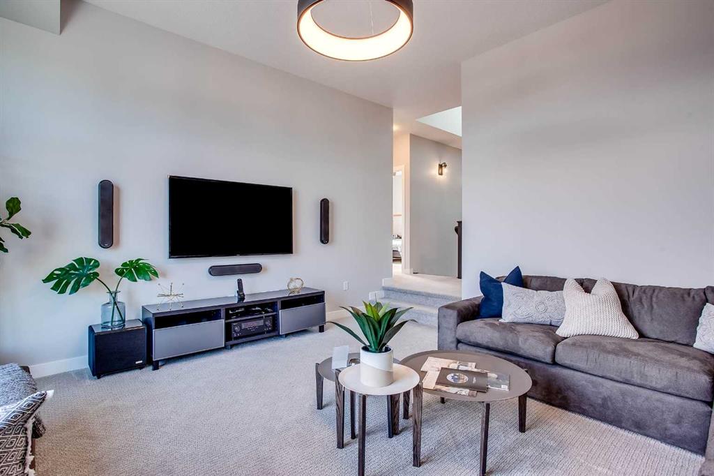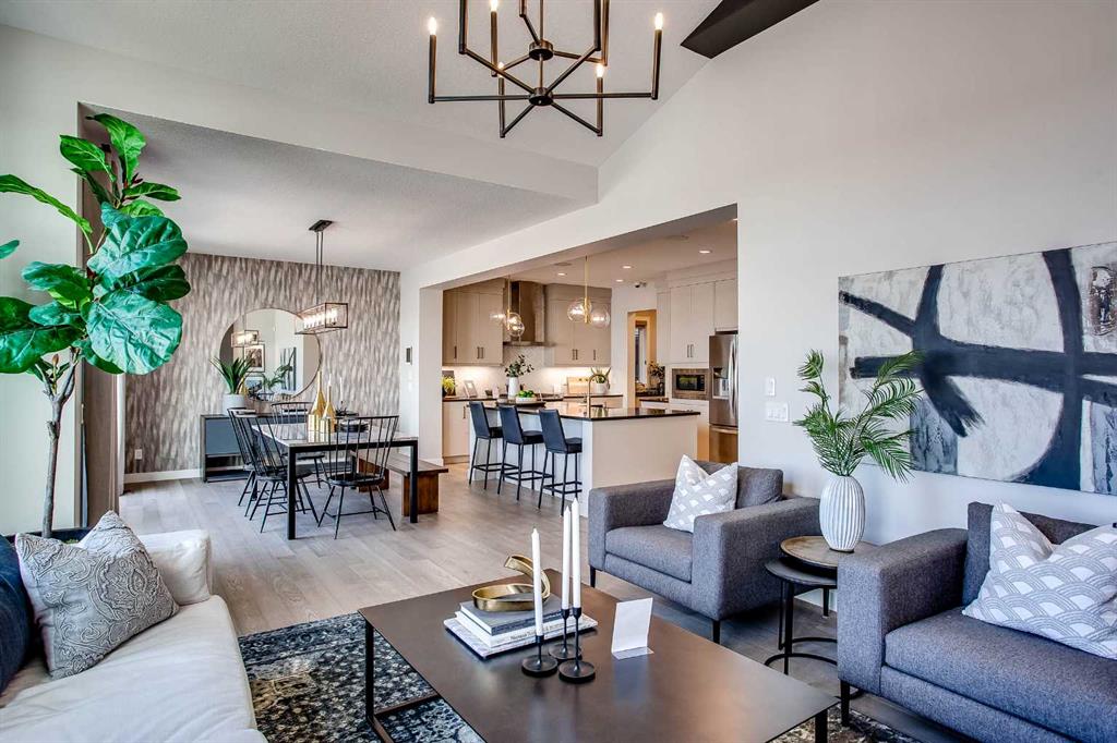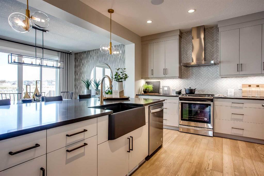 Exquisite Former Show Home with Majestic Mountain Views. Welcome to the “Hennessy III” by Calbridge Homes, an award-winning former show home where sophisticated designer upgrades meet an unparalleled lifestyle location. Backing onto a serene green space with a coveted west-facing backyard, this residence offers a front row seat to breathtaking Rocky Mountain sunsets. The interior is bathed in natural light, highlighted by wide-plank hardwood floors and custom designer lighting throughout an open-concept layout masterfully planned for both intimate family life and grand-scale entertaining. The gourmet chef’s kitchen serves as the heart of the home, featuring full-height cabinetry, a massive breakfast bar island, premium stainless steel appliances with a gas range, and a substantial butler’s pantry for seamless organization. In the grand great room, soaring vaulted ceilings with wood beams and a tiled fireplace create a sense of scale, while a signature wall of windows perfectly frames the outdoor oasis. For those seeking a quiet workspace, elegant French doors lead to a dedicated den perfect for a sophisticated home office. The upper level is a true sanctuary of comfort, led by a primary retreat featuring a massive walk-in closet and a spa-inspired ensuite with dual vanities, an oversized shower, and a deep soaker tub. A versatile central bonus room offers the ideal loft space for movie nights, complemented by three additional bright bedrooms, a full family bathroom, and a conveniently located laundry room. The professionally finished basement significantly extends the living space, offering a massive recreation area and a fully equipped wet bar with a beverage fridge. A large fifth bedroom and full bathroom provide a private suite for guests or older children. Complete with a generous triple-car garage, this home is close to the incredible walking paths that lead you throughout the parks and playgrounds this community has to offer. Enjoy unbeatable convenience being just minutes from the C-Train, YMCA, community center, and a vibrant array of local shops and dining. Experience the pinnacle of craftsmanship and scenery in this rare property. Call today for your personal viewing.