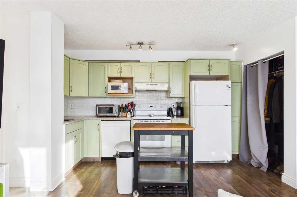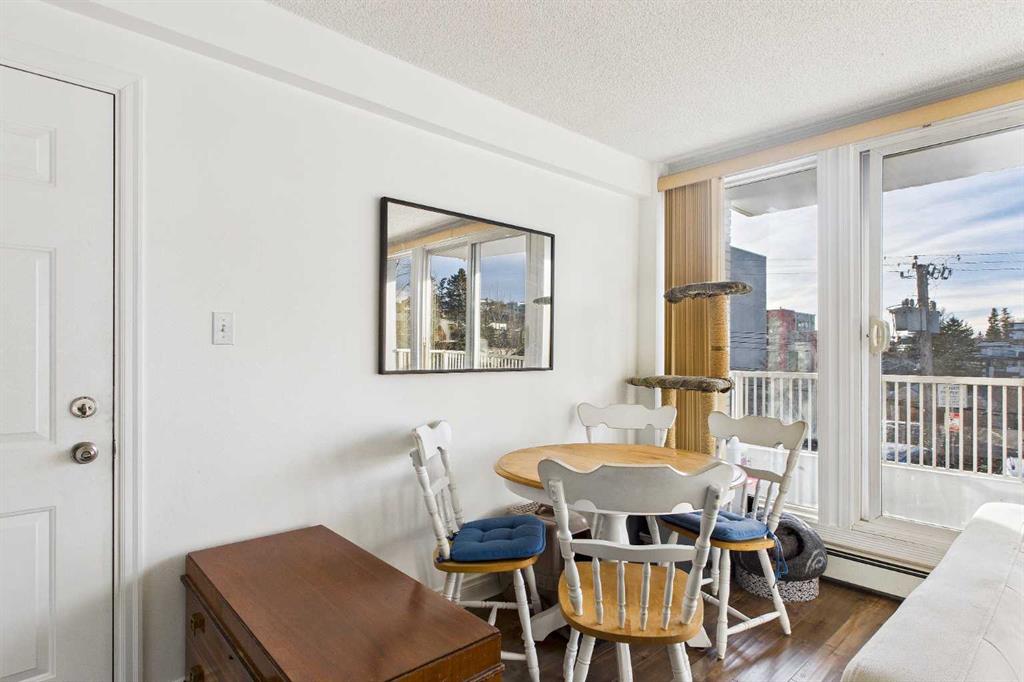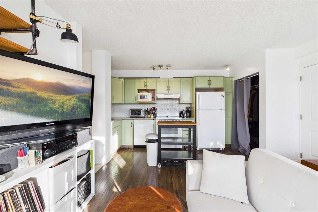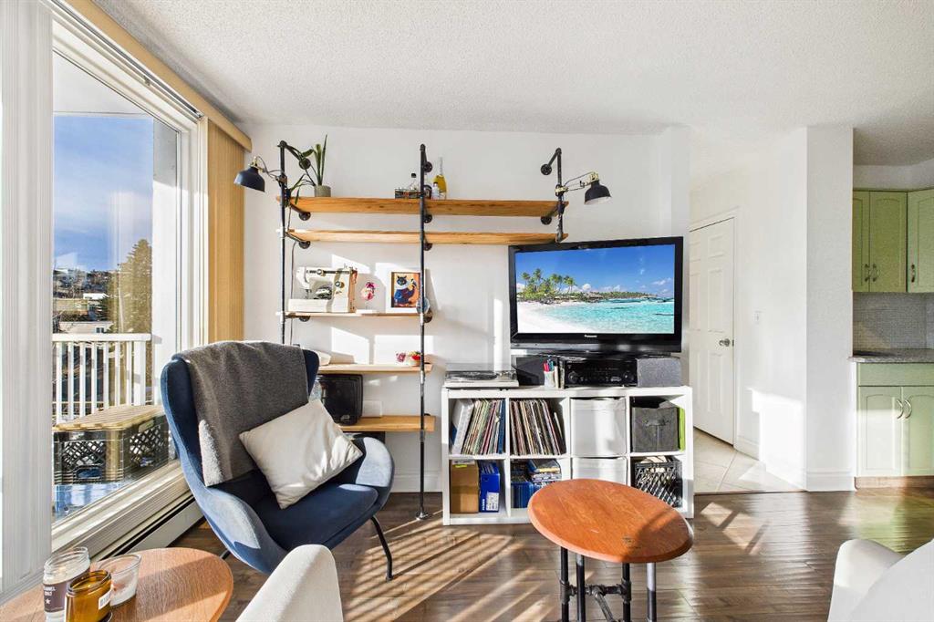 Welcome to the “AURORA GARDENS “ this adorable one-bedroom condo perfectly situated just steps from the vibrant shops, cafés, and restaurants of 17th Avenue. This inviting home blends comfort and convenience and affordable condo fees making it ideal for first-time buyers, professionals, or anyone looking to enjoy an urban lifestyle without sacrificing coziness. Inside, the thoughtfully designed layout offers a bright and functional living space featuring hand-scraped hardwood floors, a trendy yet spacious kitchen with mint green cabinets, lots of counter space, updated backsplash, a movable island and additional storage across the top of the cabinets if needed. The flexibility of the open concept layout flows seamlessly together offering a cozy living room and still room for a dining table if desired. The whole main living space is accented with a large south-facing balcony, where you can soak up sunshine all day long and perfect for a morning coffee or relaxing evenings. Large windows flood the space with natural light, creating a warm and welcoming atmosphere throughout. Adding to the convenience, this home comes with in-suite laundry for everyday ease, a spacious primary bedroom and 4 piece bathroom. Additional highlights include a separate storage and a dedicated parking stall eliminating the stress of inner-city parking, and a well-maintained building in a highly desirable location. With transit, parks, nightlife, and daily amenities just moments away, this charming condo offers the best of city living in a space that truly feels like home. Most pets are allowed with board approval, however dogs are not allowed.