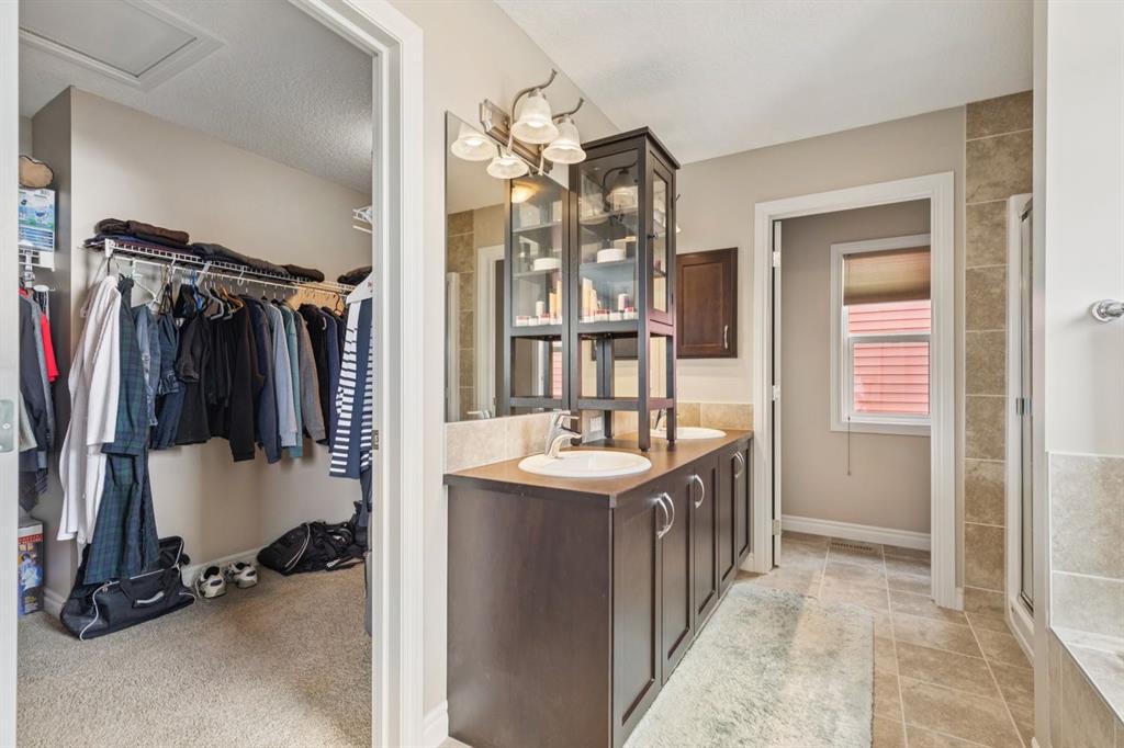Welcome to #7 Cooperstown Place SW—an exceptional, meticulously maintained residence in the highly sought-after community of Coopers Crossing. Proudly offered by the original owners, this sophisticated 2,538 Sq Ft home blends timeless design with thoughtful, high-end upgrades, all set on a quiet, low-traffic street with a desirable sunny south-facing backyard.From the moment you arrive, the stunning stucco and stone exterior and undeniable curb appeal set the tone. Inside, you’re greeted by an open foyer with an elegant, inviting staircase and 9’ ceilings that carry throughout the main level. The bright, open-concept layout is flooded with natural light from an abundance of windows, creating a warm and welcoming atmosphere.The heart of the home is the massive chef-inspired kitchen, featuring quartz countertops, extensive cabinetry, and generous prep space—perfect for everyday living and entertaining alike. High-end stainless-steel appliances, including a double induction oven, elevate the space, while the adjacent dining area comfortably accommodates a growing family. The living room showcases a beautiful stone surround fireplace, adding both warmth and character. A versatile main floor office/den/library with double French doors offers the perfect work-from-home setup or quiet retreat. Upstairs, you’ll find a spacious and sunlit bonus room, convenient upper-level laundry, and three generously sized bedrooms. The primary suite is a true sanctuary, complete with a walk-in closet and a luxurious 5-piece en suite featuring a barn door entrance and quality finishes throughout. This home is equipped for comfort year-round with two furnaces and dual A/C units, along with a water softener and newer hot water tank. Custom built-ins and upgraded millwork throughout further highlight the attention to detail. Step outside to your private backyard oasis—fully fenced and beautifully landscaped with mature trees along the rear for added privacy. Enjoy summer evenings on the two-tier deck with pergola, privacy walls, and gemstone exterior LED soffit lighting for ambiance. A custom storage shed and a concrete walkway running from front to back add both function and convenience. The attached double garage features epoxy flooring and comfortably accommodates a pickup truck & more. Every aspect of this home reflects pride of ownership—it is exceptionally clean, well-cared for, and truly move-in ready. Located within walking distance to schools, parks, pathways, and amenities, with easy access out of town, this is a rare opportunity to own a high-end home in one of Airdrie’s most prestigious communities. A perfect blend of luxury, functionality, and location—this home is sure to impress.