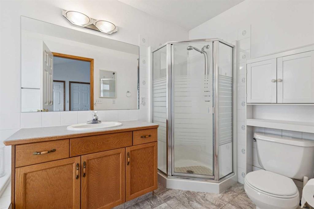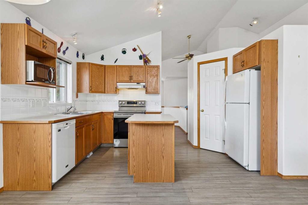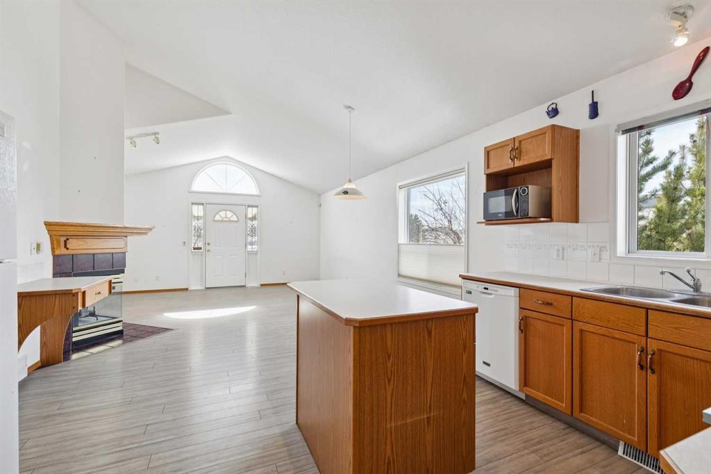 Welcome to this inviting, bright bilevel home offering a spacious living area, open kitchen and a dining room perfect for family meals and entertaining guests. This home is nestled between beautiful greenspace in front of and behind the property. The main floor features two comfortable bedrooms, including a primary bedroom with its own ensuite, plus an additional full bathroom. Large windows fill the main floor with natural light, highlighting the open living area with its cozy fireplace. Off the living room, a covered patio overlooks the greenspace and the large yard filled with mature fruit trees, creating a peaceful setting that’s hard to find. For added peace of mind, the poly b plumbing has been fully replaced.