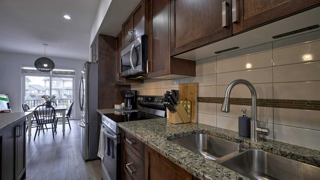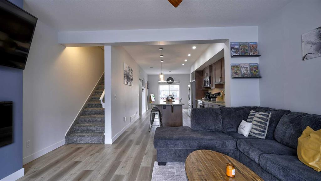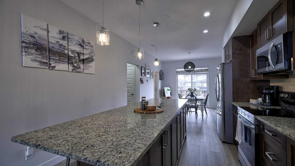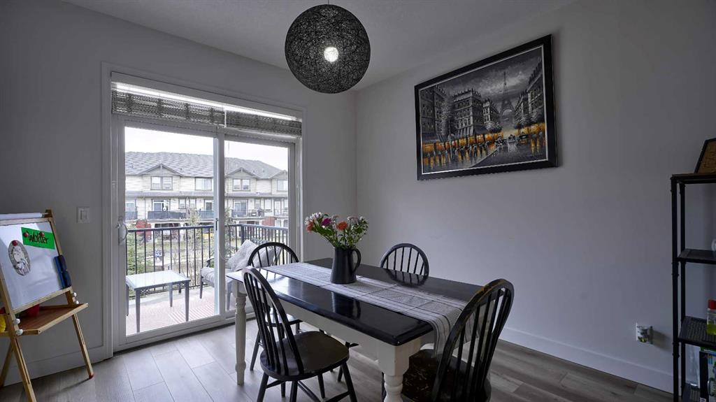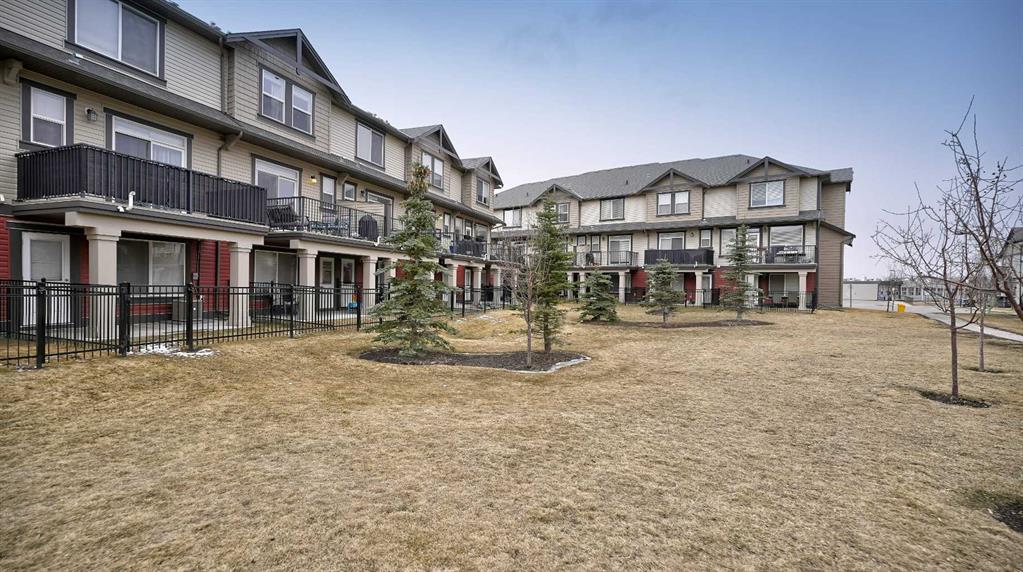 Low maintenance lifestyle living here, w/ quick access to outdoor active living. Entrance way spacious and plus amazing thick newer carpet starting on the stairs. Main floor is perfect for entertaining, being open concept, w/ an abundance of natural lighting. Cozy living room w/ large windows and electric fireplace plus brand new ceiling fan. Massive eat up island, space for all to gather around, w/ granite countertops. Modern pendulum lighting & newer luxury vinyl planking throughout this level. Convenient powder room. Dining room has plenty of space for entertaining, & an unobstructed view of the courtyard. Deck is good sized for enjoying those summer evenings. Laundry facilities are favorably located on the upper level. Master ensuite has double sinks, oversized walk in shower & walk in closet. Carpeting that is throughout is newer, lush and feels amazing on your feet. Tandem parking in this garage, plenty of storage space, plus parking on the driveway. Access to the small fenced yard from the garage. Heron’s Crossing Elementary School is just a walk across the street. 60 acres of protected environmental reserve, parks, ponds, playground, bridge, plus miles of trails along Nose Creek are a stones throw away.