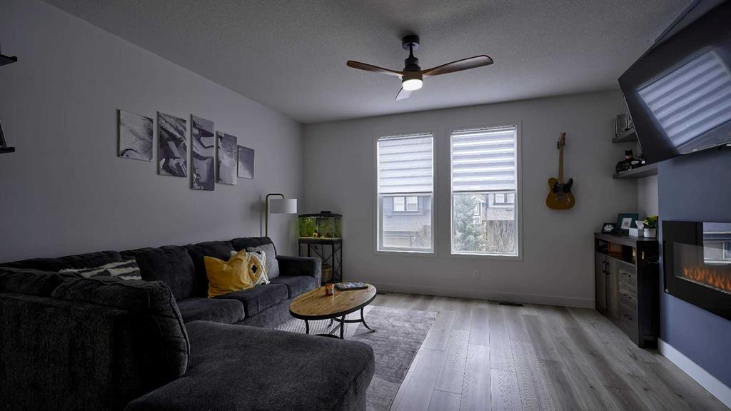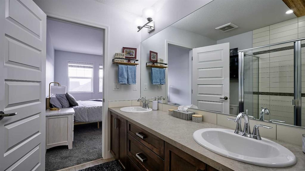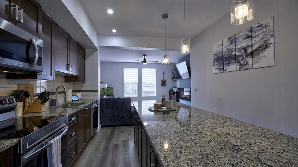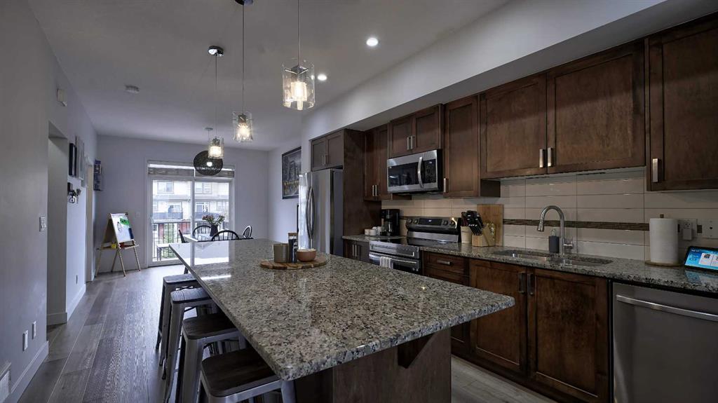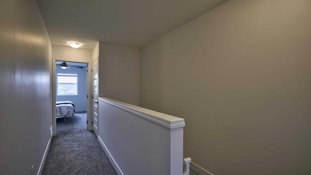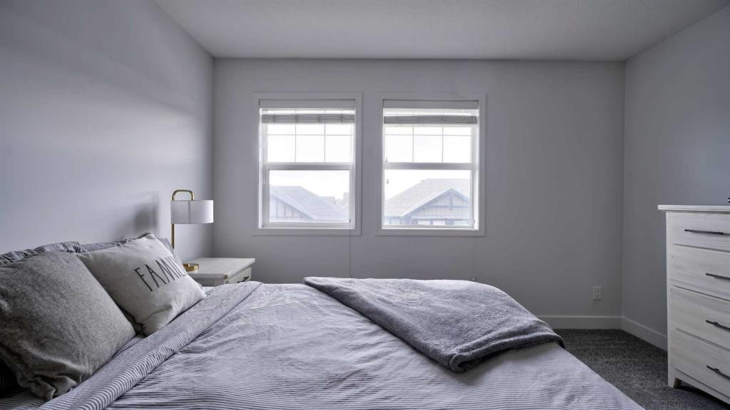 Low maintenance lifestyle living here, w/ quick access to outdoor active living. Entrance way spacious and plus amazing thick newer carpet starting on the stairs. Main floor is perfect for entertaining, being open concept, w/ an abundance of natural lighting. Cozy living room w/ large windows and electric fireplace plus brand new ceiling fan. Massive eat up island, space for all to gather around, w/ granite countertops. Modern pendulum lighting & newer luxury vinyl planking throughout this level. Convenient powder room. Dining room has plenty of space for entertaining, & an unobstructed view of the courtyard. Deck is good sized for enjoying those summer evenings. Laundry facilities are favorably located on the upper level. Master ensuite has double sinks, oversized walk in shower & walk in closet. Carpeting that is throughout is newer, lush and feels amazing on your feet. Tandem parking in this garage, plenty of storage space, plus parking on the driveway. Access to the small fenced yard from the garage. Heron’s Crossing Elementary School is just a walk across the street. 60 acres of protected environmental reserve, parks, ponds, playground, bridge, plus miles of trails along Nose Creek are a stones throw away.