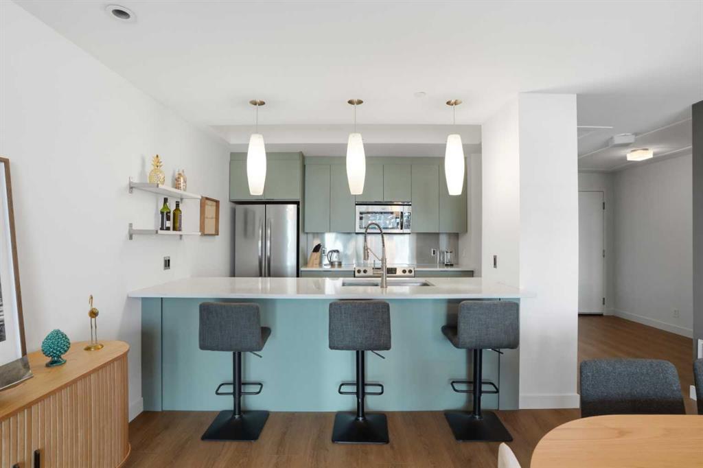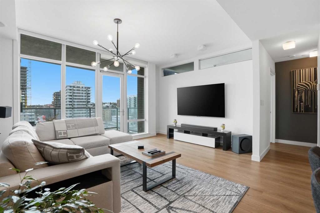 The bright open concept layout features 9 foot ceilings and dramatic floor to ceiling windows, allowing natural light to pour into the living space while showcasing unobstructed south facing views. The beautifully updated kitchen is designed for both everyday living and entertaining, offering quartz countertops, stainless steel appliances, full height cabinetry, a wine cooler, garburator, and generous preparation space.