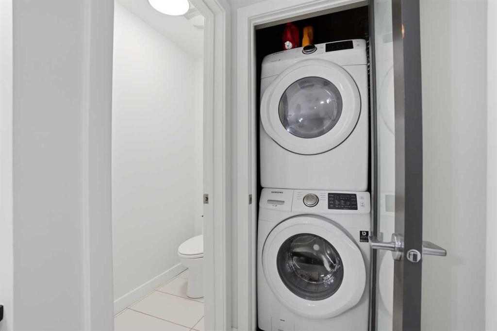 The spacious primary bedroom easily accommodates a king sized bed with nightstands and a large television, while the walk through closet leads to an impressive 5 piece spa inspired ensuite. The ensuite is one of the largest in the building and features dual sinks, a deep soaker tub, and a luxurious steam shower, creating a true at home retreat. For added convenience, the front loading washer and dryer are discreetly located within the ensuite. A separate guest bathroom provides additional comfort and privacy for visitors.