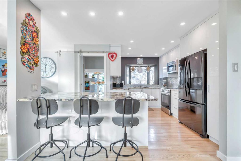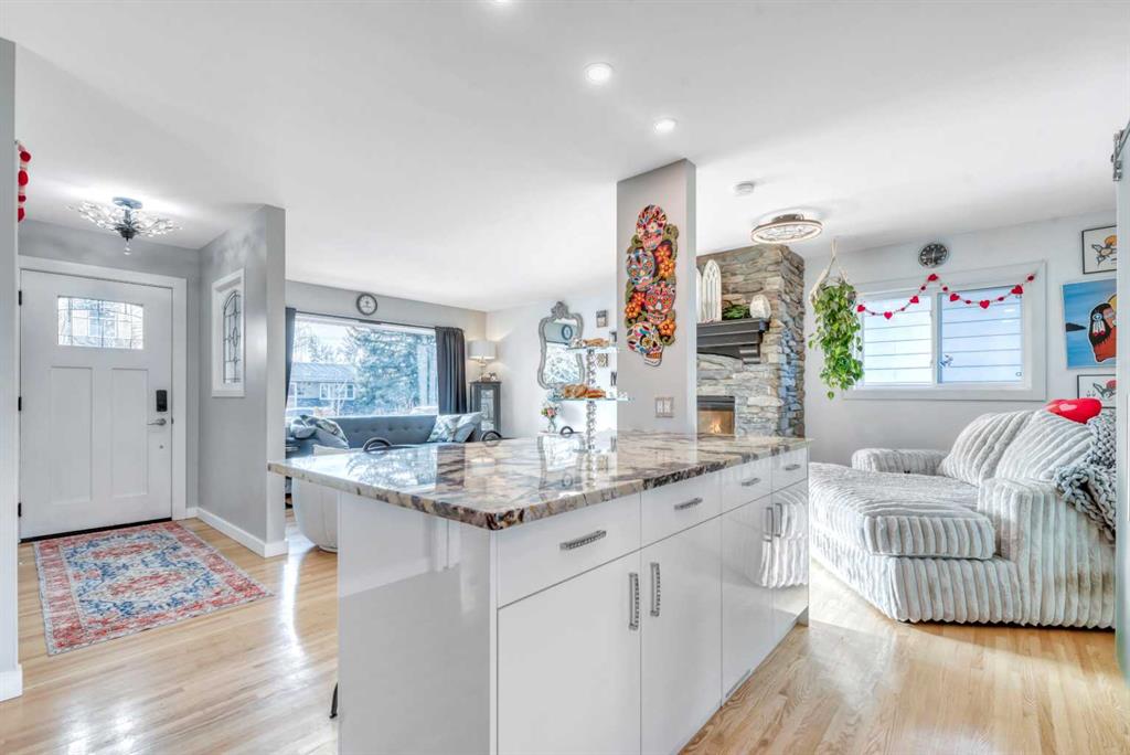 WOW! Take a look at this one-of-a-kind bungalow! This sprawling, mint-condition home is situated on a generous 52.5’ x 110’ lot, on a quiet cul-de-sac, in the sought-after community of Acadia, and has been impeccably renovated-from-top-to-bottom! Boasting over 2,550 square feet of fully developed living space with 5 bedrooms + den, 2 spa-inspired bathrooms, fully remodelled kitchen, bright living and dining room spaces, expansive sunroom (with floor-to-ceiling windows, skylights, vaulted ceiling, and heated floors), basement recreation room, and a ultra-rare double heated attached garage, this home is sure to impress! The home is thoughtfully oriented with a sunny south-facing front yard and a super-private north-facing backyard that is extensively landscaped with mature trees, gardens, a tranquil pond, patio area, and natural gas BBQ hookup—making it the ultimate outdoor retreat. Recent upgrades here include a high-efficiency furnace (2021), central air conditioner (2021), tankless water-on-demand system (2025), sump pump installation (2025), boiler system for the heated sunroom floors (2023), natural gas garage heater, newer asphalt shingles, newer skylight glass, oversized Lux vinyl windows (2025, in the main floor bedrooms and living room), two wood-burning fireplaces including a custom-built Rumford Fireplace (2023), premium Splendour Gold granite countertops (2021, kitchen/bathroom), all new appliances (kitchen/laundry, 2021-2025), main level hardwood floors (continuation and refinishing, 2022–2024), lower level luxury vinyl plank flooring (2023), and a central vacuum system. Pride of ownership is evident here! Homes seldom sell in this cul-de-sac! Don’t miss out – call now!
