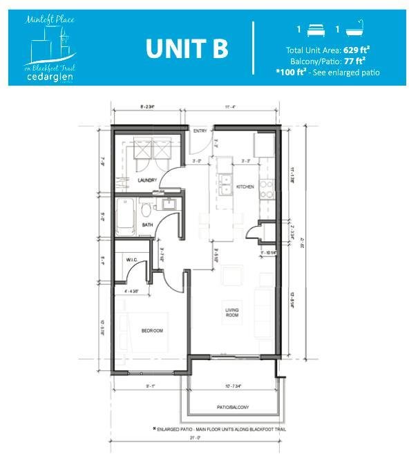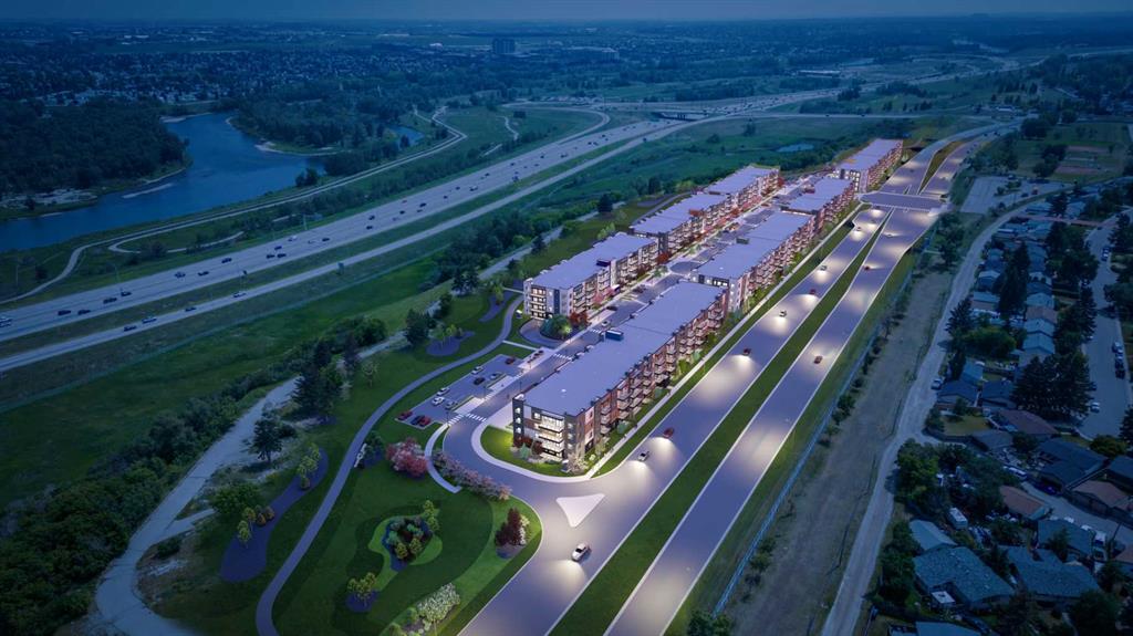 INTRODUCING MINTOFT PLACE ON BLACKFOOT TRAIL, IN BEAUTIFUL CENTRAL SE, CALGARY. BUILT BY CEDARGLEN LIVING, WINNER OF THE Customer Insight BUILDER OF CHOICE AWARD, 6 YEARS RUNNING! BRAND NEW “B” unit with high-spec features. You will feel right at home in this well thought-out, 575 RMS sq.ft. (629 sq.ft. builder size). 1 bed, 1 bath home with open plan, 9′ ceilings, LVP flooring throughout common areas, carpets in the bedrooms and closets, Low E triple glazed windows, BBQ gas line on the patio, Fresh Air System (ERV), and so much more. The kitchen is spectacular with full height cabinets, quartz counters, undermount sink, rough-in water line to the fridge and S/S appliances. The island is extensive with built in flush breakfast bar, and built in dining area, which transitions into the living area, perfect for entertaining. The spacious bedroom has a large bright window (triple pane windows) and sizeable closet walk-in closet. Right beside your bedroom is a 4pc bath with quartz counters, and undermount sink. Nearby, the spacious laundry/storage room is a must see (washer & dryer included). Highlights include: Hardie board siding, designer lighting package, sound reducing membrane to reduce sound transmission between floors, clear glass railing to balconies and 1 titled underground parking stall included (storage lockers available for purchase). A once in a lifetime community off Blackfoot Trail and Southland Drive in Calgary. Nature lovers will appreciate that Sue Higgins park and Carburn Park are a short stroll away. Deerfoot Meadows shopping centre, anchored by Costco, Ikea and Walmart, along with many other amazing shops and restaurants are located in very close proximity. PET FRIENDLY COMPLEX, PRE-CONSTRUCTION OPPORTUNITY, PURCHASER CAN STILL MAKE SELECTIONS, and PHOTOS ARE OF A DIFFERENT SHOW SUITE FOR REFERENCE ONLY, FINISHING’S/PLAN WILL DIFFER. ESTIMATED COMPLETION RANGE IS APRIL 2027-DECEMBER 2028. VISIT THE SHOW SUITE OR CALL TODAY FOR MORE INFO.
