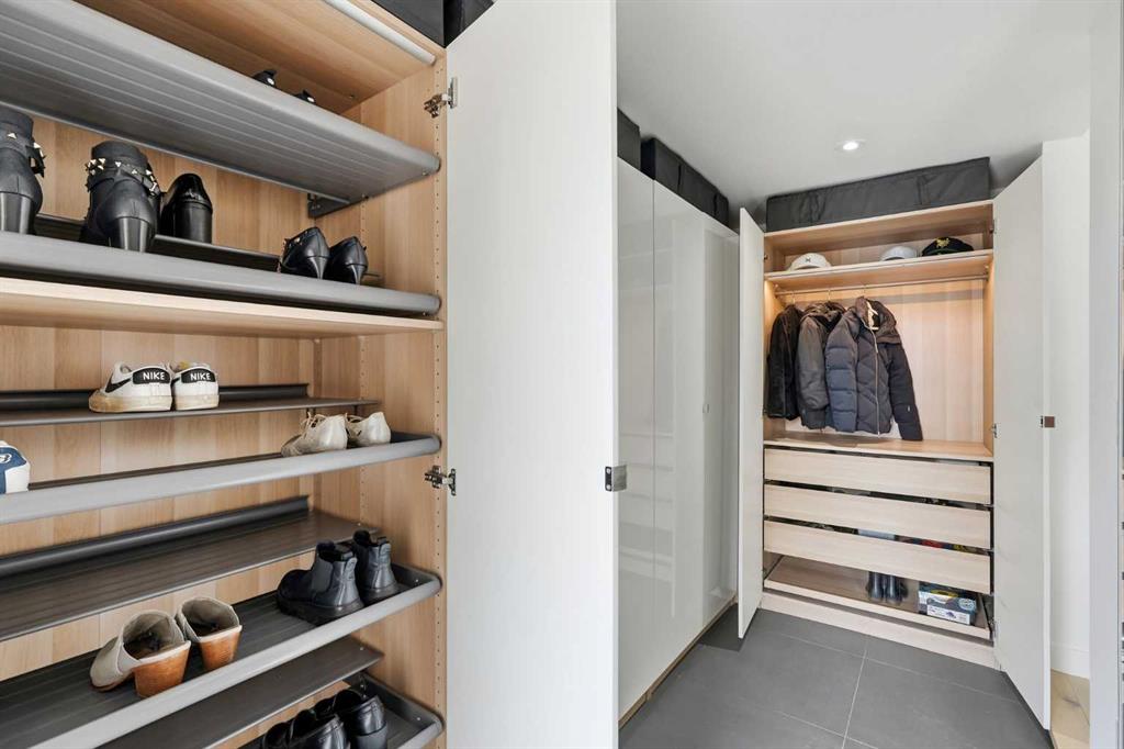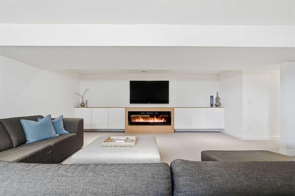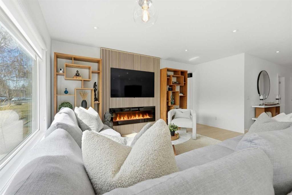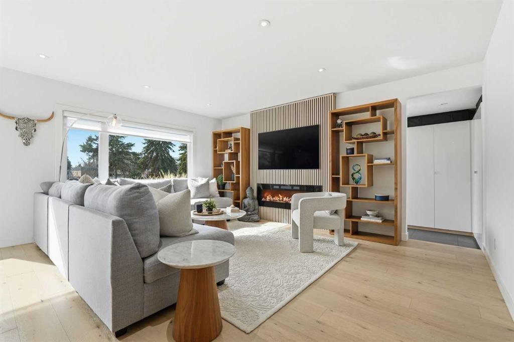 The living room is anchored by a striking feature wall with electric fireplace, adding warmth and sophistication to the space. A well-designed front mudroom with custom built-in closets and organizers ensures effortless day-to-day living – Custom closets are added throughout the home for storage solutions, including in most of the bedrooms.
