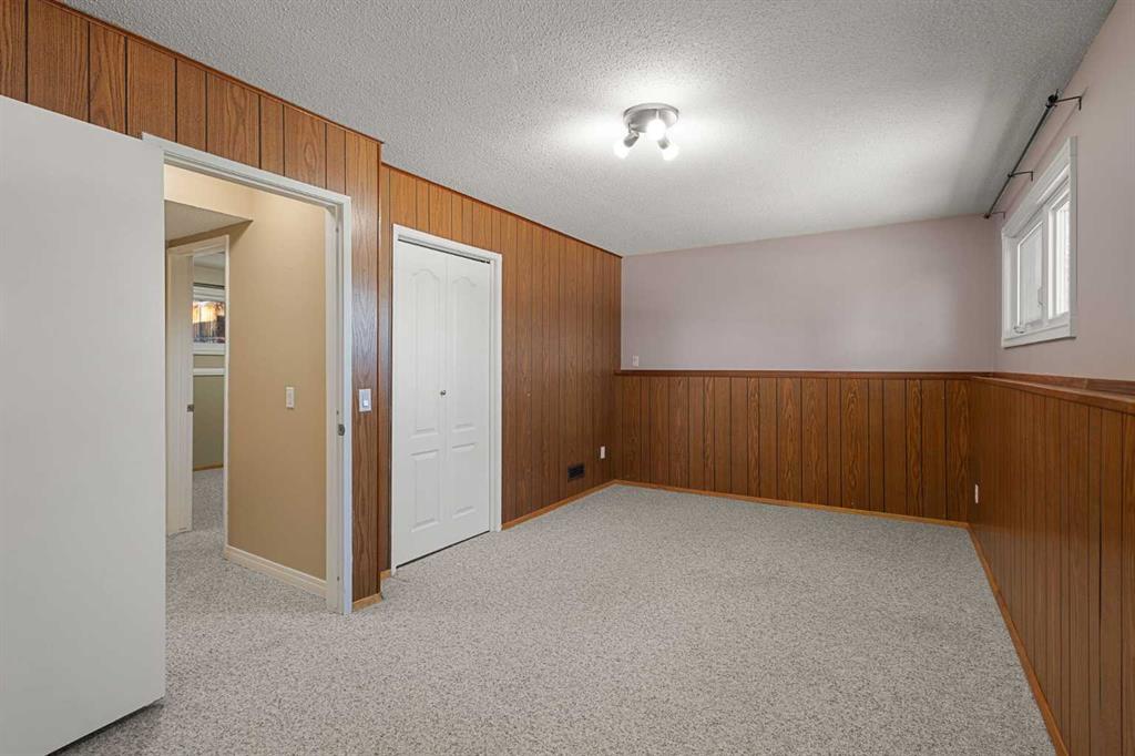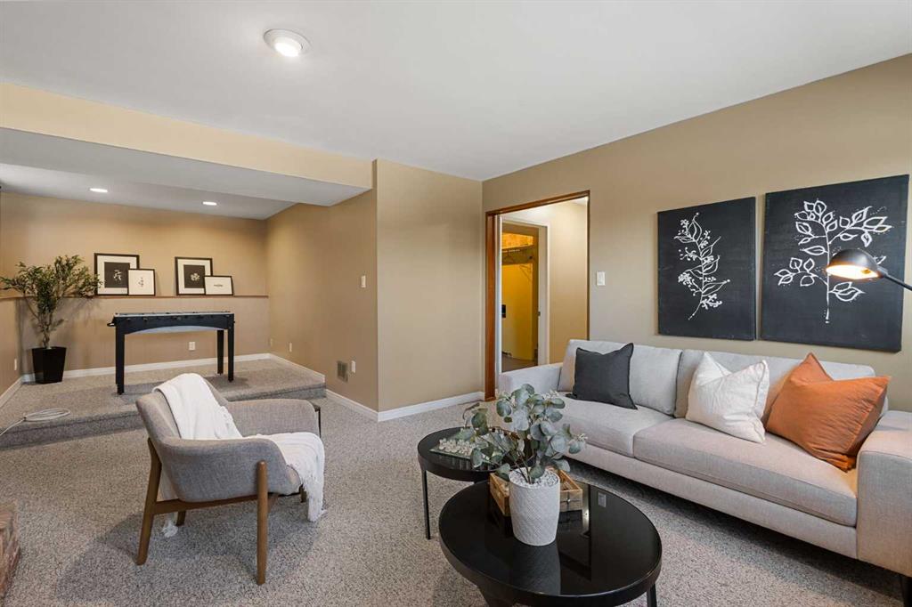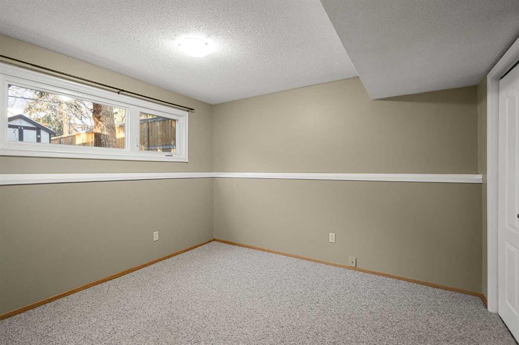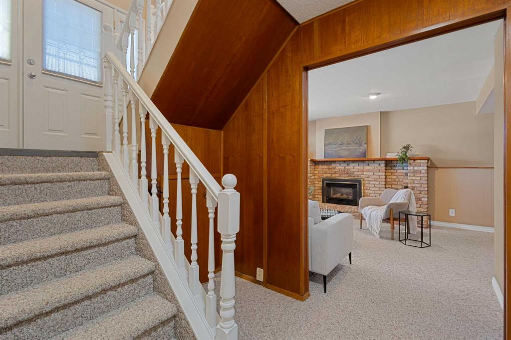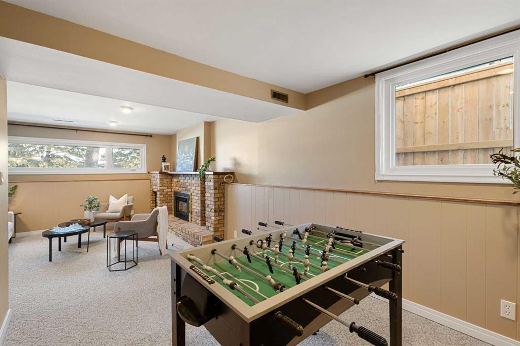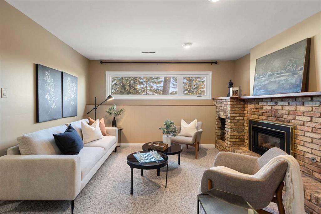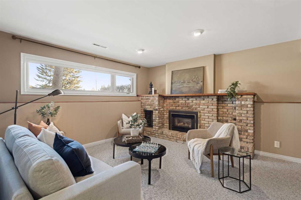 The fully developed basement features a large family room with a play or office area and nice windows. A gas fireplace is set into a striking brick feature wall with ample display space for family photos. Two additional bedrooms—one generously sized—a full bathroom with a window, under-the-stairs storage, and a laundry room complete the lower level.