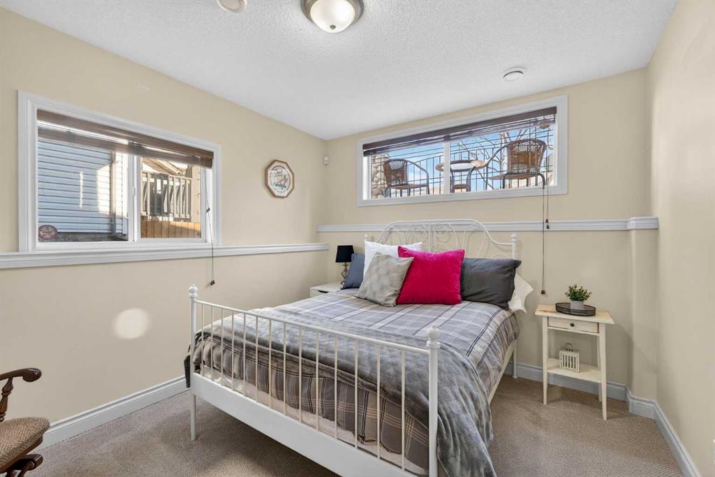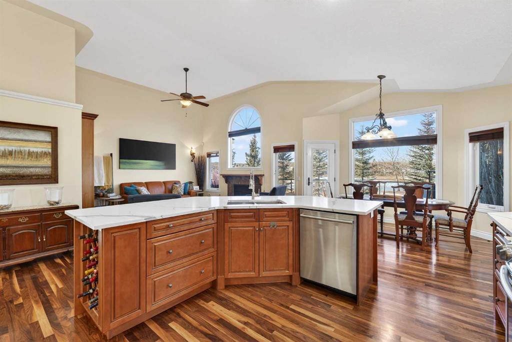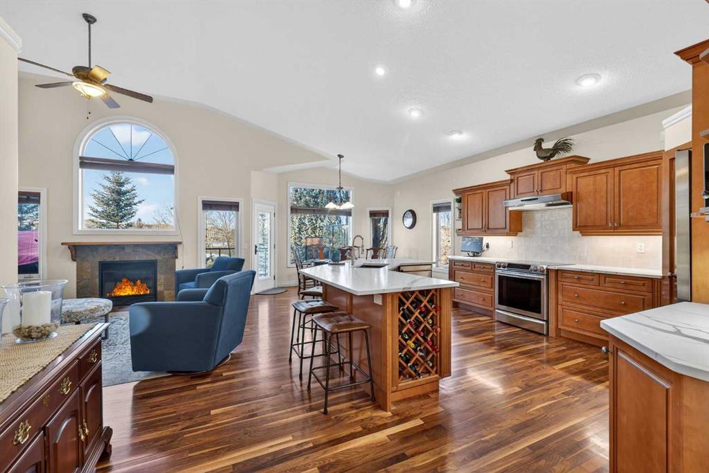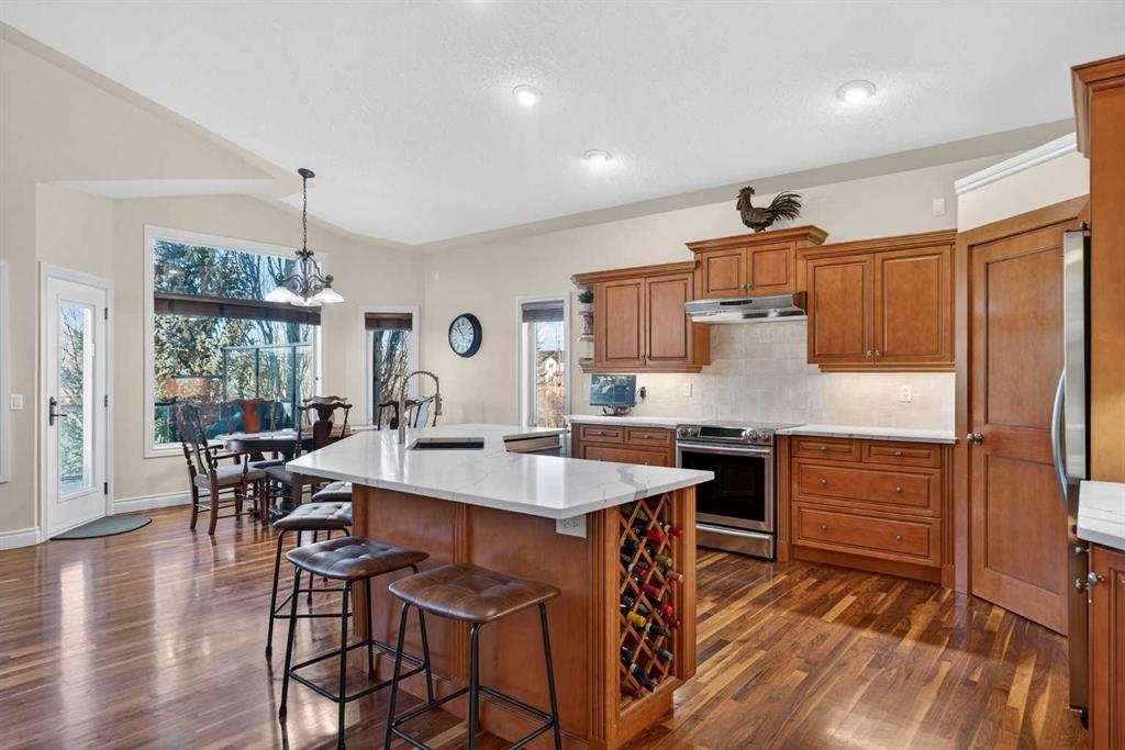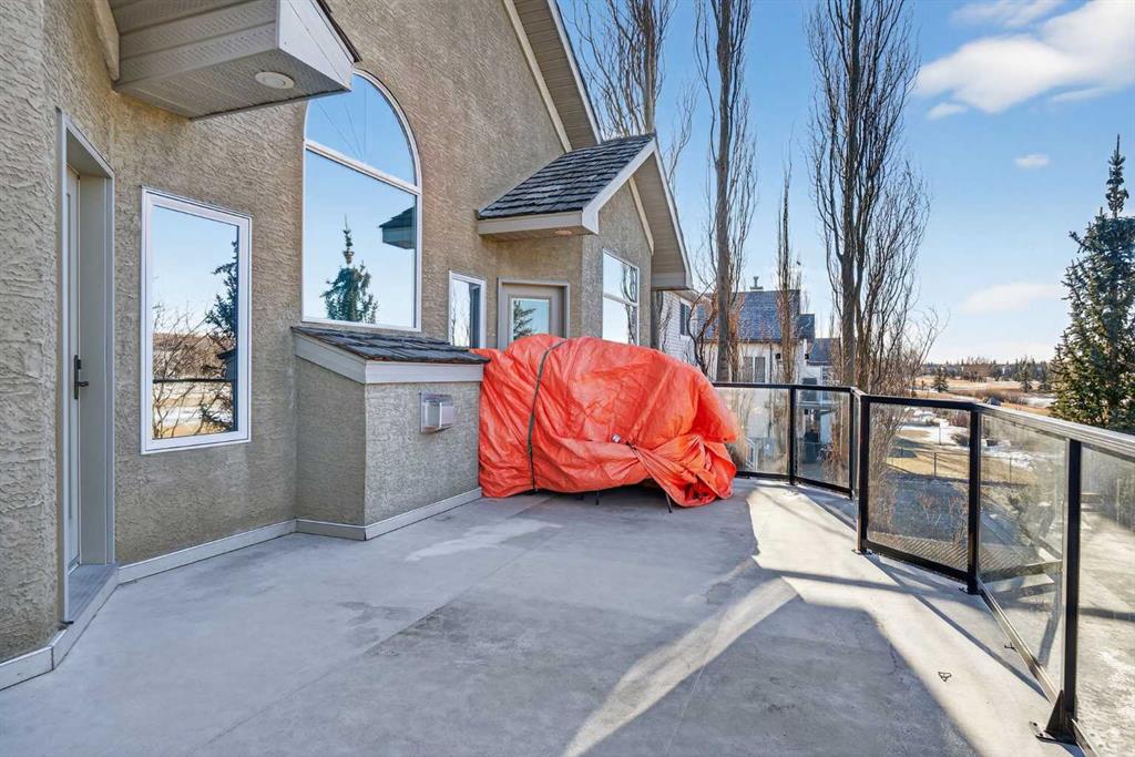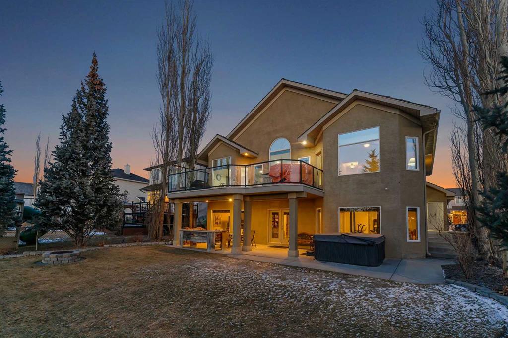 Open House – Sunday, Jan 25th from 12 – 2 pm & Sunday February 1st from 1-3 PM. Incredible opportunity to own this gorgeous walkout home with a triple car garage backing west onto Woodside Golf Course. The inside of this home is just as beautiful as the exterior with massive windows, vaulted ceilings and rich walnut hardwood floors that highlights the exceptional space. The kitchen has been recently updated with a modern backsplash, stone counters and a central island. Be prepared to host family and friends as this open concept design creates a natural space for entertaining. Off the dining space, a door leads to a full-width deck with two natural gas outlets for a BBQ and a heater. Back inside, the spacious living room overlooks the golf course and includes a cozy gas fireplace. The primary suite is a stunning oasis with gorgeous views, plenty of space, a walk-in closet and an elegant fully updated ensuite with dual sinks and a tiled shower. A second bedroom on this level and a 4 piece bath add versatility. The walkout basement is fully finished with a large rec area for movie nights with room for a home gym too. Two additional bedrooms and a 3 piece bath complete this level. Parking will never be an issue with a triple wide driveway and a three bay HEATED garage (29’11” x 24’7″) with a mezzanine and built in storage. The yard has been professionally landscaped with underground sprinklers. Watch the golfers and enjoy the sunsets from your walkout deck or from your hot tub on the patio. This home has undergone many updates including central air conditioning, two new furnaces (2023), hot water tank (2024), new washer and dryer (2025), garage doors (2023), re-modelled kitchen and bathroom (2023), solar shield on most east and west windows, water softener, built in shelving throughout and roof maintenance with 5 year warranty. This is a central Airdrie location, close to the golf course, shopping and schools.