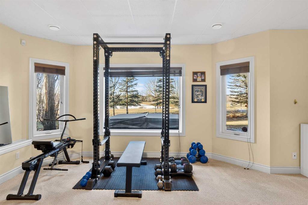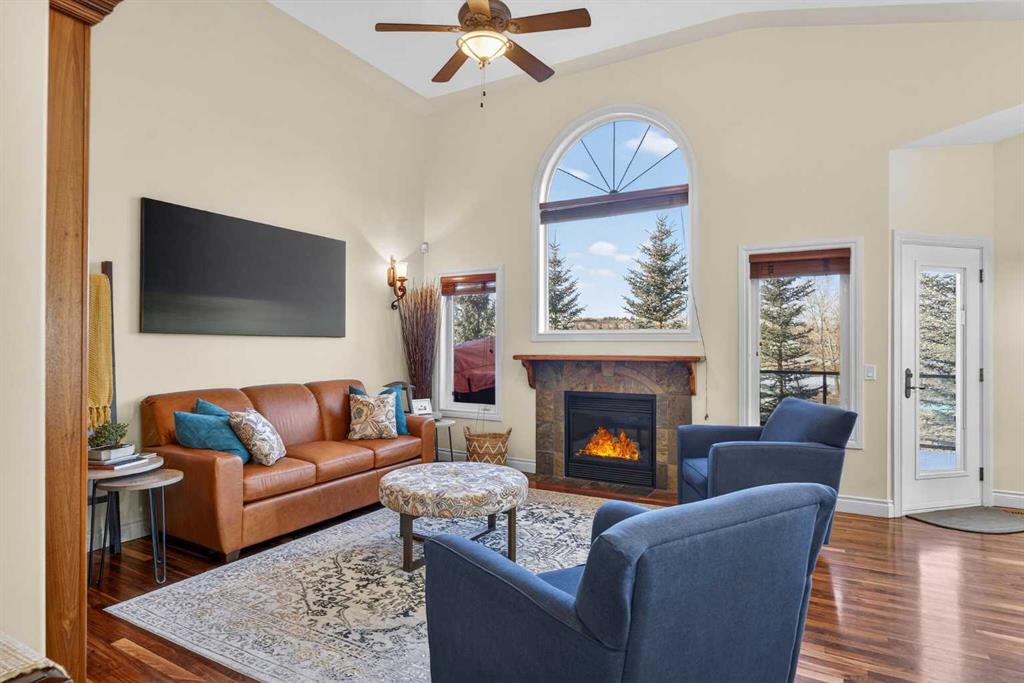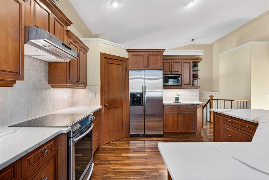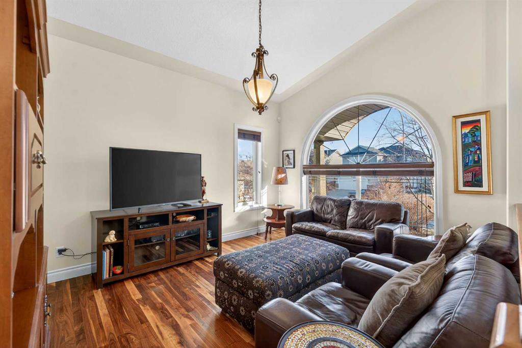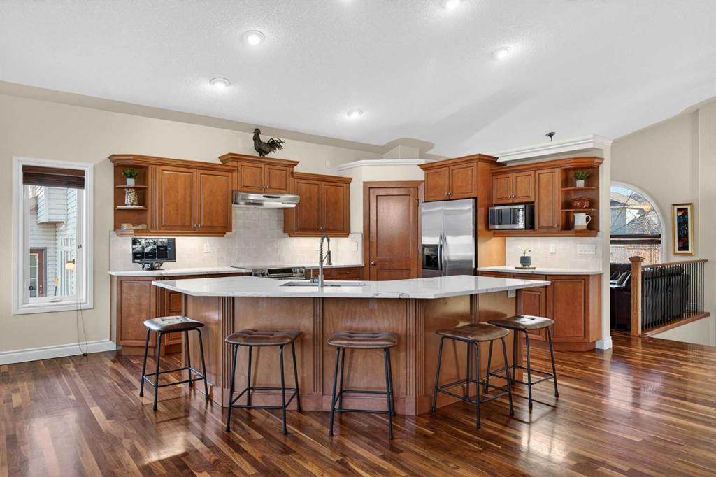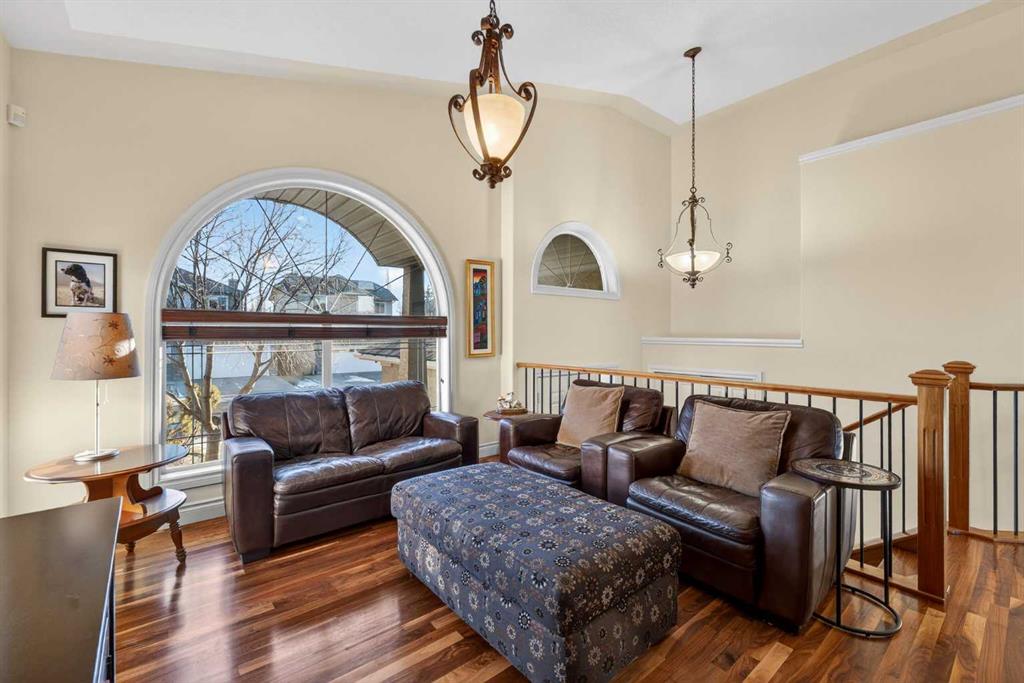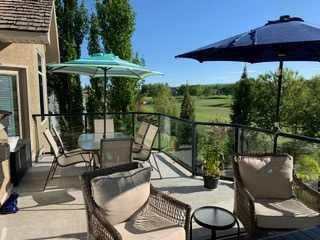 Open House – Sunday, Jan 25th from 12 – 2 pm & Sunday February 1st from 1-3 PM. Incredible opportunity to own this gorgeous walkout home with a triple car garage backing west onto Woodside Golf Course. The inside of this home is just as beautiful as the exterior with massive windows, vaulted ceilings and rich walnut hardwood floors that highlights the exceptional space. The kitchen has been recently updated with a modern backsplash, stone counters and a central island. Be prepared to host family and friends as this open concept design creates a natural space for entertaining. Off the dining space, a door leads to a full-width deck with two natural gas outlets for a BBQ and a heater. Back inside, the spacious living room overlooks the golf course and includes a cozy gas fireplace. The primary suite is a stunning oasis with gorgeous views, plenty of space, a walk-in closet and an elegant fully updated ensuite with dual sinks and a tiled shower. A second bedroom on this level and a 4 piece bath add versatility. The walkout basement is fully finished with a large rec area for movie nights with room for a home gym too. Two additional bedrooms and a 3 piece bath complete this level. Parking will never be an issue with a triple wide driveway and a three bay HEATED garage (29’11” x 24’7″) with a mezzanine and built in storage. The yard has been professionally landscaped with underground sprinklers. Watch the golfers and enjoy the sunsets from your walkout deck or from your hot tub on the patio. This home has undergone many updates including central air conditioning, two new furnaces (2023), hot water tank (2024), new washer and dryer (2025), garage doors (2023), re-modelled kitchen and bathroom (2023), solar shield on most east and west windows, water softener, built in shelving throughout and roof maintenance with 5 year warranty. This is a central Airdrie location, close to the golf course, shopping and schools.