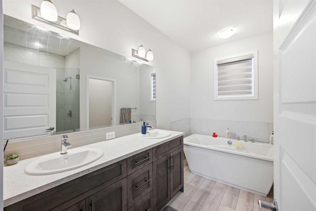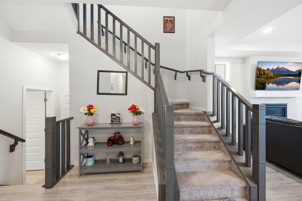 Upstairs, you’ll find a generous bonus room with an electric fireplace, ideal for family gatherings or a cozy retreat. The luxurious primary bedroom features a 5-piece ensuite with double sinks, a custom standing shower, and elegant finishes. Additional highlights include upper-floor laundry, upgraded oak railings, and well-sized secondary bedrooms.