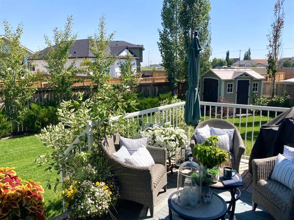 Welcome to this beautifully custom-designed, immaculate two-storey home in the heart of Hampton Hills Estates — where character, charm and pride of ownership shine throughout. This thoughtfully designed 3-bedroom home offers an inviting and functional layout perfect for families and entertaining. Upon entry, you are greeted by a spacious and welcoming foyer with a stunning west-facing den just off the front entrance of the home. This space features a vaulted ceiling and custom built-in bookshelves; making it ideal for a home office or quiet reading retreat. The open concept main floor flows effortlessly into the living room, showcasing large picture windows and a cozy corner fireplace. The dining nook and expansive kitchen complete this space, offering granite countertops, stainless steel appliances, ample cabinetry, and walk-in pantry. The kitchen, dining, and living areas overlook the beautifully landscaped backyard, where a large deck provides the perfect setting for entertaining or relaxing outdoors. The yard also features garden beds and a storage shed; ideal for gardening enthusiasts. Conveniently located off the kitchen is a half bath and mudroom with direct access to the double attached garage. Upstairs you will find a bright bonus room — perfect for movie nights, a playroom or creative space. Two generous bedrooms, a full 4-piece bathroom and spacious primary retreat complete the upper level. The primary bedroom features a walk-in closet and a well-appointed ensuite with a large soaker tub, walk-in tiled shower and vanity. The lower level is partially finished offering laundry, plenty of storage and opportunity to customize the space to suit your needs. Additional highlights include southwest exposure, an attached double garage – and prime location close to schools, playgrounds, walking paths and easy highway access. Situated in a family-friendly community, this home is truly move-in ready and a must-see.