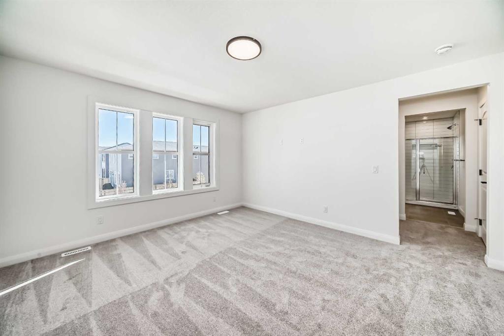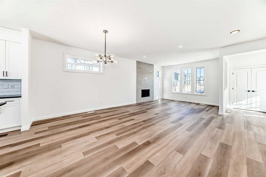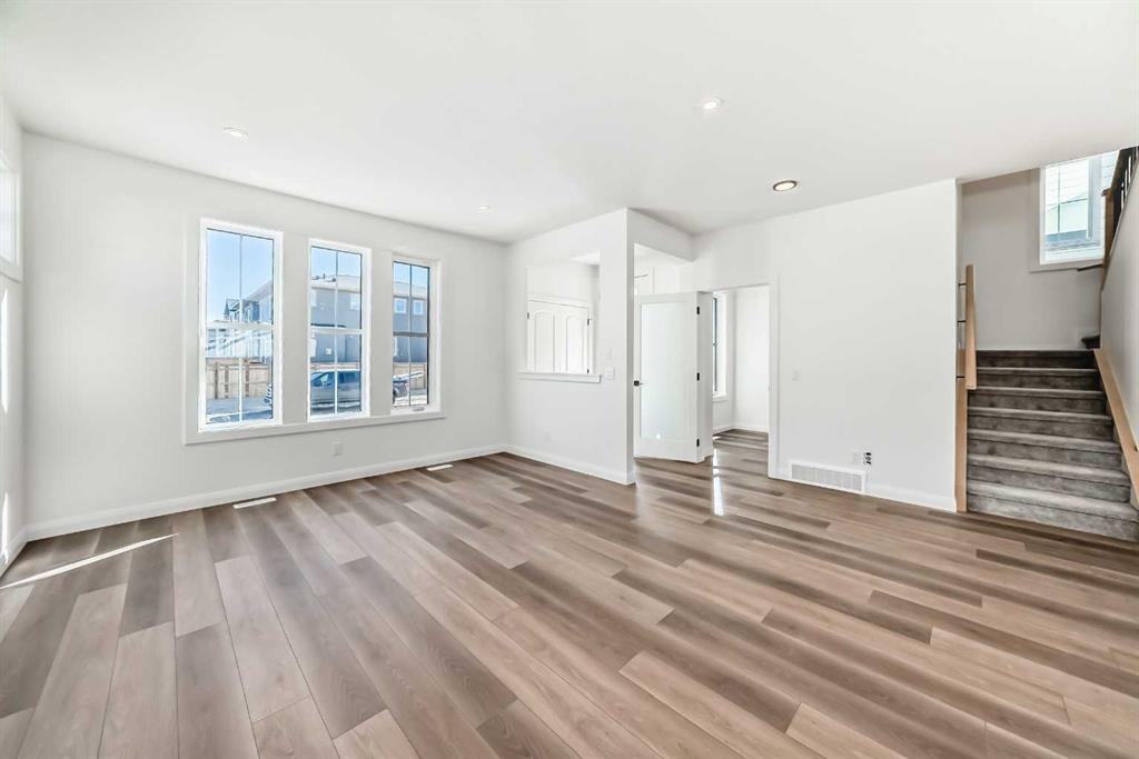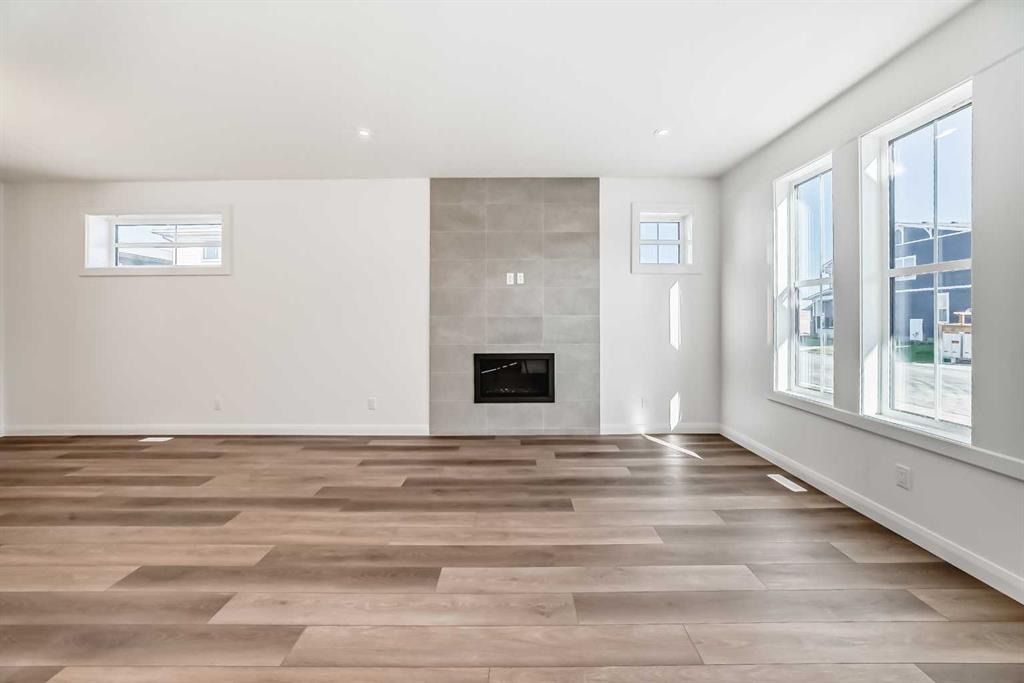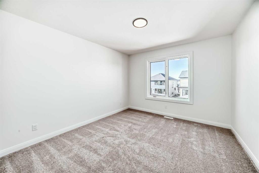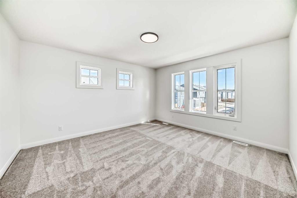 Brand new and move-in ready! This 2,082 sq. ft. Broadview Homes build blends timeless style with thoughtful upgrades. The main floor offers a flexible front room ideal for an office and a sunlit living room with a stylish gas fireplace. The bright white kitchen features quartz counters and 42″ upper cabinets finished to the ceiling with crown moulding. The stainless-steel appliance package includes a gas range, dishwasher, hood fan, and built-in microwave. A large walk-in pantry keeps everyday essentials organized. Upstairs you’ll find three bedrooms and two baths, including a primary retreat with a walk-in closet with a window and a luxurious 5-piece ensuite with double vanity, soaker tub, and roomy tiled shower. The lower level features 9′ ceilings and is unfinished, ready for your design, with rough-in for a future bathroom. The west-facing backyard offers a 10′ x 18′ deck and a concrete sidewalk to the oversized double garage, providing ample parking and storage. Additional perks include rough-in for central vacuum. Set within Harmony, a sought-after lake community and bedroom community of Calgary, you are moments from parks, pathways, golf, and everyday amenities.