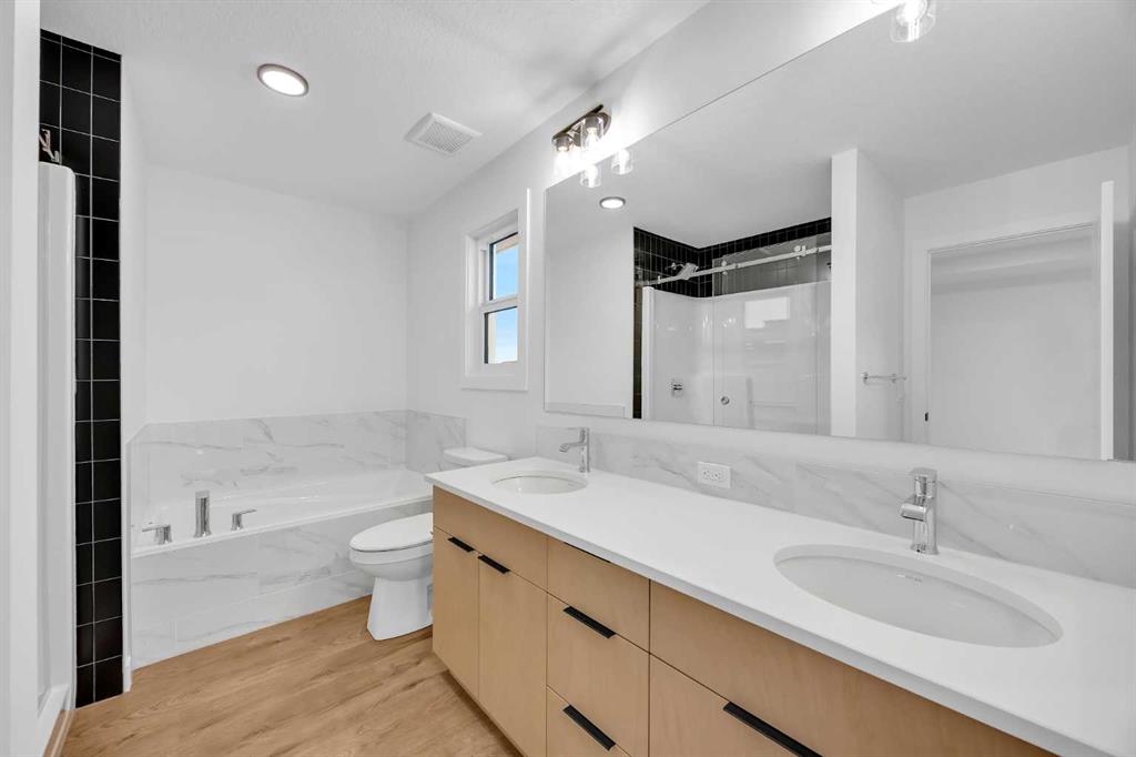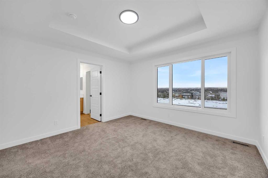 The primary retreat offers a luxurious 5-piece ensuite with dual sinks, a bank of drawers, a soaker tub, and a separate glass shower. Elevated finishes such as paint grade railings with iron spindles and a tray ceiling in the primary bedroom reflect the quality craftsmanship throughout.