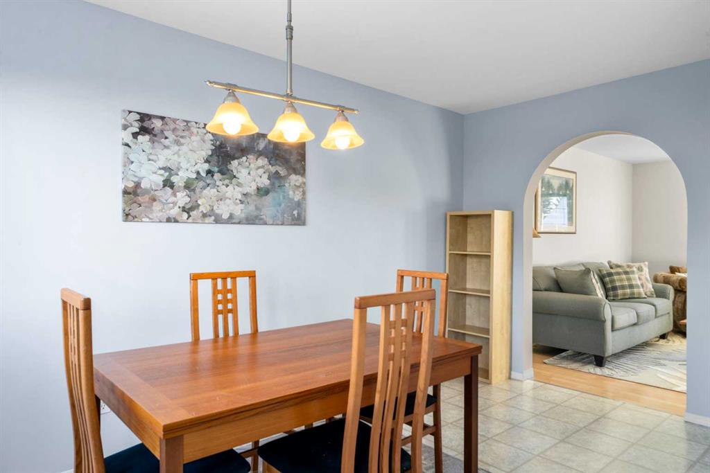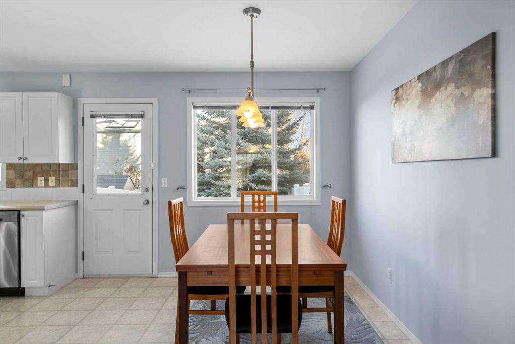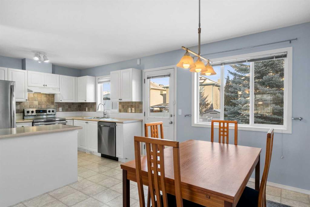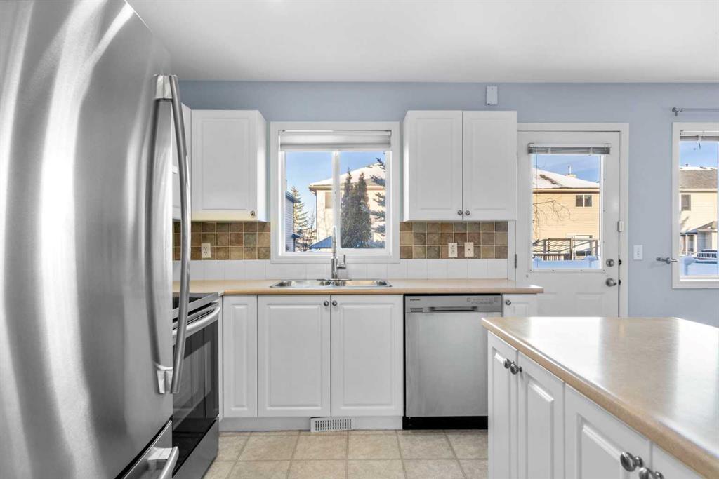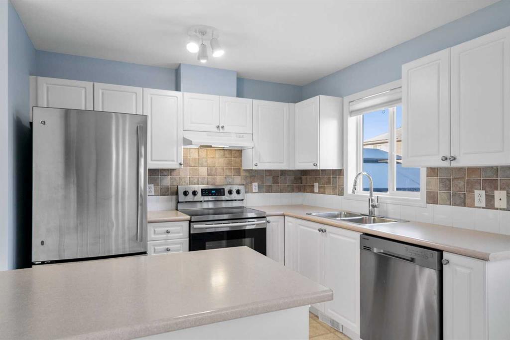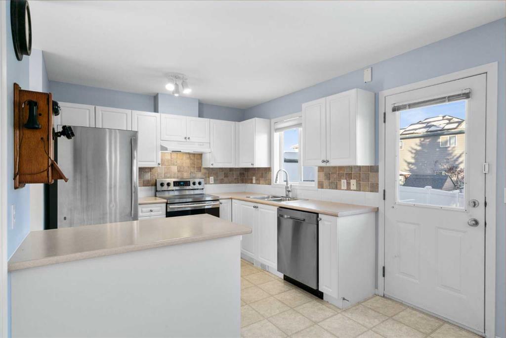 The open-concept main floor is filled with natural light thanks to large south-facing windows, creating a warm and welcoming atmosphere. Durable laminate flooring flows through the living space, leading into a clean, timeless kitchen with white cabinetry, stainless steel appliances, and a versatile island — ideal for everyday living or casual entertaining. The adjacent dining area opens directly to the patio and backyard, making indoor-outdoor living effortless.