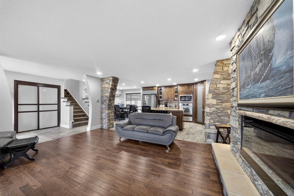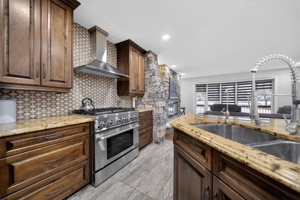 The impressive chef’s kitchen is the centerpiece, featuring a massive granite island, abundant cabinetry and counter space, extensive stonework, and steel appliances. Main-floor laundry, with an additional washer/dryer rough-in, adds convenience and flexibility. A warm and inviting family room with electric fireplace at the front of the home. Additionally, a second living space with another fireplace that opens out the sliding doors to the backyard.