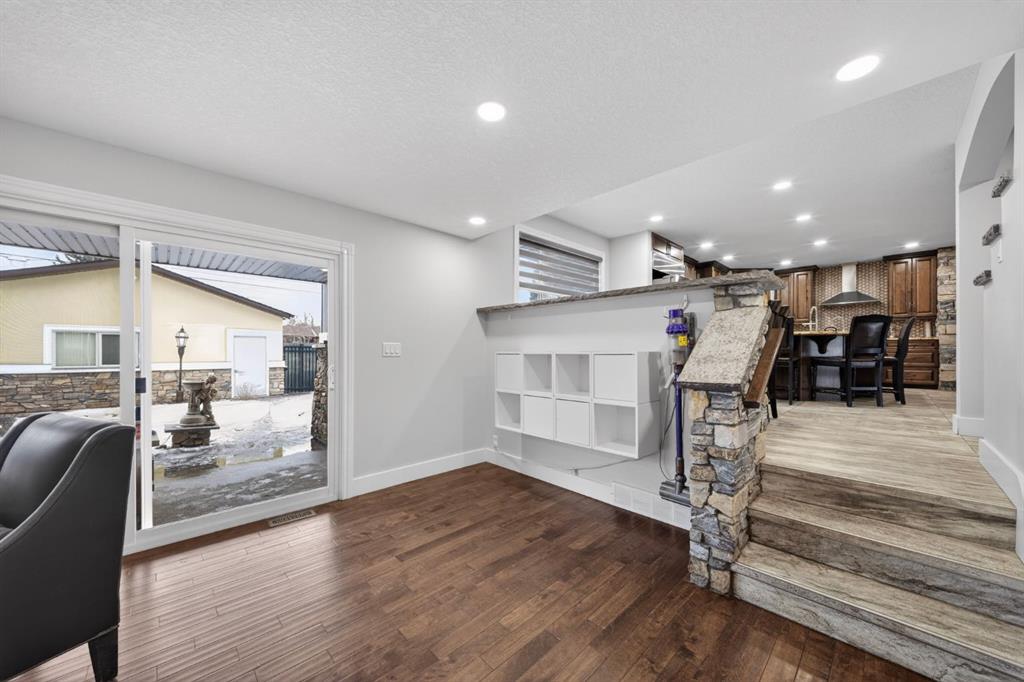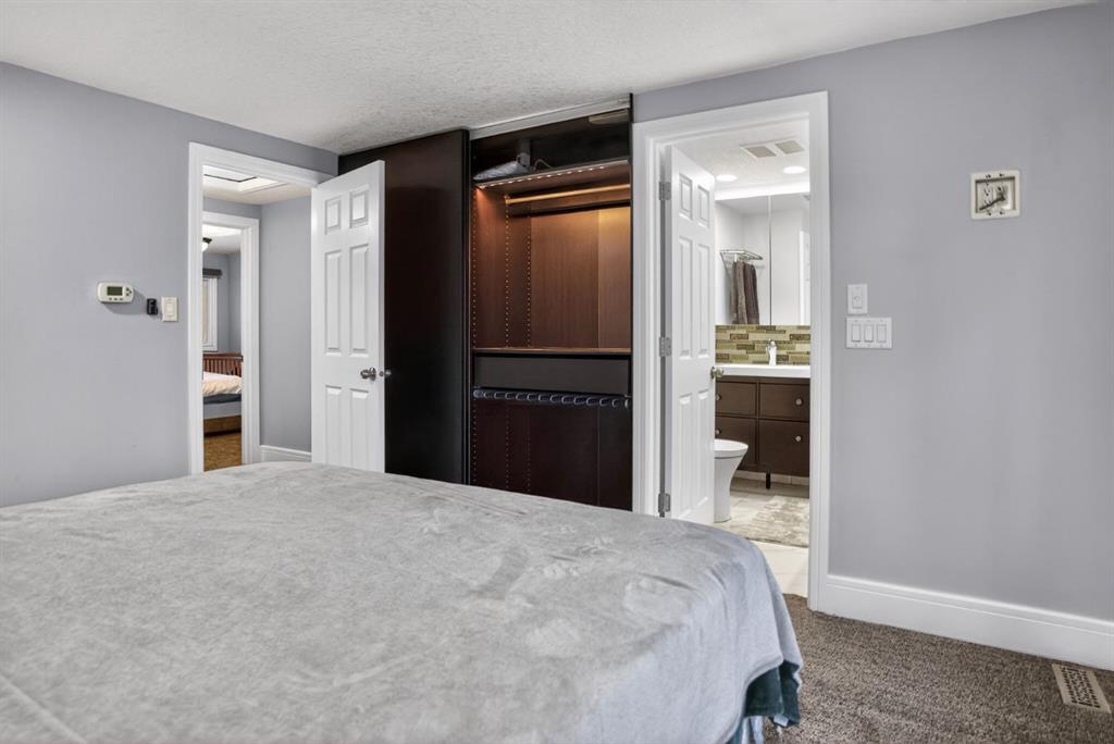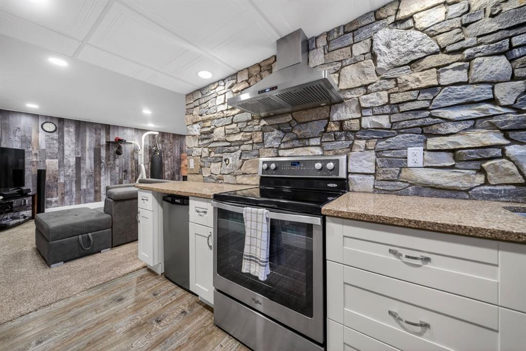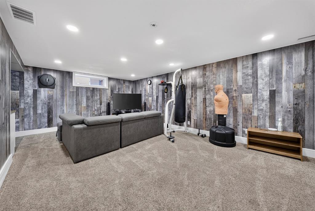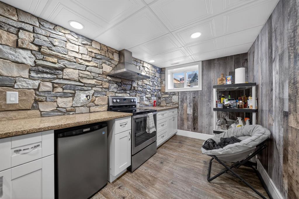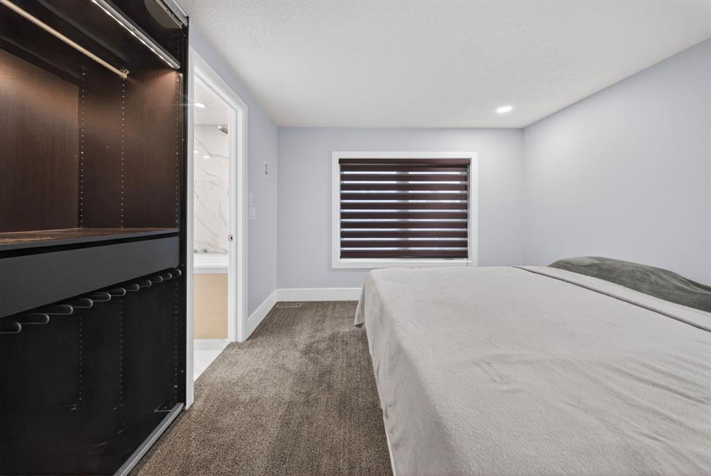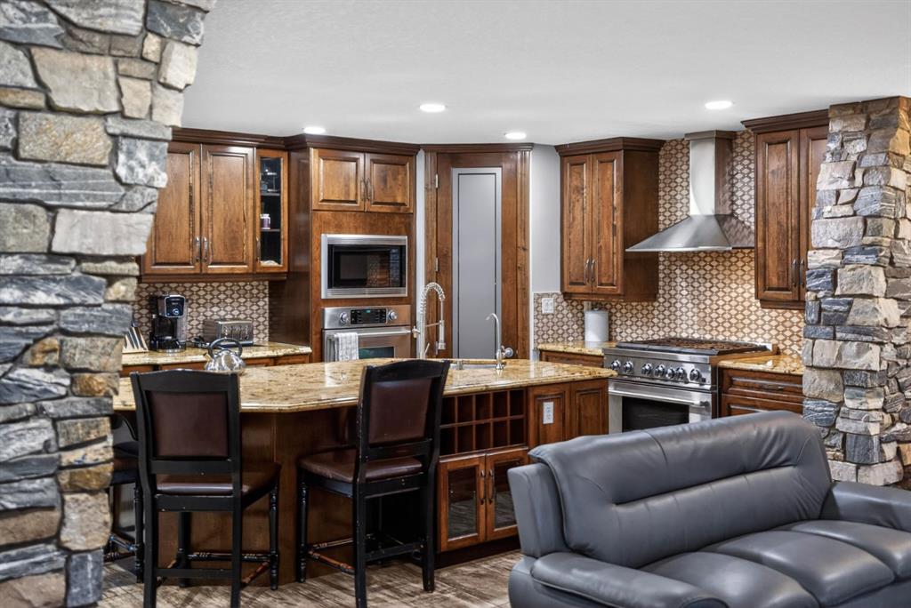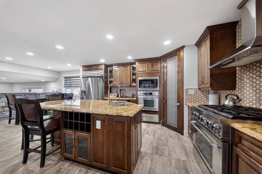 The primary retreat is a true sanctuary with a custom walk-in closet with automatic LED lighting, remote-controlled window coverings, and a spa-inspired ensuite highlighted by an infinity-style jetted tub. Two additional bedrooms and a full bathroom complete the upstairs. The fully developed basement offers a spacious recreation and games area, plus a second kitchen/wet bar complete with stove, hood fan, double stainless steel sink, and space for a dishwasher, perfect for entertaining or extended family living.