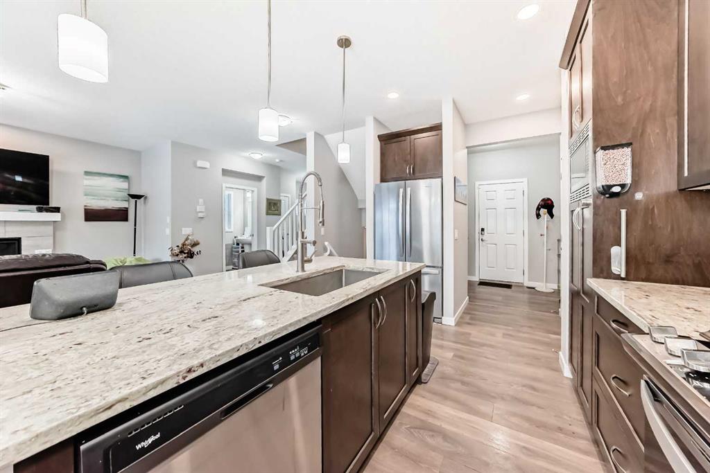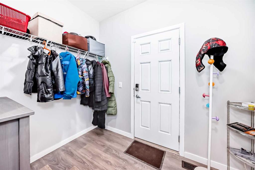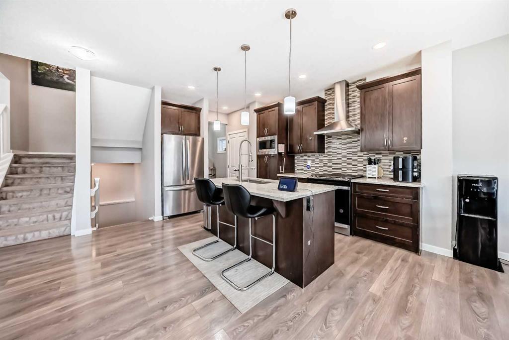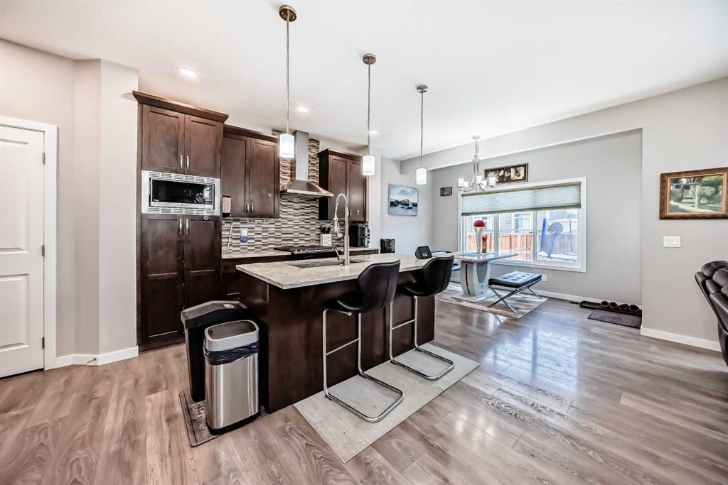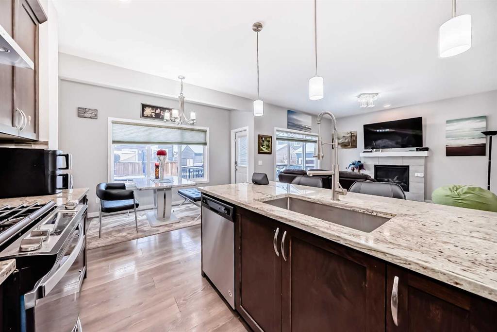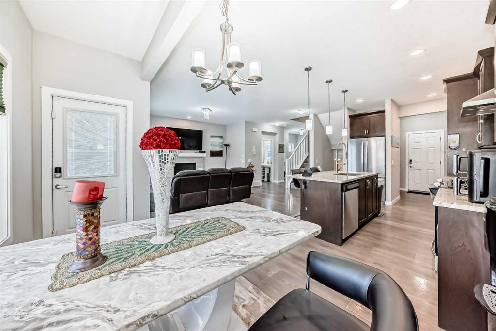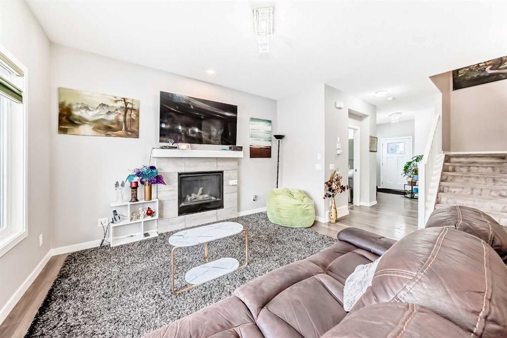 Welcome to this beautifully designed 2 story home with AC is located on a large corner lot in Midtown, Airdrie, offering spacious living and a functional layout perfect for growing families. The main level features an inviting open-concept design, complemented by stylish LVP flooring throughout. The kitchen is equipped with stainless steel appliances, ample cabinetry, and flows seamlessly into the dining area ideal for entertaining. Relax in the bright living room centered around a cozy gas fireplace, and enjoy the convenience of a 2-piece powder room and a large mudroom with plenty of storage. Completing the main level is a double attached garage for added comfort and practicality.