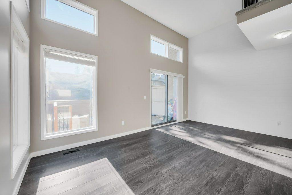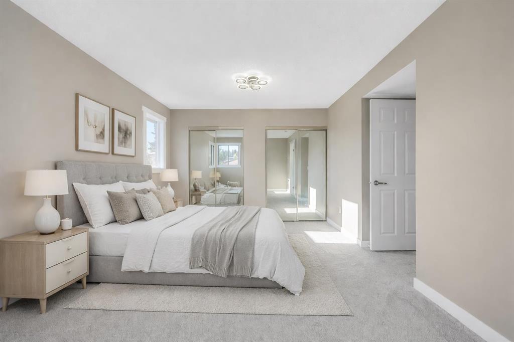 A beautifully updated end-unit townhouse in a quiet corner of the complex, backing onto open greenspace and offering exceptional privacy. Available for immediate possession. This home features a rare oversized double attached garage with extensive built-in cabinetry, a sink, and full driveway parking. Recent upgrades include new bathrooms throughout, modern LVP flooring, fresh paint, and bright kitchen cabinetry with a large island and integrated dining table, all finished with quartz countertops. A welcoming foyer leads to a spacious living room with high ceilings and large south-facing windows for excellent natural light. A few steps up is the kitchen, dining area, and a second living space with a cozy wood-burning fireplace and convenient half bath, ideal for everyday living and entertaining. Upstairs offers a spacious primary bedroom with a private ensuite featuring heated floors. A thoughtful reconfiguration created a massive second bedroom with dual closets and a cheater ensuite with separate hall access. The original third bedroom wall can be easily restored if desired. Enjoy a sunny south-facing deck and private fenced yard, perfect for pets and outdoor living. The basement level is dedicated to mechanical space and crawl-space storage, maximizing usable living areas above. This well-managed, pet-friendly complex is steps from Glamorgan Park, London Place West, and Richmond Square. Positioned directly beside the pathway and greenspace, the home offers a quiet, private setting with immediate access to long walking routes. Just 15 minutes to downtown with quick connections to Glenmore Trail and Stoney Trail.