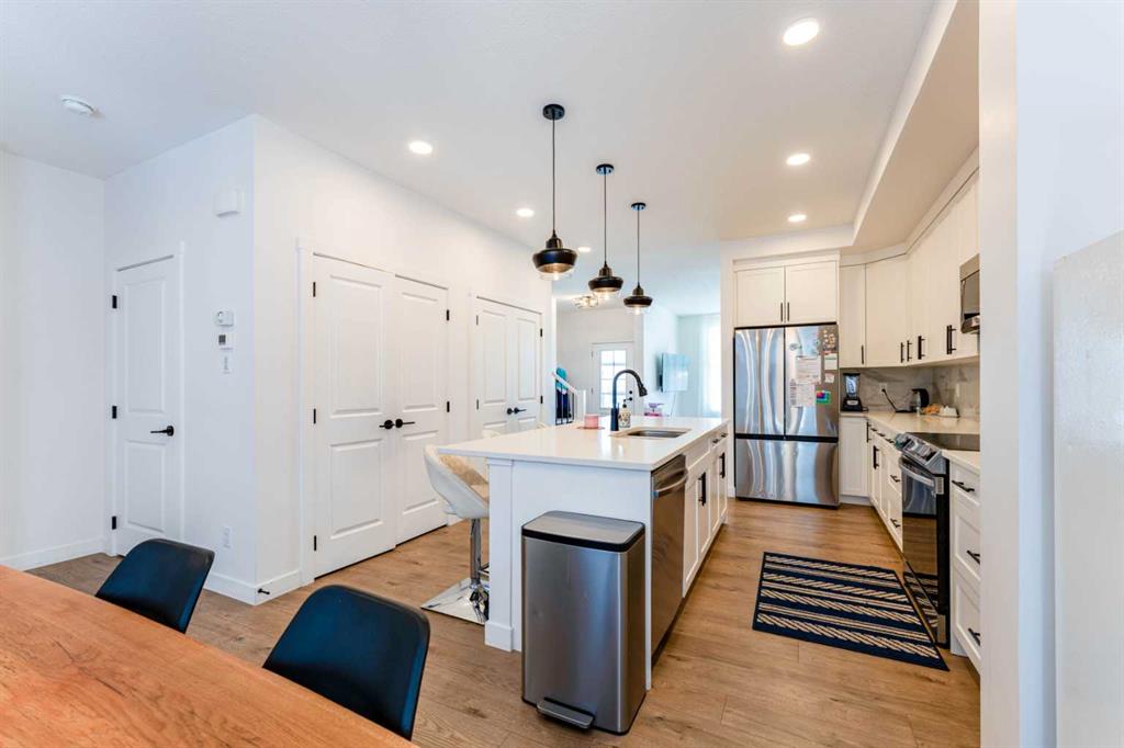 The main floor features a beautifully appointed kitchen that serves as the heart of the home, complete with a large central island, elegant granite countertops, rich white cabinetry, stainless steel appliances, and a sleek matte-finish faucet. Stylish cylinder pendant lighting and a chandelier enhance the space, while double pantry doors provide generous storage. The open-concept layout flows effortlessly into a bright and spacious living room, highlighted by large windows that bring in an abundance of natural light. Upstairs, you’ll find three generously sized bedrooms, including a luxurious primary retreat featuring a 5-piece ensuite with double sinks, plenty of space, and beautiful natural light with views of the street. A second full bathroom, additional 4-piece ensuite access, and a conveniently located laundry room ensure practicality and comfort for the entire family.