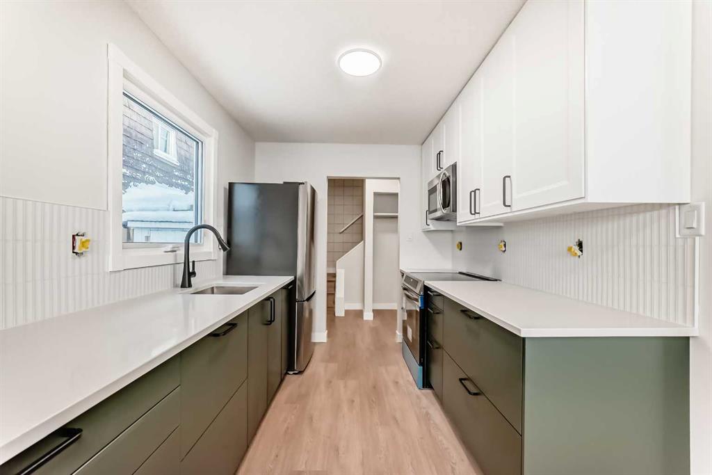 First time home buyers and insightful investors – take note.!!! Top of the line renovation, just completed! and you’re welcome – all the heavy lifting has been done – no expenses spared. This turn-key fantastic home features a galley style kitchen with BRAND NEW quartz counter tops, Frigidaire Induction stove, side by side Refrigerator, Microwave/hood fan and classic tiled back splash. Gorgeous deep green base cabinets with soft close drawers are paired with spacious white upper cabinetry. Your living room and cozy dining area offers a lovely view of the yard and sunsets. The main floor is completed with a half bathroom and a convenient side entrance-with an easy access storage shed. Upstairs features 3 good sized bedrooms, a full bath and a linen closet. The basement is fully finished with a rec room, laundry room and plenty of storage. Other features you will love about this property are, easy maintenance vinyl flooring throughout, new windows, knock down ceilings, new baseboards, new landscaping. To be noted as well, this property has a BRAND NEW TOP END 2 stage furnace and a BRAND NEW TOP END water heater, and fresh new paint throughout. This home is a gem with absolutely awesome neighbors. The location is ideal- close to Glenmore Trail and easy access to Deer Foot Trail. This charming home is nestled on a quiet street, close to shopping, transit, schools and parks. Ogden is a well established safe neighborhood – an up and coming hot spot – don’t miss this investment opportunity!