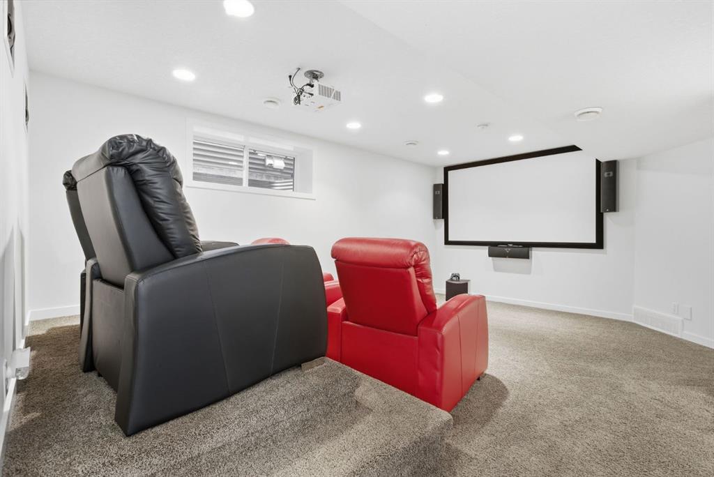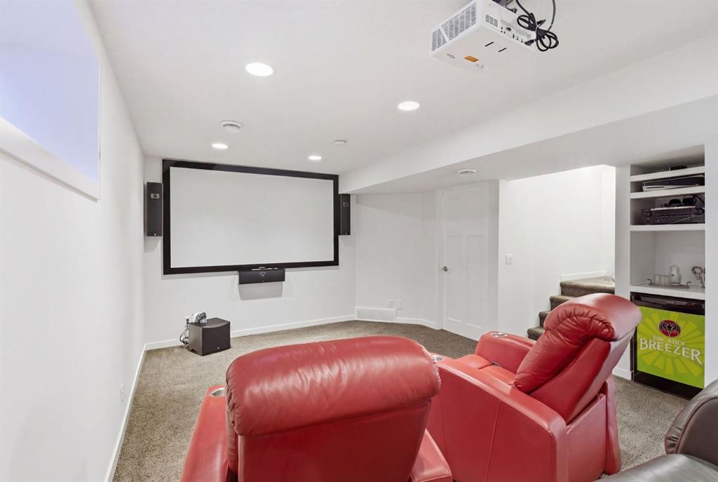 Upstairs, you’ll find three spacious bedrooms, including a large bright primary suite with walk-in closet and private ensuite. Don’t miss the bonus family room on the second level, offering even more space for your family to spread out. The fully developed basement expands your living space with a fourth bedroom, a full 3-piece bathroom with an extra large walk-in shower. On the lower level you will find a dedicated home theatre room – complete with projector, screen, and built-in speakers for the ultimate game night or home movie experience.