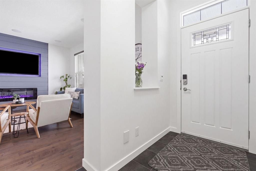 Step inside to a freshly painted interior, and newly updated living room that is beautifully enhanced by a custom feature wall showcasing a modern electric fireplace and integrated TV space—creating a warm, inviting focal point with the added bonus of the included television. The thoughtfully upgraded kitchen features granite countertops, stainless steel appliances, a gas range with hood fan, 42″ upper cabinets with crown moulding, and a custom-built dog feeding station in the centre island.