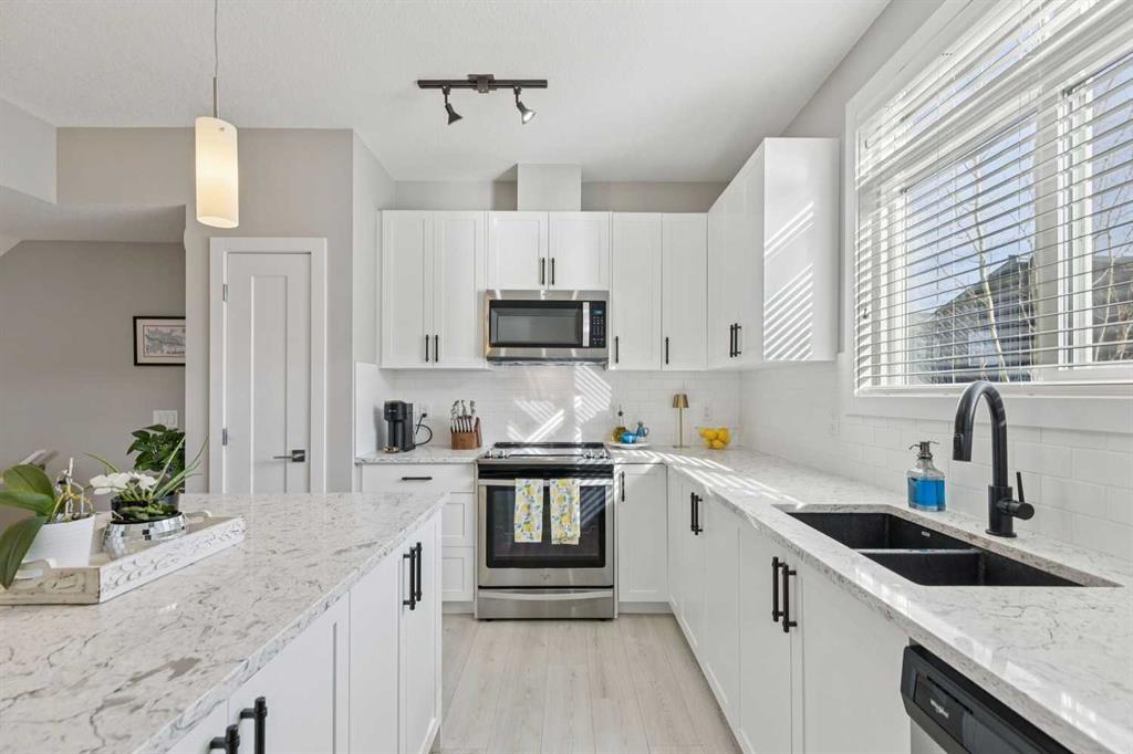 Welcome to this beautifully appointed end-unit townhome in the sought-after community of Sage Hill. As a former show home, this property showcases upgraded finishes, thoughtful design, and exceptional pride of ownership throughout. Sage Hill is one of northwest Calgary’s most desirable and rapidly growing communities, known for its scenic pathways, rolling green spaces, and convenient access to major routes like Stoney Trail and Shaganappi Trail. With an ever-expanding selection of nearby shopping, dining, and amenities, this location offers convenience and a connected outdoor lifestyle. This end-unit townhome benefits from added privacy, with only one shared wall, extra natural light, and a functional layout designed for everyday living. The open-concept main floor features durable luxury vinyl plank flooring and a beautifully designed kitchen complete with quartz countertops, timeless shaker-style cabinetry, an upgraded appliance package, and elegant pendant lighting over the island. A large adjacent dining area provides space to host family and friends, making this space ideal for both entertaining and daily living. Upstairs, you’ll find a double primary bedroom layout, with two bedrooms, each offering its own private ensuite. Convenient upper-level laundry adds to the thoughtful design, making day-to-day living that much easier for homeowners. The oversized tandem attached garage is a standout feature, providing ample space for a vehicle plus a motorbike, recreational gear, or even a workshop area. A full driveway offers parking for an additional vehicle. With low condo fees and a pet-friendly complex, this home delivers incredible value in a thriving community. Whether you’re a first-time buyer, investor, or downsizer, this turnkey property is ready to impress.