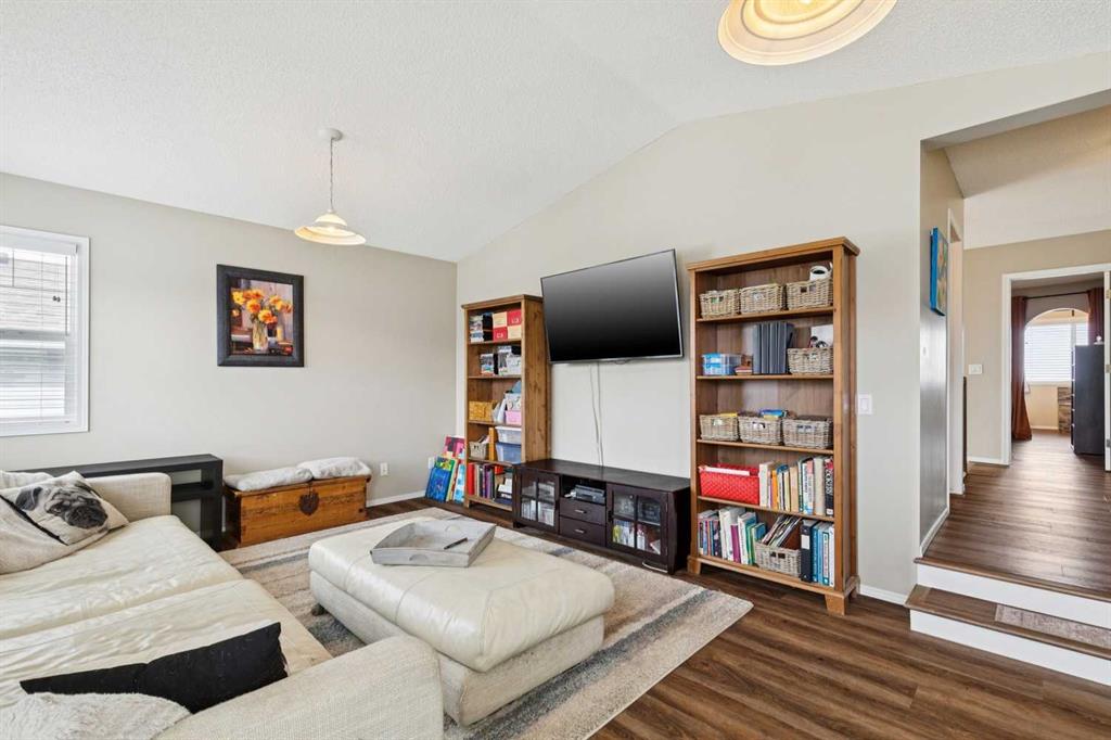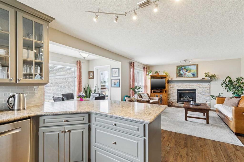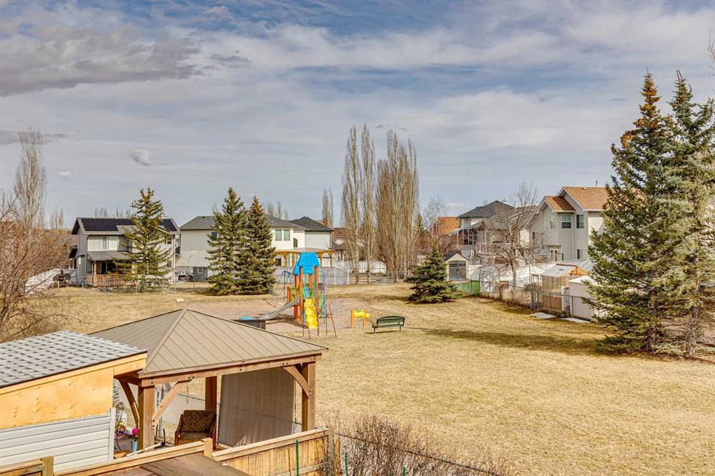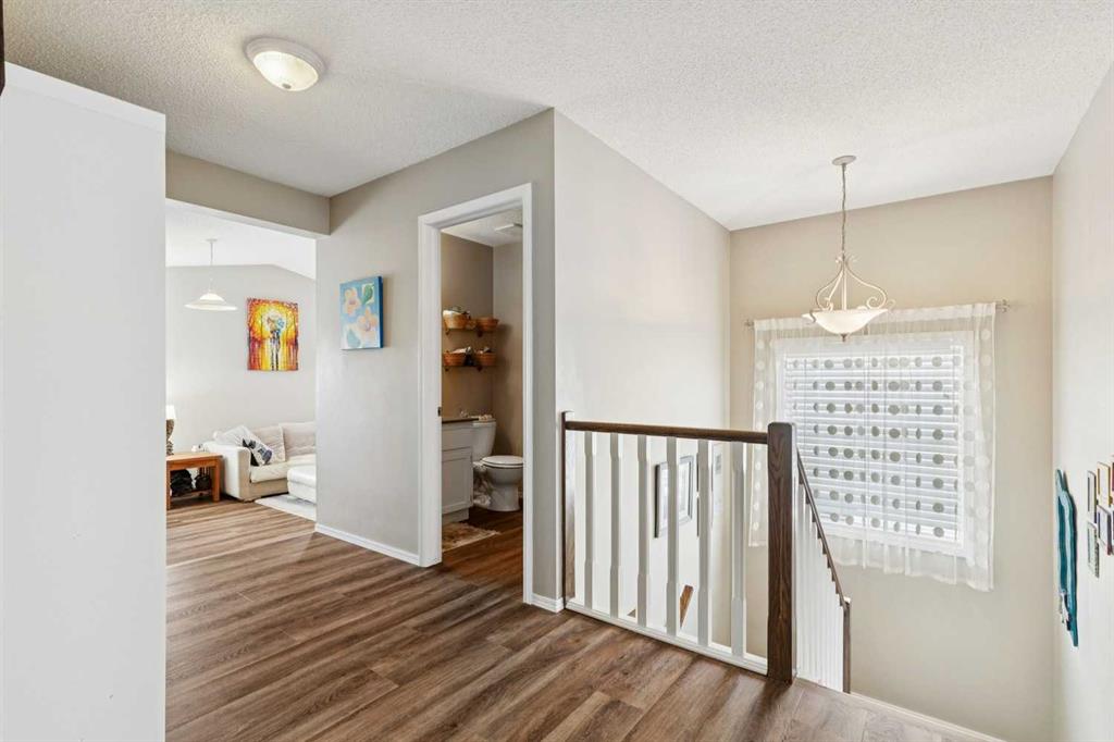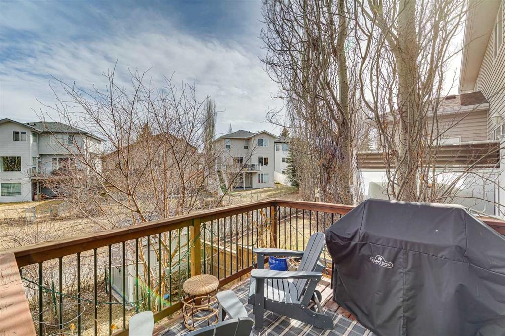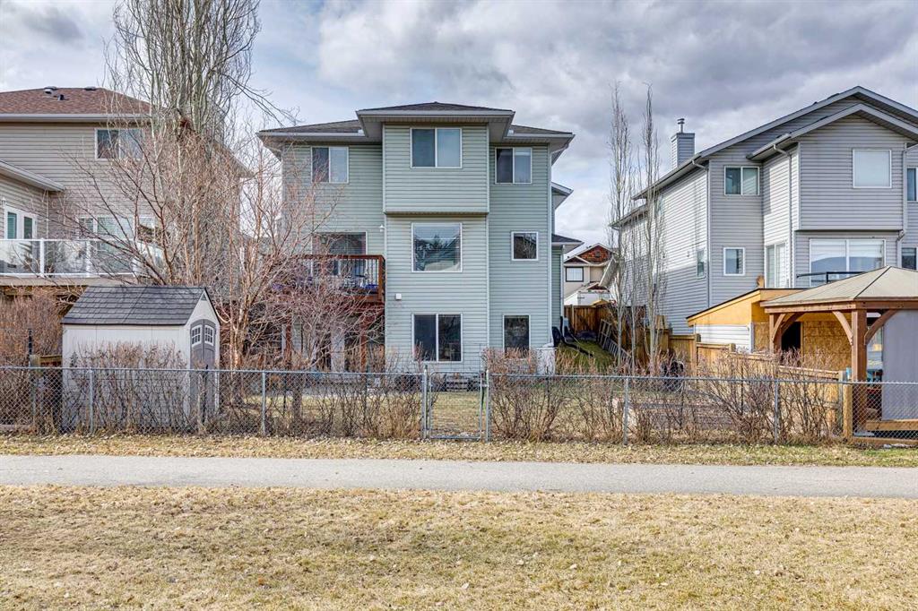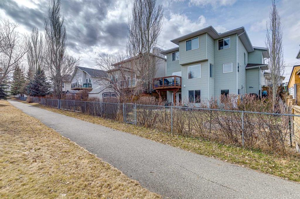 OPEN HOUSE April 18 from 1 – 3 pm. This well-located home backs onto a playground and greenspace with walking paths that connect to the river valley. You can get right downtown on the pathway system without ever crossing a major road. The southeast-facing backyard enjoys great natural light and features a large deck overlooking the green space. Inside the home has been lovingly updated with refinished hardwood floors, painted cabinets, newer stainless appliances, and new quartz counters. The comfortable main floor layout features an open concept living, dining and, kitchen space with tons of windows. The living room is centered around a gas fireplace, while the nook is surrounded by windows. There is a flex space at the front of the home that’s currently used as a formal dining area, and the laundry room is also on this level. Upstairs offers new vinyl plank floors, three bedrooms, plus a spacious bonus room with high ceilings. The finished walkout basement has a 4th bedroom and another full bathroom. The house also has A/C, a water softener, and a water filtration system. The fully fenced yard, nearby Sheep River pathway system, and convenient access to schools and shopping make this a solid choice in a family-friendly setting.