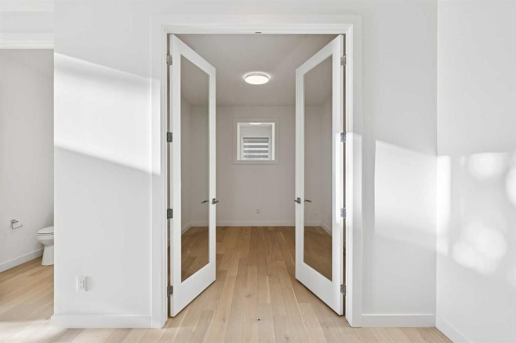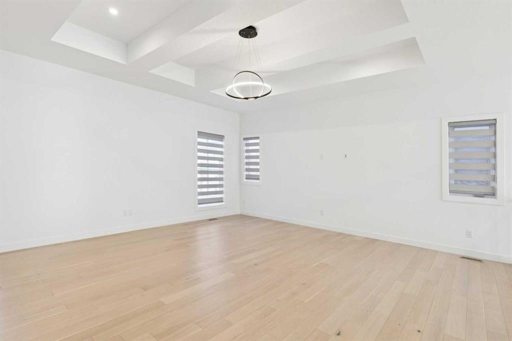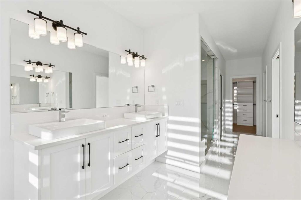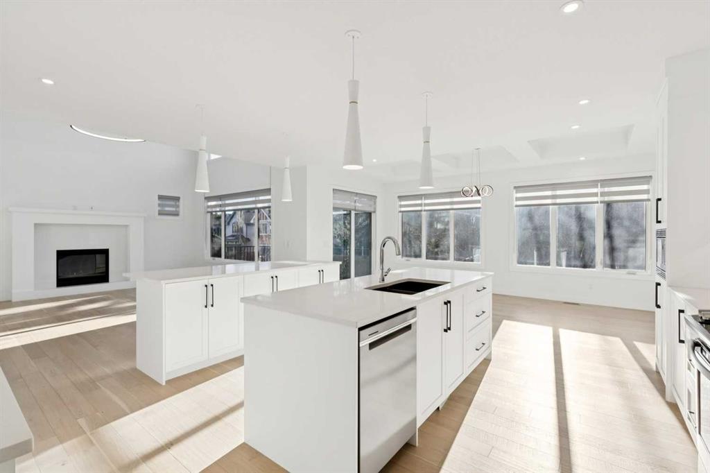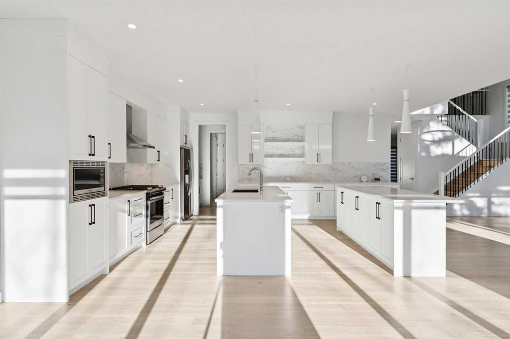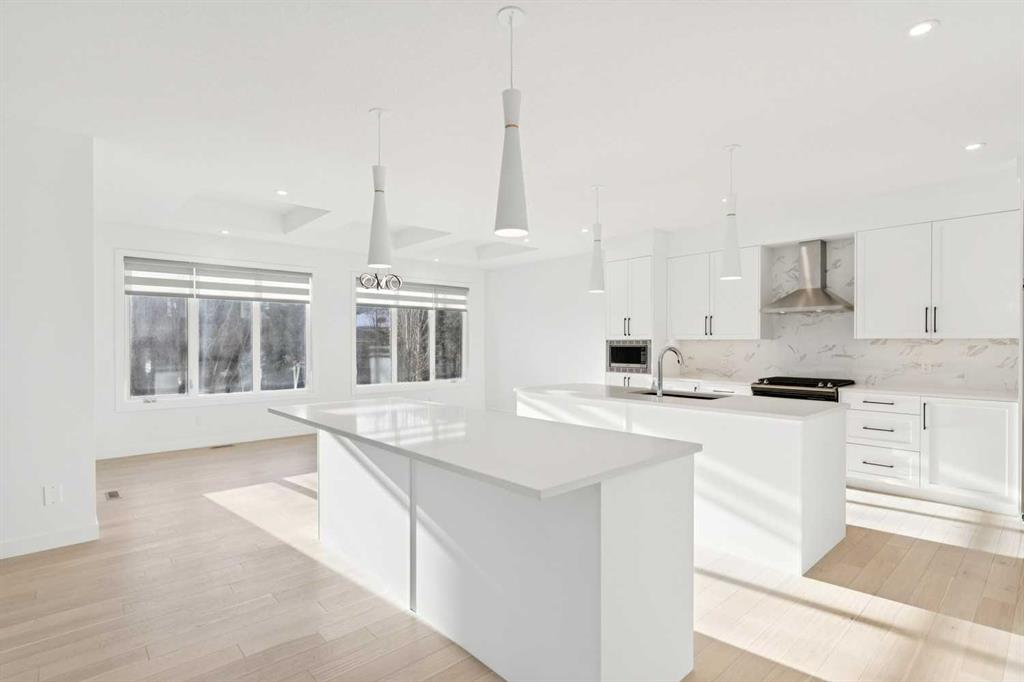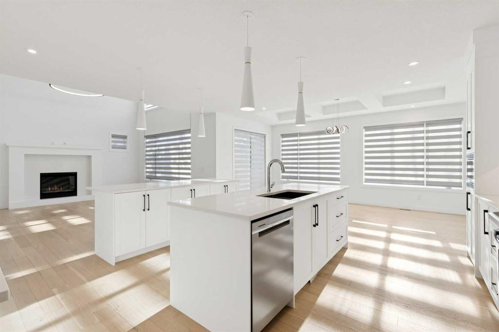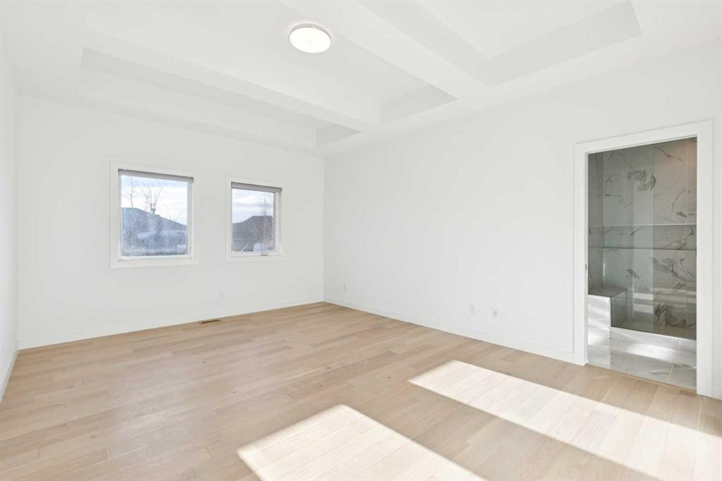 A RARE FIND! Why buy new? Save the GST and a year off construction. Chose your possession date & move in to enjoy your exceptional new home. Custom built by Truman, this barely lived-in stunning home is located on a premium south-facing, mature lot in the heart of highly sought-after West District. Offering over 4,380 sq. ft. of luxurious open concept living space, including a fully developed walk-out lower level. The Pulsar II features soaring two-storey vaulted tray ceilings, 8’ doors throughout the main floor, a dramatic wall of windows spanning the back of the home, upgraded 9’ ceilings on every level, walk-in closets & an ensuite attached to every bedroom! From the moment you step into the formal entry, you’ll appreciate the abundance of natural light that flows through the home. The elegant great room features a gas fireplace beautifully finished with tile. The adjoining chef’s kitchen is truly exceptional, featuring oversized double islands, table-top breakfast bar, extensive double-height cabinetry with soft-close pull-outs, stunning upgraded quartz countertops, premium lighting & plumbing fixtures, top-of-the-line stainless steel appliances including a 5-burner gas range. A beautifully finished walk-through butler’s pantry provides additional storage. The expansive 20’ x 10’ dining area is perfect for entertaining & large family gatherings, with a garden door leading to the full-size deck, overlooking the sunny, fenced yard. Main floor office with French glass doors & private ½ bath complete the main. The upper level offers a central bonus room & 2 spacious bedrooms, plus, the primary suite is a true retreat! Features his/hers walk-in closets, luxurious 5-piece spa-inspired ensuite with marble flooring & wall accents, freestanding soaker tub, raised dual vanities & enclosed 5’ shower. The professionally finished walk-out lower level, completed by the builder, has a separate entrance with potential for conversion to a full suite. Approximately 1,150 sq. ft. of additional living space & features a massive open recreation area, perfect for entertaining, a spacious 4th bedroom, a 4-piece bathroom & ample storage. Large picture windows overlook the yard, with direct access to the patio. Additional $100,000+ of custom upgrades include separate heating zones for every level, 2 HE furnaces, central air conditioning, premium hardwood flooring. Wonderful triple garage with high ceilings allowing for addition of a car lift. Representing the pinnacle of master-planned neighbourhoods, enjoy the walkability, just steps from shops, restaurants, schools, parks & pathways. Enjoy a short commute to both hospitals & downtown, with easy access to Stoney Trail, just 45 minutes to Kananaskis. Top ranked school district, both public & private from K to Grade 12. Lovingly built and rarely occupied by a single professional who travelled extensively, this home offers a rare opportunity to own a nearly new, custom estate property. Unbeatable hidden gem in West Calgary!