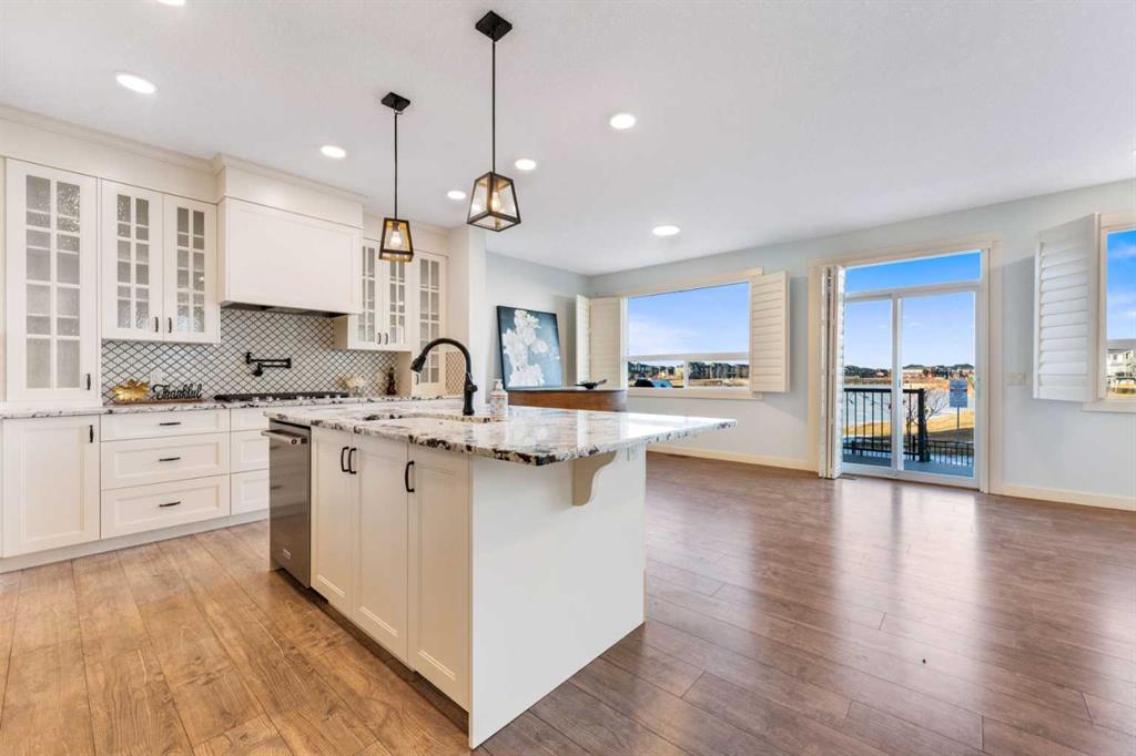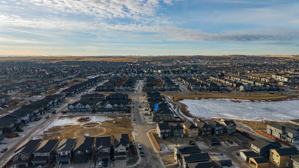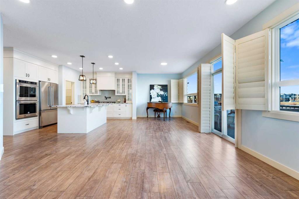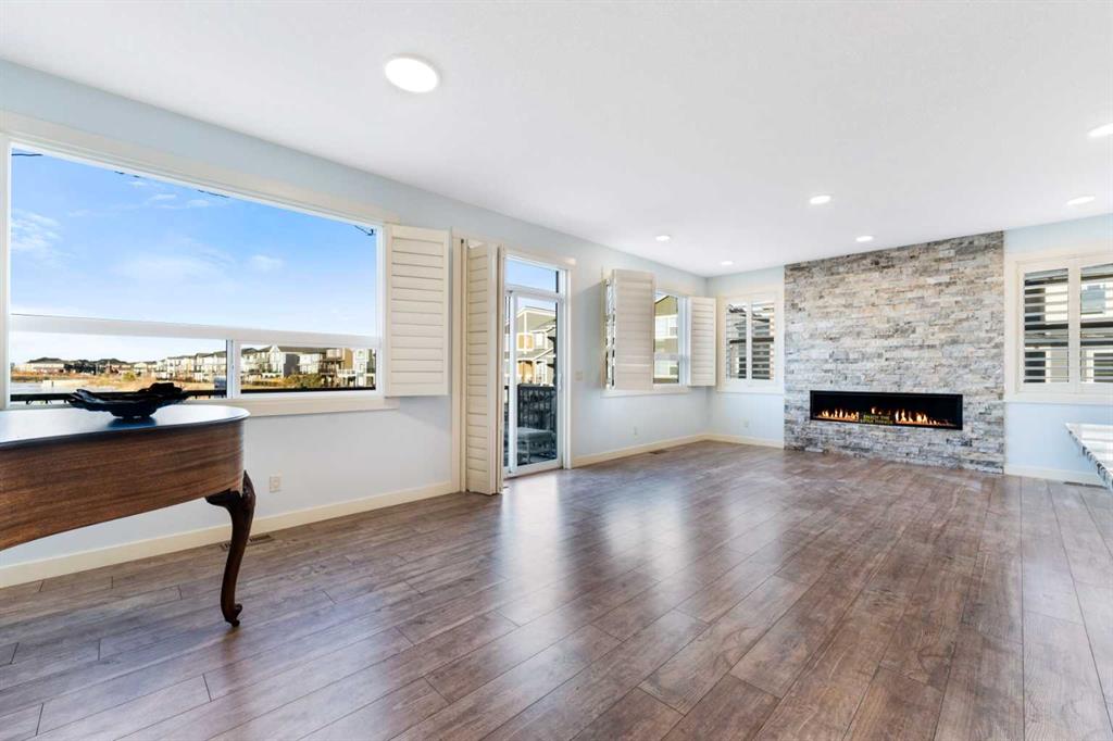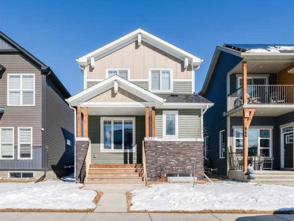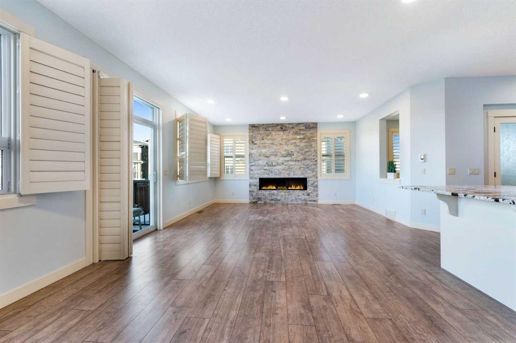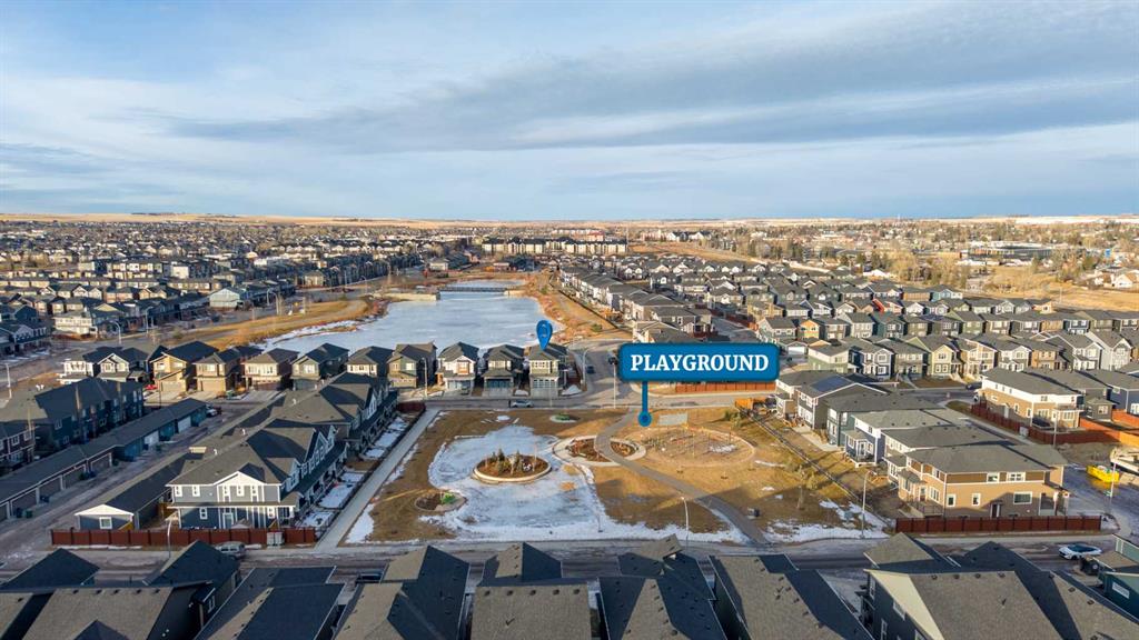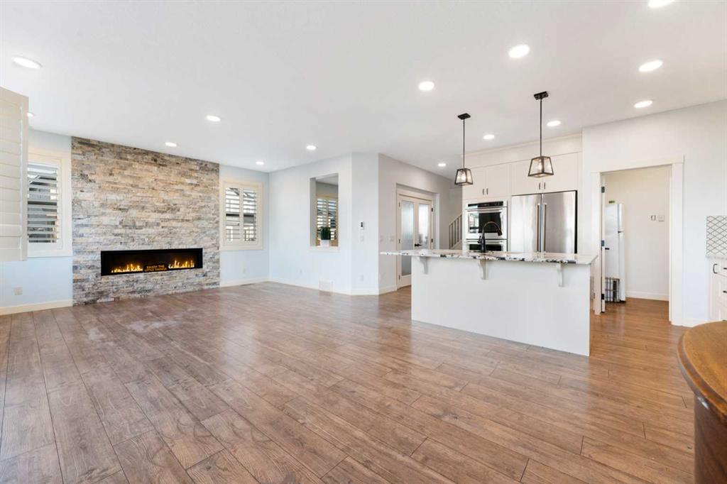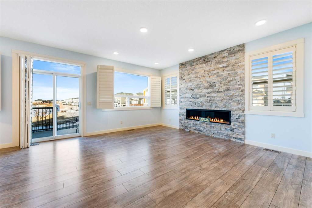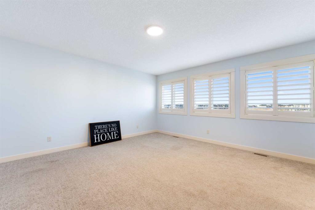 Welcome to this beautifully upgraded corner-lot family home in the heart of Midtown, Airdrie, backing onto the pond and walking paths with park-facing views that offer calming scenery and exceptional privacy. This home provides over 2,500 sq ft of thoughtfully designed living space above grade, plus an unfinished basement ready for future development. Inside, you’ll appreciate 9-foot ceilings throughout, a vaulted upper-level living area, and an expanded back wall that enhances natural light and usable space. The main floor features a functional open-concept layout with a spacious kitchen complete with double wall ovens, a pot filler above the range, a dedicated pantry fridge, and seamless flow into the dining and living areas anchored by an upgraded stone fireplace featuring one of the largest fireplace sizes available. Upstairs offers an ideal family layout with a generous primary retreat and spa-inspired ensuite with the largest tub option, additional well-sized bedrooms, a kids’ wet-room bathroom with three sinks, shower, and tub, convenient upper-level laundry, and excellent built-in storage. The outdoor space has seen over $30,000 invested, including a stone patio with fire pit, low-maintenance deck, and natural gas hookup, all perfectly positioned to enjoy pond views and the surrounding pathways. Practical upgrades include lifetime-warranty shutters on every window, a water softener system, a custom mudroom with cleaning closet and coat hooks, and an extra-long, extra-wide garage ideal for trucks, with natural gas and power roughed in for a heater, hose bibs, and security wiring. Located in the vibrant Midtown community, this home is steps from walking paths, parks, and green spaces, close to schools, shopping, restaurants, and everyday amenities, with easy access to major routes, making it a rare opportunity to own a premium, park-front, pond-backing home in one of Airdrie’s most desirable neighborhoods.