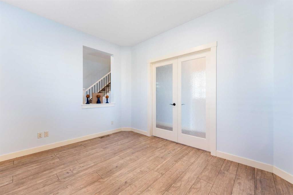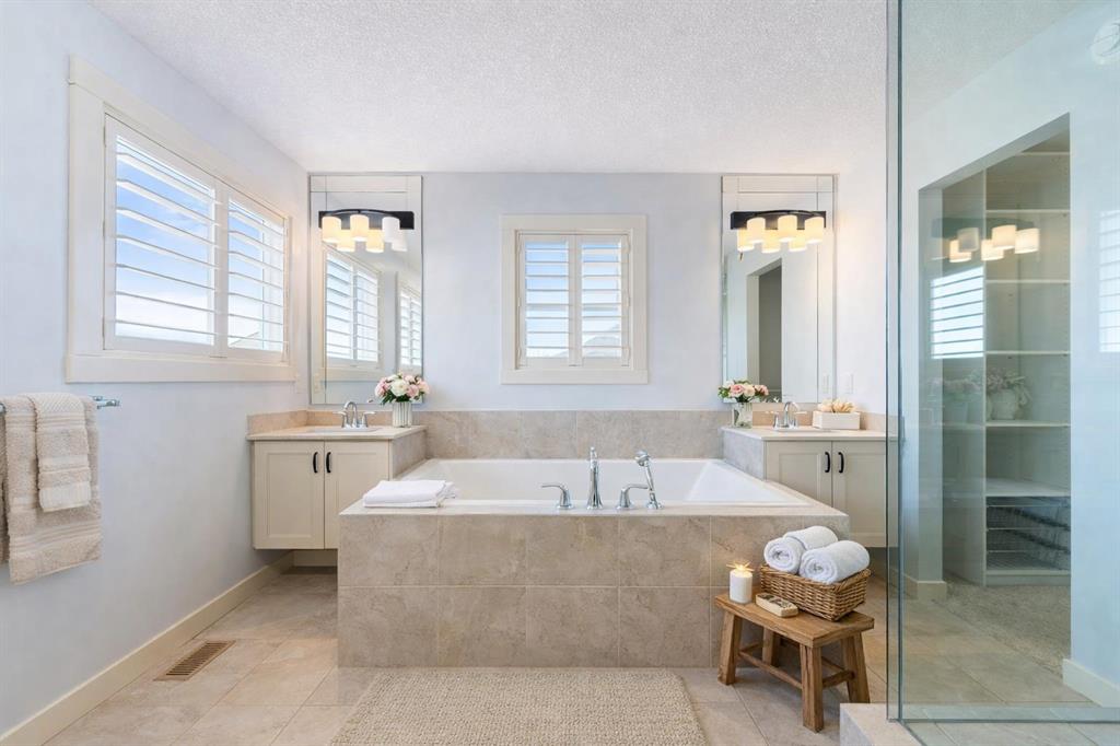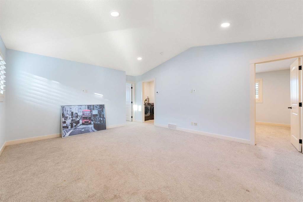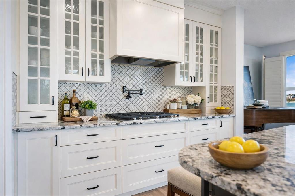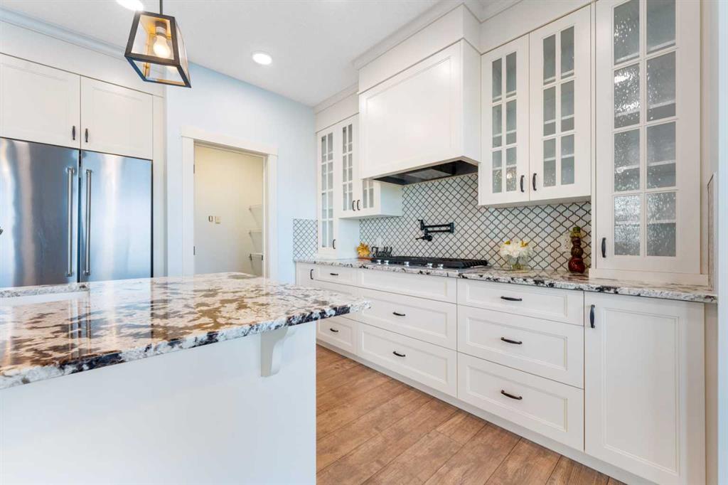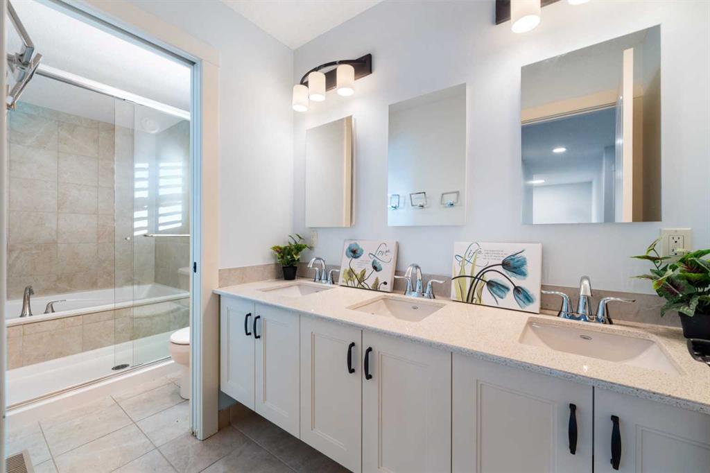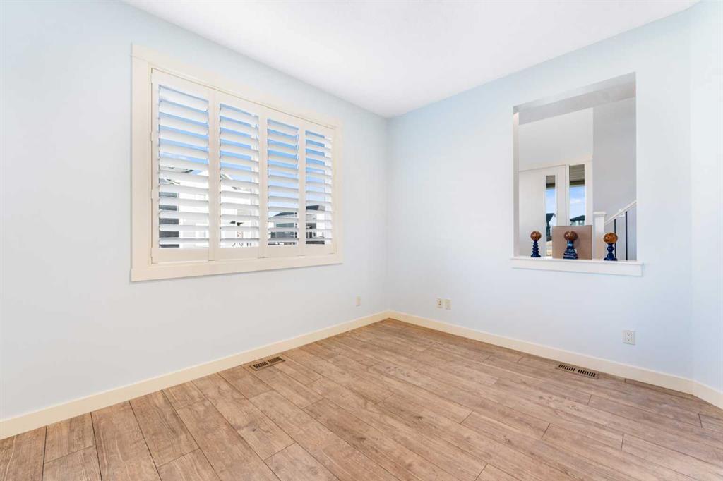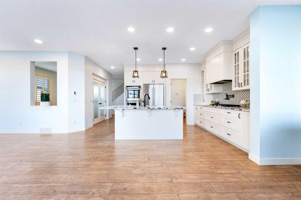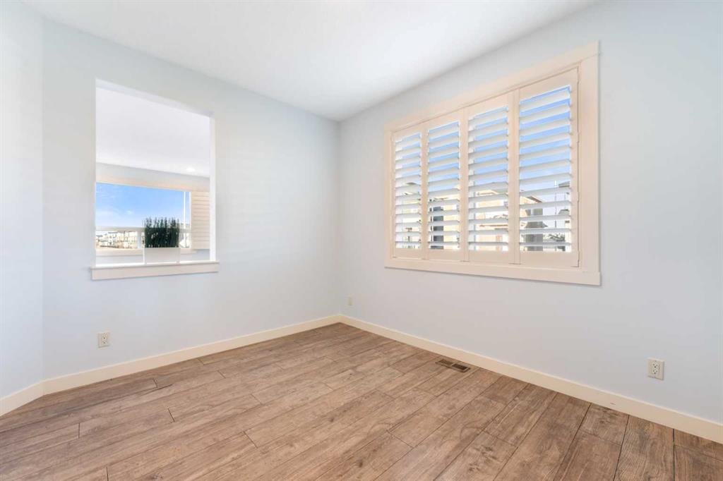 Welcome to this beautifully upgraded corner-lot family home in the heart of Midtown, Airdrie, backing onto the pond and walking paths with park-facing views that offer calming scenery and exceptional privacy. This home provides over 2,500 sq ft of thoughtfully designed living space above grade, plus an unfinished basement ready for future development. Inside, you’ll appreciate 9-foot ceilings throughout, a vaulted upper-level living area, and an expanded back wall that enhances natural light and usable space. The main floor features a functional open-concept layout with a spacious kitchen complete with double wall ovens, a pot filler above the range, a dedicated pantry fridge, and seamless flow into the dining and living areas anchored by an upgraded stone fireplace featuring one of the largest fireplace sizes available. Upstairs offers an ideal family layout with a generous primary retreat and spa-inspired ensuite with the largest tub option, additional well-sized bedrooms, a kids’ wet-room bathroom with three sinks, shower, and tub, convenient upper-level laundry, and excellent built-in storage. The outdoor space has seen over $30,000 invested, including a stone patio with fire pit, low-maintenance deck, and natural gas hookup, all perfectly positioned to enjoy pond views and the surrounding pathways. Practical upgrades include lifetime-warranty shutters on every window, a water softener system, a custom mudroom with cleaning closet and coat hooks, and an extra-long, extra-wide garage ideal for trucks, with natural gas and power roughed in for a heater, hose bibs, and security wiring. Located in the vibrant Midtown community, this home is steps from walking paths, parks, and green spaces, close to schools, shopping, restaurants, and everyday amenities, with easy access to major routes, making it a rare opportunity to own a premium, park-front, pond-backing home in one of Airdrie’s most desirable neighborhoods.