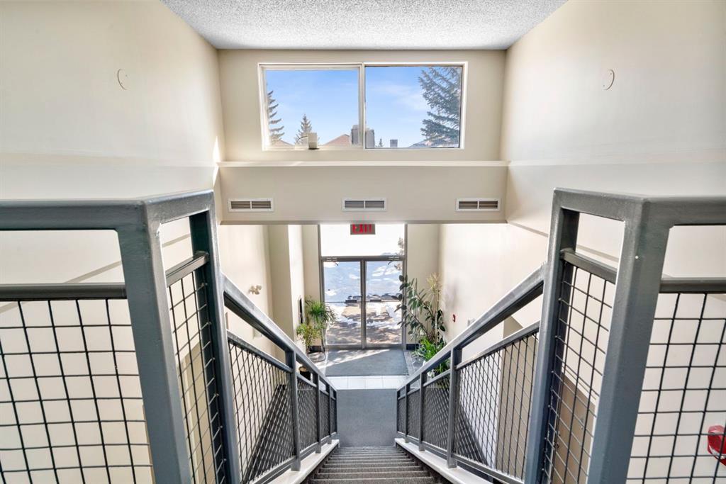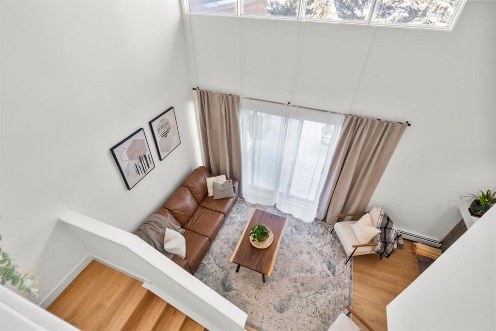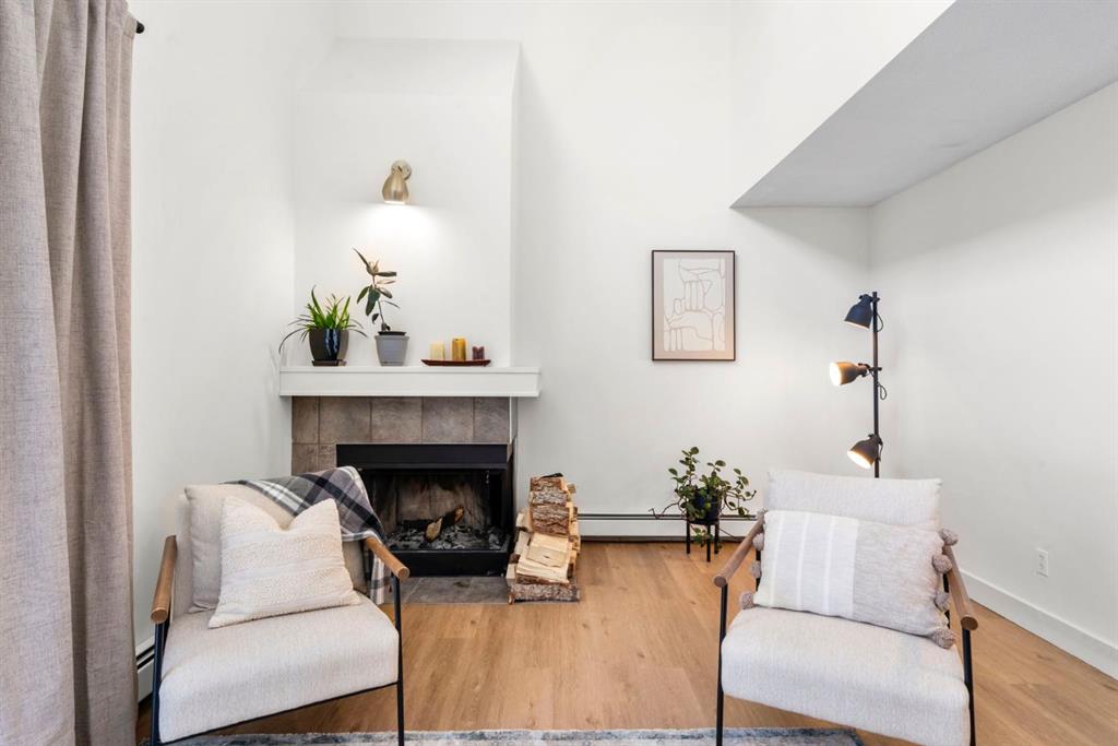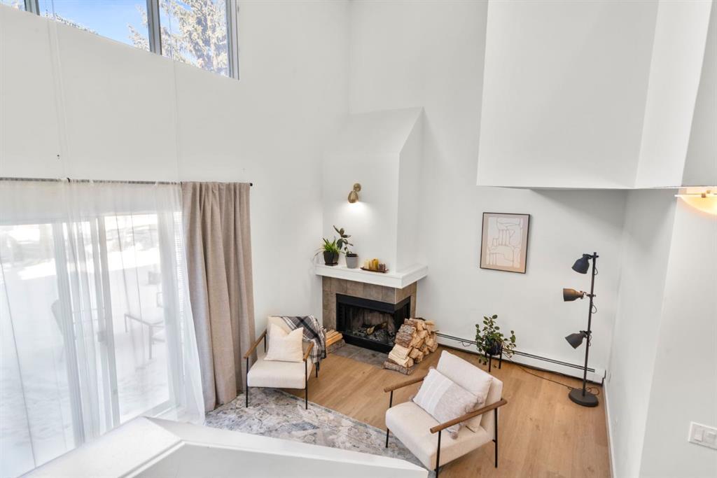 Welcome to this beautifully updated loft-style condo in The News from Broadcast Hill located in Patterson – a mature, desirable west-side neighbourhood known for it’s quiet streets, extensive pathways and convenient access to downtown. Offering over 1,000 sq. ft. of living space, this 2-bedroom, 1.5-bathroom home features a bright and airy layout with soaring high ceilings and large windows that fill the space with natural light. Fresh, modern updates make this unit completely move-in ready: the entire home was professionally painted in 2022, new vinyl flooring was installed throughout in 2022, and the main bathroom was fully renovated in 2023. As you step inside, you’ll find a convenient powder room and in-suite laundry, with the kitchen down the hallway on the right. Bright and inviting, it features granite countertops with plenty of counter space and cabinets, a newer Bosch dishwasher, a window over the sink, a pantry and a peninsula with seating — great for casual dining. The adjacent dining area opens onto a spacious east-facing patio surrounded by mature trees with downtown views, offering beautiful morning sunlight and a peaceful outdoor setting for coffee or meals. The living room with high ceilings is open and airy, centered around a cozy wood-burning fireplace and offering access to a second, west-facing patio. Upstairs, you’ll find two well-sized bedrooms, a linen closet, and the beautifully renovated 5-piece bathroom complete with double vanity, an oversized walk-in shower, and added built-in storage shelving. This unit also includes underground parking and a separate storage locker for extra convenience. Residents enjoy exceptional amenities including an indoor pool, hot tub, fitness centre, racquet courts, party room, visitor parking, and scenic walking paths throughout the complex. Condo fees include all utilities except electricity, adding excellent value. Short commute to downtown, shopping, transit, parks, and schools — and only a short drive to WinSport – this home offers an ideal balance of comfort, updates, and location in one of Calgary’s most desirable, tree-lined communities. Book your private showing today!