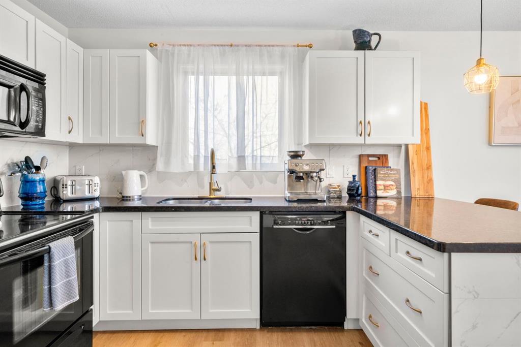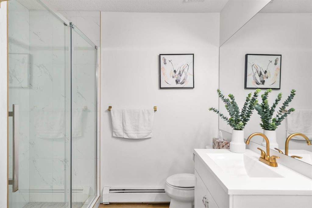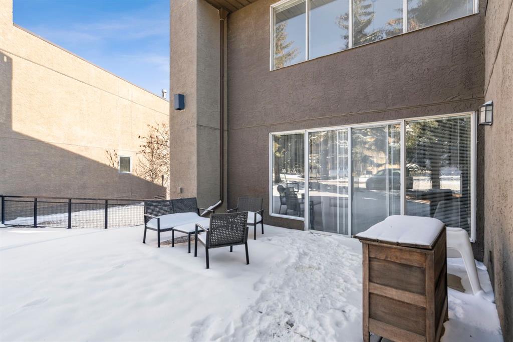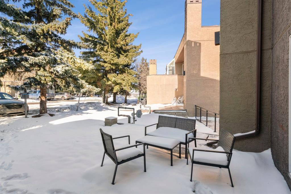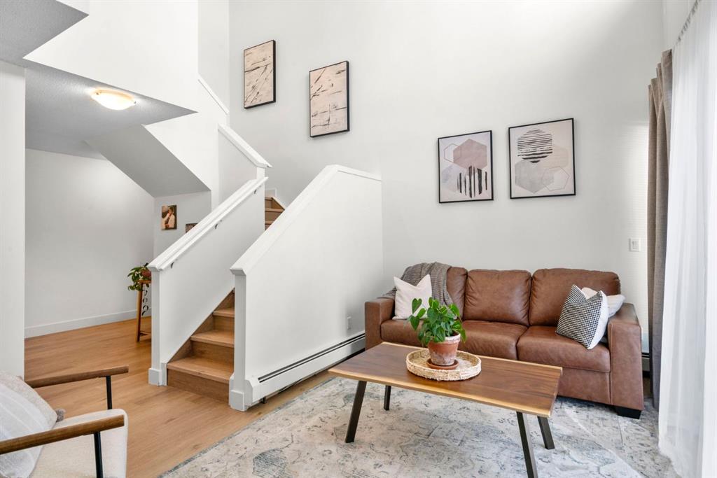 Welcome to this beautifully updated loft-style condo in The News from Broadcast Hill located in Patterson – a mature, desirable west-side neighbourhood known for it’s quiet streets, extensive pathways and convenient access to downtown. Offering over 1,000 sq. ft. of living space, this 2-bedroom, 1.5-bathroom home features a bright and airy layout with soaring high ceilings and large windows that fill the space with natural light. Fresh, modern updates make this unit completely move-in ready: the entire home was professionally painted in 2022, new vinyl flooring was installed throughout in 2022, and the main bathroom was fully renovated in 2023. As you step inside, you’ll find a convenient powder room and in-suite laundry, with the kitchen down the hallway on the right. Bright and inviting, it features granite countertops with plenty of counter space and cabinets, a newer Bosch dishwasher, a window over the sink, a pantry and a peninsula with seating — great for casual dining. The adjacent dining area opens onto a spacious east-facing patio surrounded by mature trees with downtown views, offering beautiful morning sunlight and a peaceful outdoor setting for coffee or meals. The living room with high ceilings is open and airy, centered around a cozy wood-burning fireplace and offering access to a second, west-facing patio. Upstairs, you’ll find two well-sized bedrooms, a linen closet, and the beautifully renovated 5-piece bathroom complete with double vanity, an oversized walk-in shower, and added built-in storage shelving. This unit also includes underground parking and a separate storage locker for extra convenience. Residents enjoy exceptional amenities including an indoor pool, hot tub, fitness centre, racquet courts, party room, visitor parking, and scenic walking paths throughout the complex. Condo fees include all utilities except electricity, adding excellent value. Short commute to downtown, shopping, transit, parks, and schools — and only a short drive to WinSport – this home offers an ideal balance of comfort, updates, and location in one of Calgary’s most desirable, tree-lined communities. Book your private showing today!