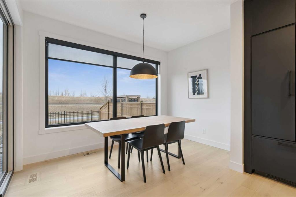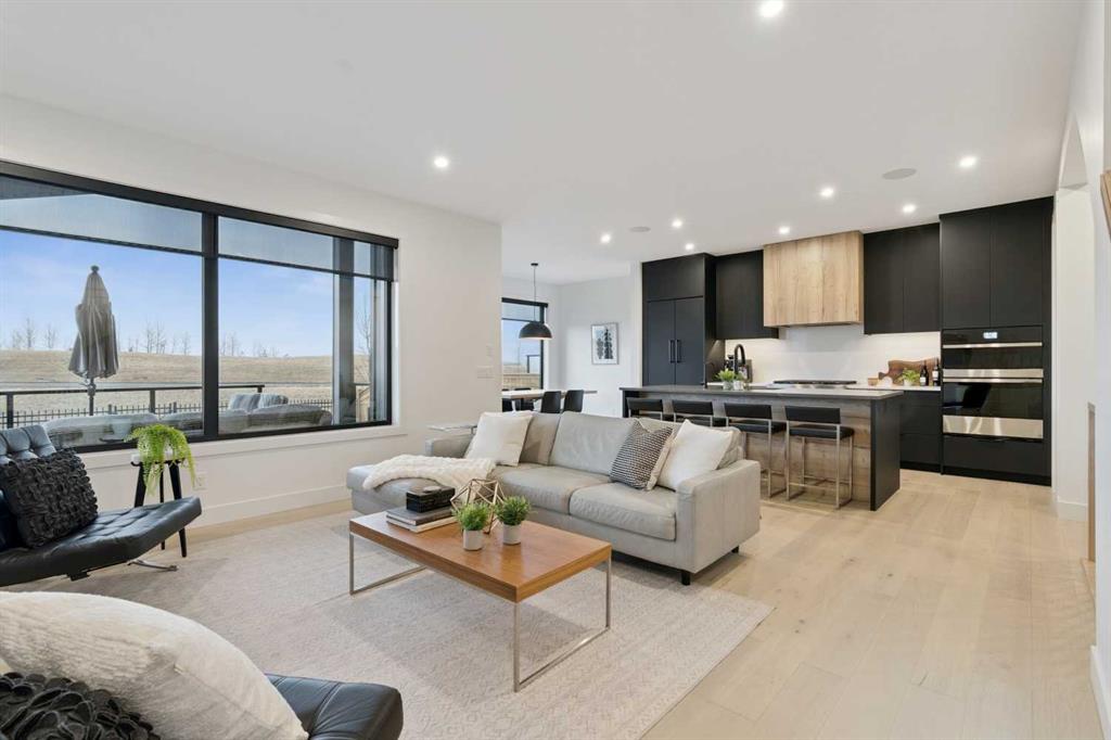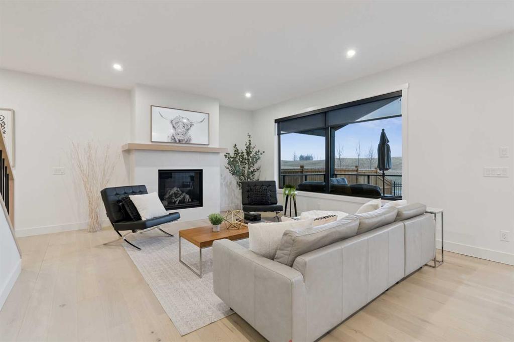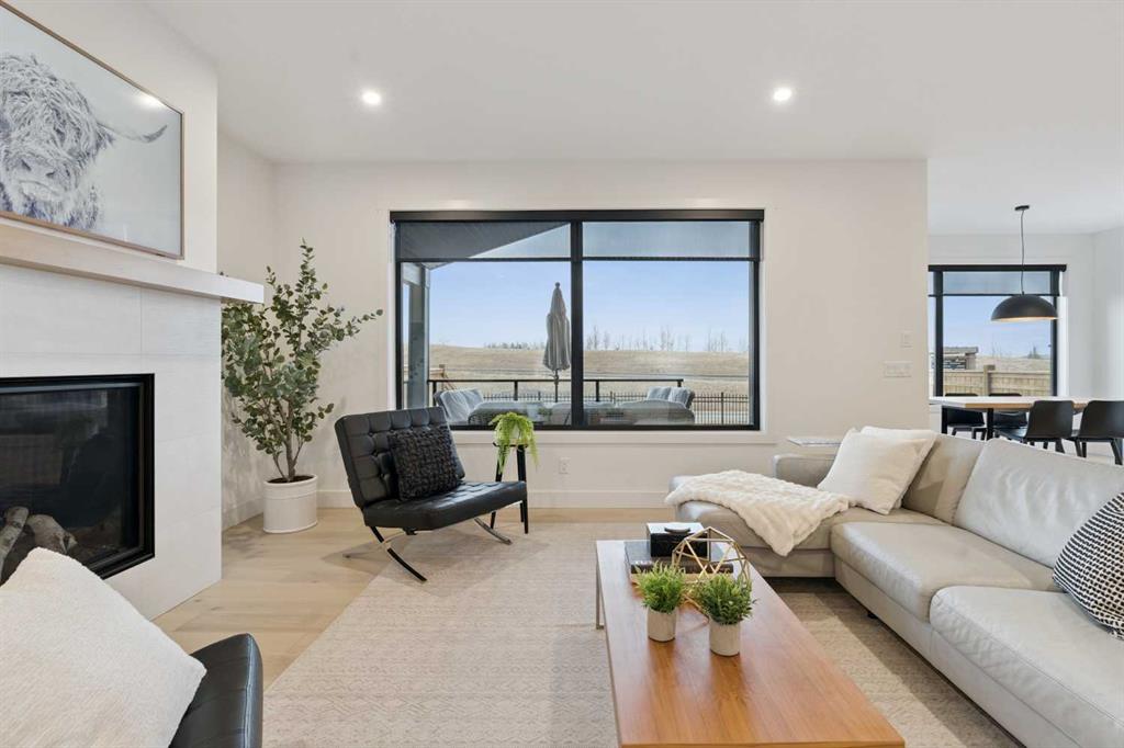 The inviting living room is centred around an oversized gas fireplace with a maple mantle and showcases expansive green views that stretch as far as the eye can see. Built-in speakers throughout the home add to the comfortable and modern living experience.