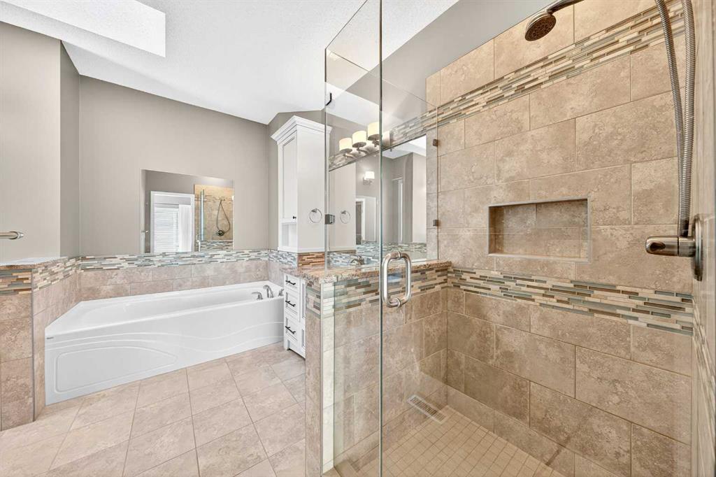 The main floor also features a spacious primary bedroom with a luxurious ensuite including a full tiled walk-in shower, soaker tub, walk-in closet, and a skylight — perfect for unwinding after a long day.