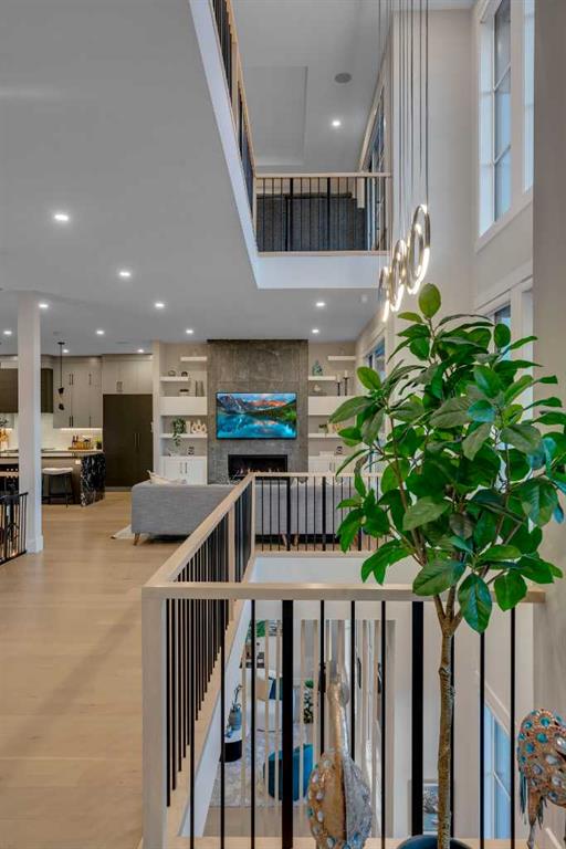 Upstairs, the wide illuminated staircase adds a striking architectural touch. The main floor is flooded with natural light from expansive windows, creating a warm yet sophisticated feel. The great room impresses with floor-to-ceiling tile detail, a fireplace, and custom built-ins. A second den provides flexibility for work or study.