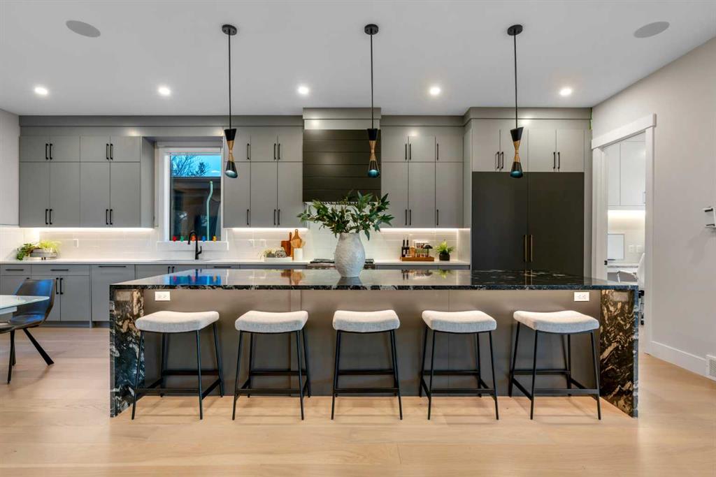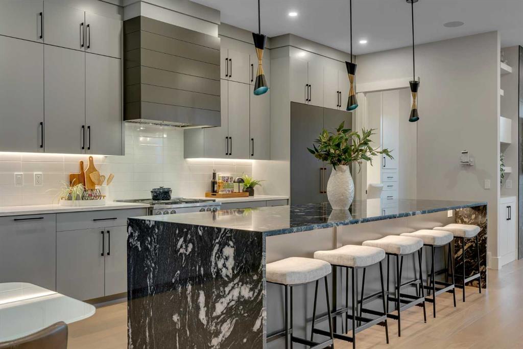 The chef’s kitchen is a true centerpiece—featuring an oversized waterfall island, top-of-the-line appliances, full-height cabinetry, elegant countertops, designer lighting, and extensive storage. A butler’s pantry and secondary prep kitchen complete with gas stove and additional appliances make this home ideal for entertaining.