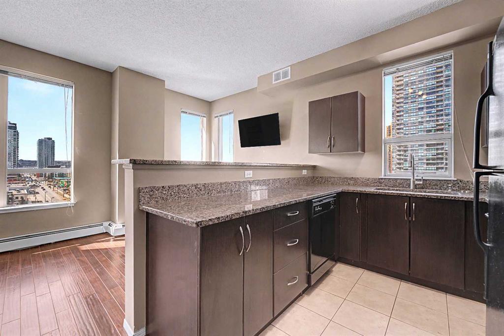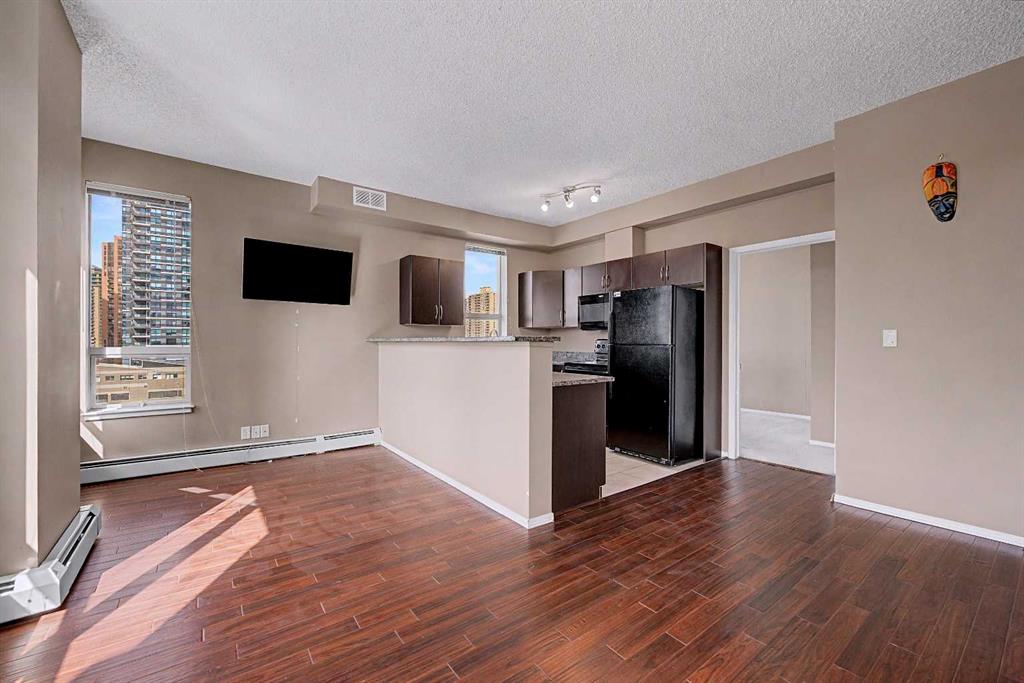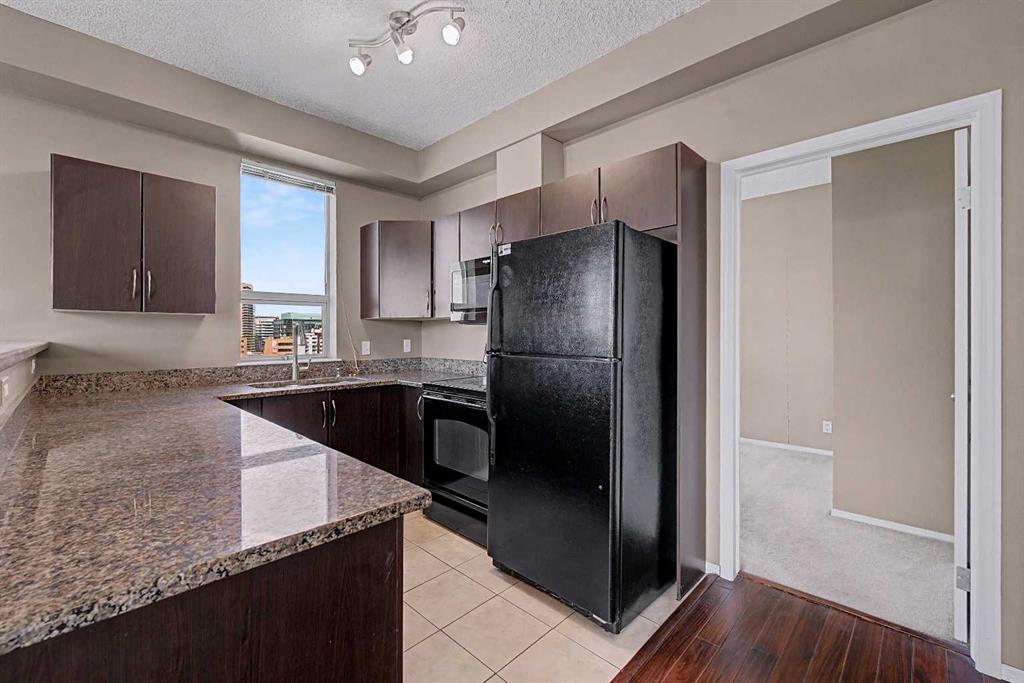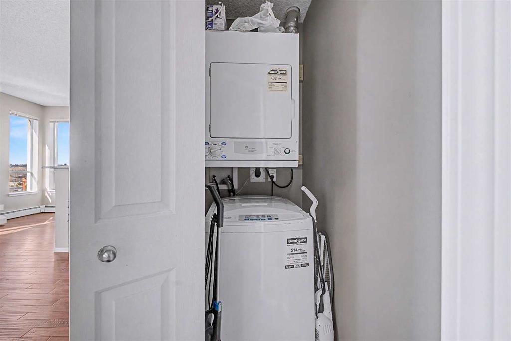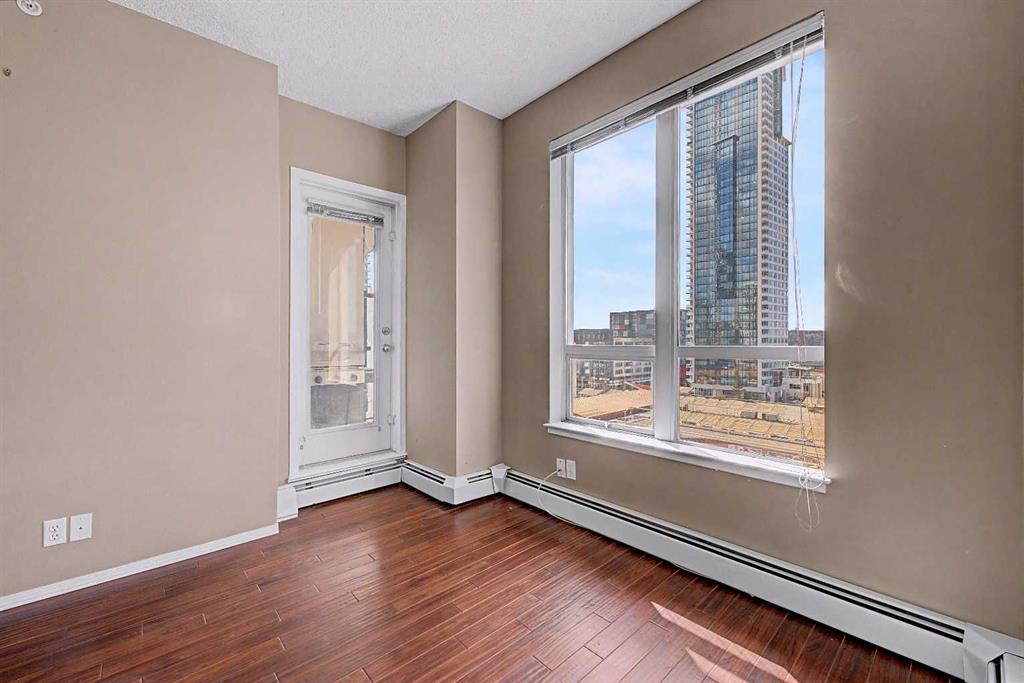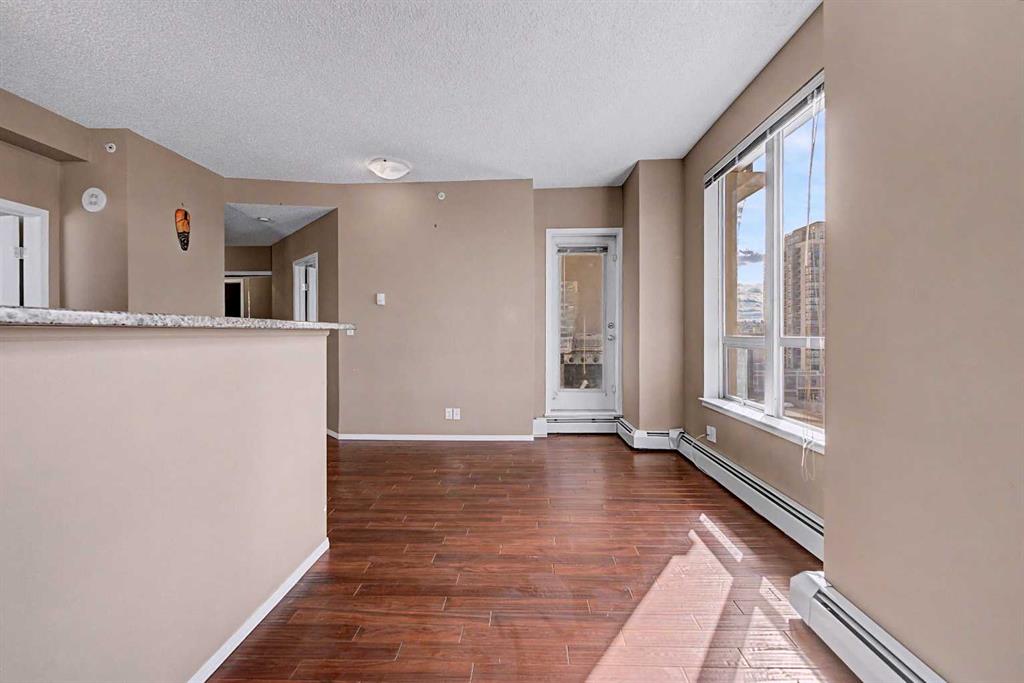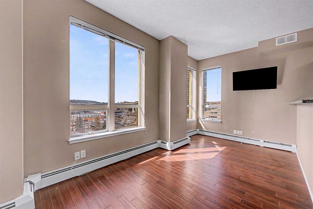 Prime unit in Vantage Pointe with west and north-facing views in the Beltline. This 2-bedroom, 1-bath condo offers 643 sq ft of open-concept living with 9 ft ceilings and finishes including granite countertops, tile, and engineered hardwood flooring. Both bedrooms have carpeting and the unit includes in-suite laundry. The balcony offers a gas hookup for BBQs. Includes secured underground heated parking (P3, Stall #89) located close to the elevator. Condo fees include electricity, heat, and water. Building amenities include a fitness centre, bike storage, and a party room. Great central location within walking distance to downtown, 17th Ave, bike paths, and nearby grocery stores. Book your showing today.
