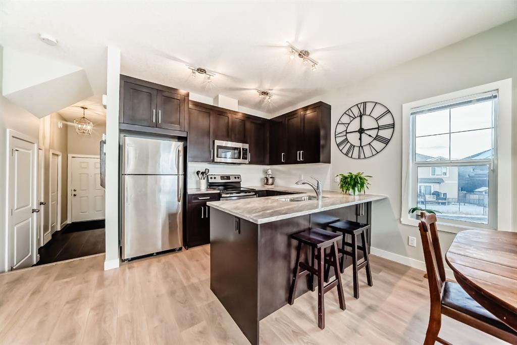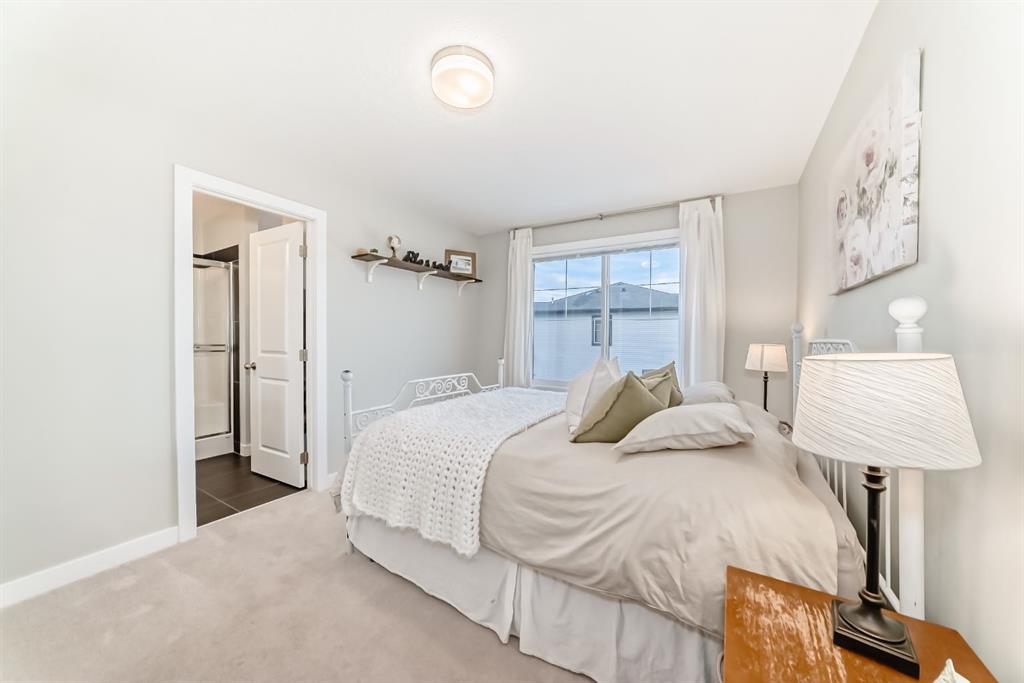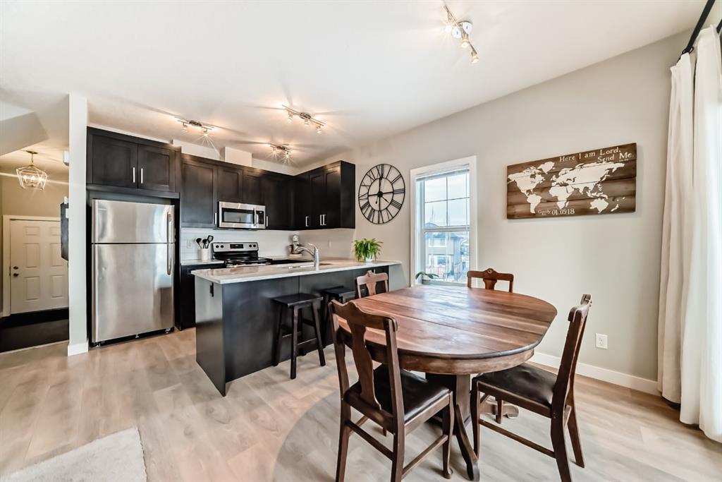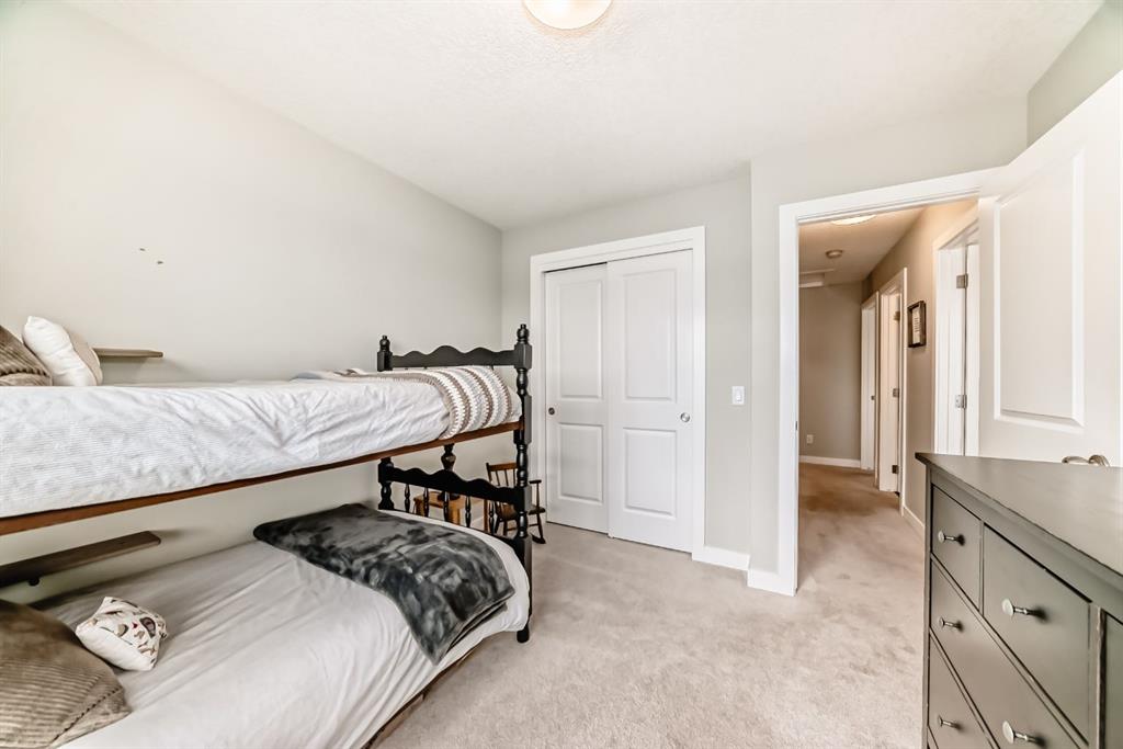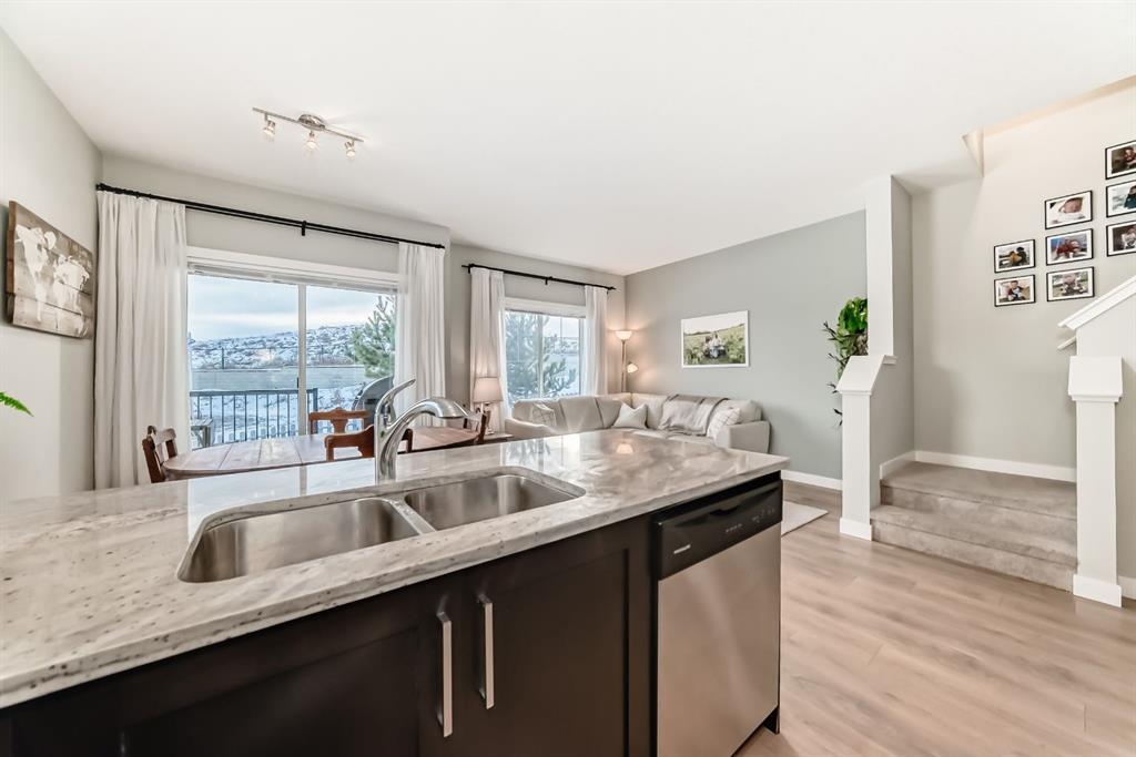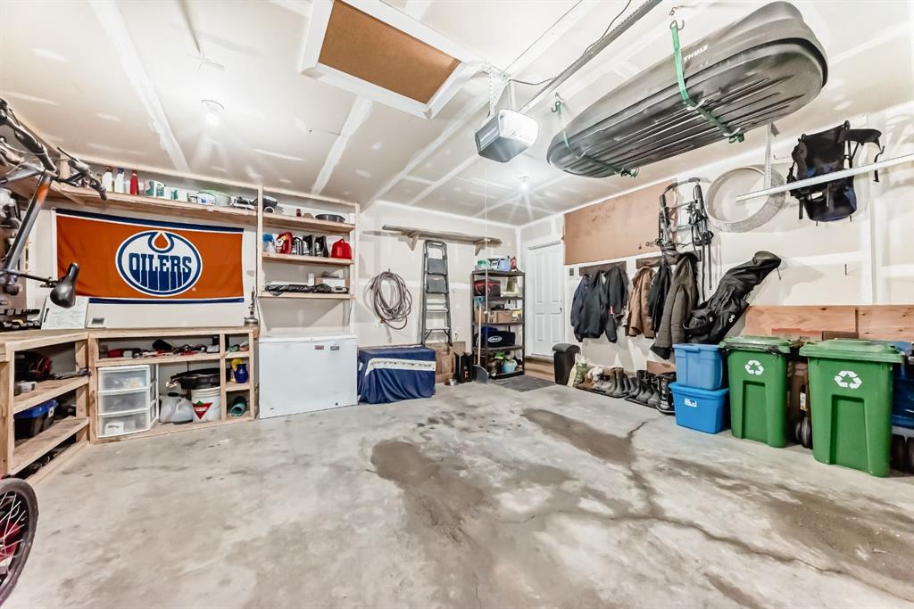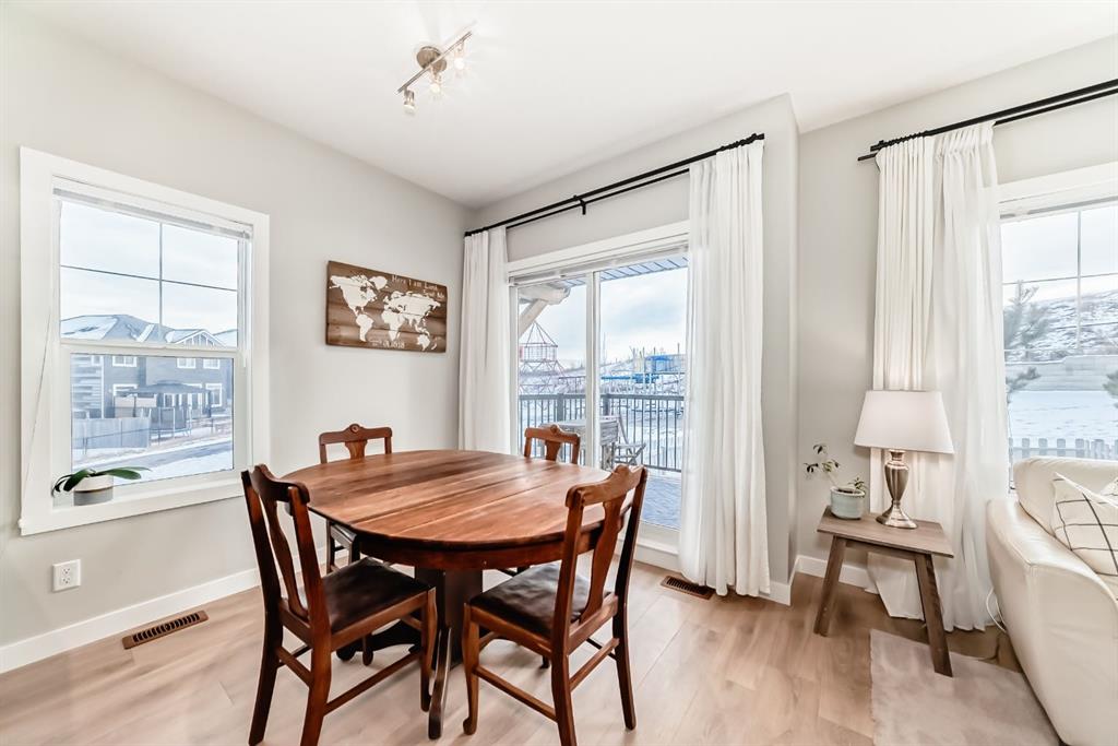 Rare opportunity in Jumping Pound! location, location, location! Beautifully maintained and updated End Unit townhome with 1,156 sq. ft of well though out living space, and backing directly onto South facing green space and a playground, with no neighbours behind. This sought after home features a rare double attached garage, open plan kitchen/dining/living room with easy access to the south facing backyard from the dining area, and abundant natural light throughout. Upstairs offers a primary bedroom with walk in closet and ensuite, plus two additional good sized bedrooms, a full family bathroom, and convenient upper level laundry. Steps from walking and biking paths and just minutes to the Bow River; ideal for outdoor enthusiasts and commuters alike.