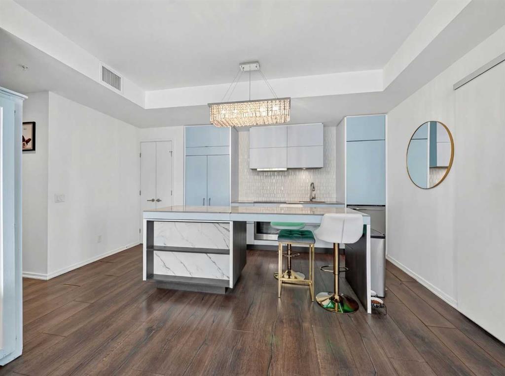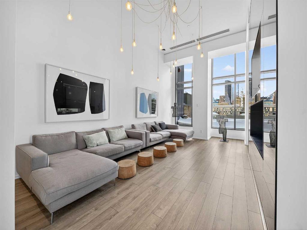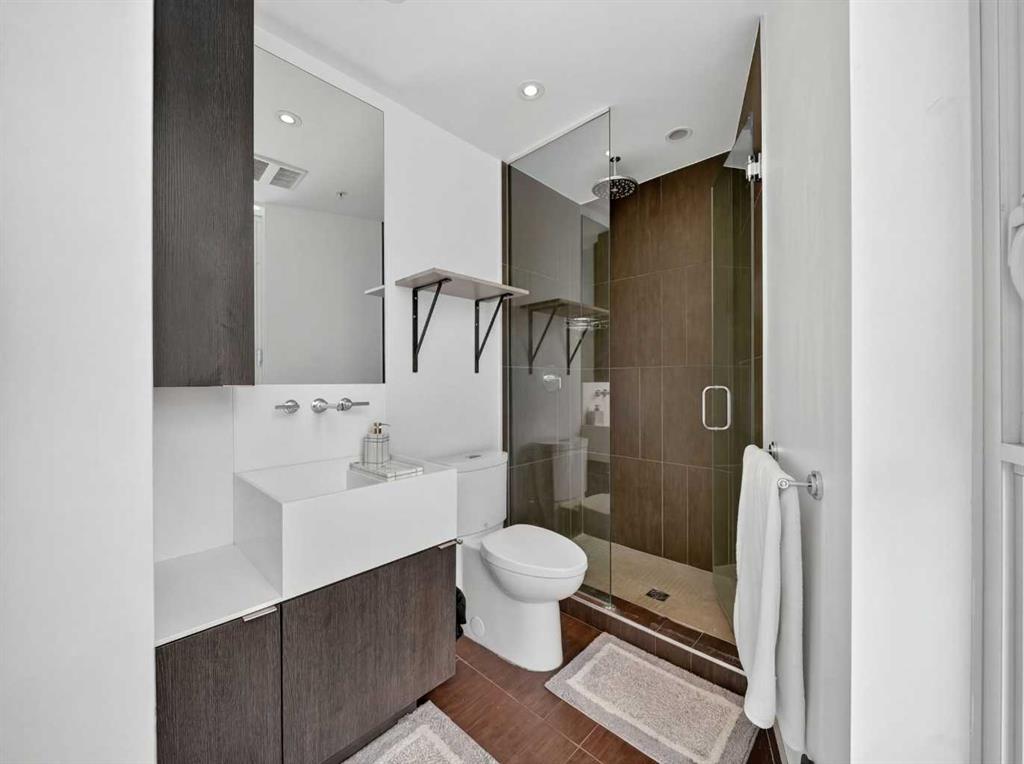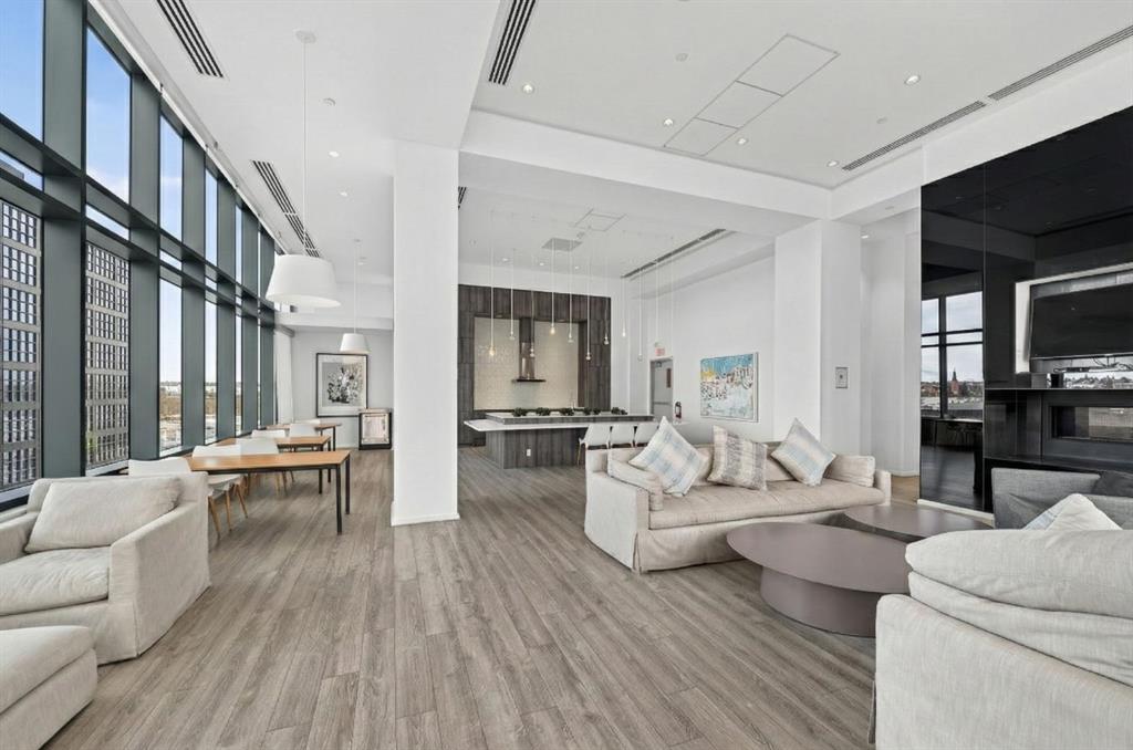 This is downtown living at its best. Welcome to this stunning corner unit in The Verve, located in the heart of East Village — one of Calgary’s most vibrant and walkable communities. This modern 2-bedroom, 2-bathroom condo features floor-to-ceiling windows with panoramic west-facing views, an open-concept layout flooded with natural light, and a sleek kitchen complete with quartz countertops, built-in oven, electric cooktop, and fully integrated appliances. The bright corner primary bedroom offers a stylish 3-piece ensuite, while the second bedroom is thoughtfully positioned on the opposite side of the unit beside a full 4-piece bathroom — ideal for guests, roommates, or a home office. Additional highlights include full-size in-suite laundry, central A/C, custom blinds, and a covered west-facing balcony with a BBQ gas line and space for patio furniture. The Verve offers exceptional amenities including full-time concierge, a fully equipped fitness centre, large social lounge with outdoor patio and fire tables, guest suites, bike storage, visitor parking, and a spectacular 25th-floor rooftop patio with breathtaking views of the downtown core, mountains, and river valley. All just steps from the River Walk, Bow River pathways, St. Patrick’s Island, Studio Bell, the Central Library, restaurants, cafés, and more. Underground titled parking and assigned storage included — an exceptional opportunity to own a premium corner unit in one of Calgary’s most desirable downtown locations.