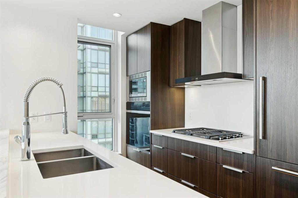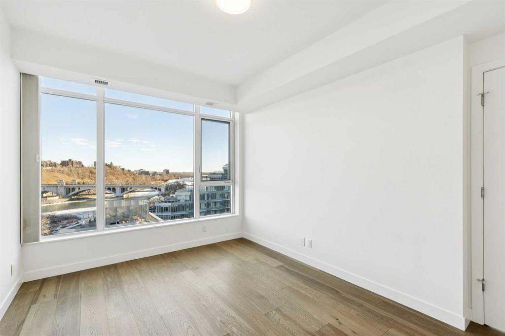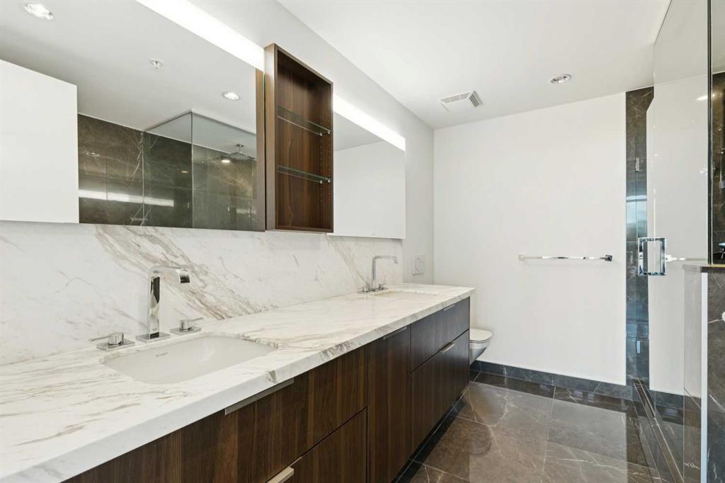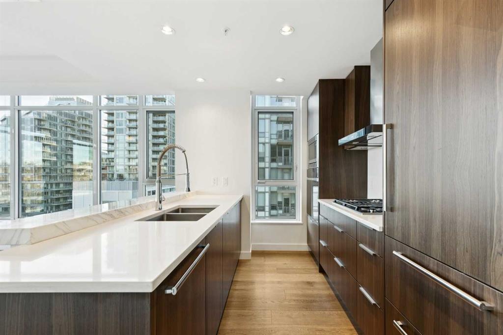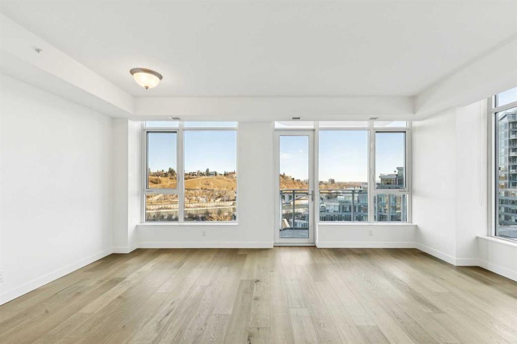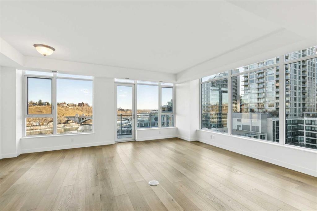 With spectacular, unobstructed views of the Centre Street Bridge, Prince’s Island Park, and the Bow River valley, this stunning two bedroom unit offers one of the most iconic outlooks in the city. With the land in front already developed, the breathtaking views are securely protected. Floor-to-ceiling corner windows flood the apartment with natural light, enhancing the thoughtful two-bedroom, two-bathroom layout, ideal for comfortable living for one or two. The expansive living area opens to a private balcony where river, park, and city views take centre stage. Wide-plank, light-toned laminate flooring runs throughout, complemented by freshly painted interiors and sophisticated, timeless finishes. The contemporary kitchen is both elegant and highly functional, featuring premium appliances including a Wolf gas cooktop and wall oven, integrated Sub-Zero refrigerator, panelled Asko dishwasher, quartz countertops, a marble breakfast bar, ample storage, and a full pantry. The primary bedroom offers a generous walk-in closet and a beautifully appointed ensuite with dual sinks, marble counters, a soaker tub, and a large shower. The second bedroom is well-sized with a window overlooking the city centre and located across from a full bathroom. Additional features include in-suite laundry with folding counter and storage, two assigned underground parking stalls, and a separate storage locker. Building amenities include a well-equipped fitness centre, bike storage, and a car wash bay. Steps to river pathways, Prince’s Island Park, the Peace Bridge, downtown, top restaurants, and year-round festivals – this is exceptional inner-city living.