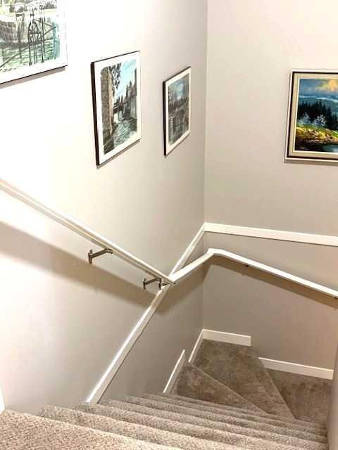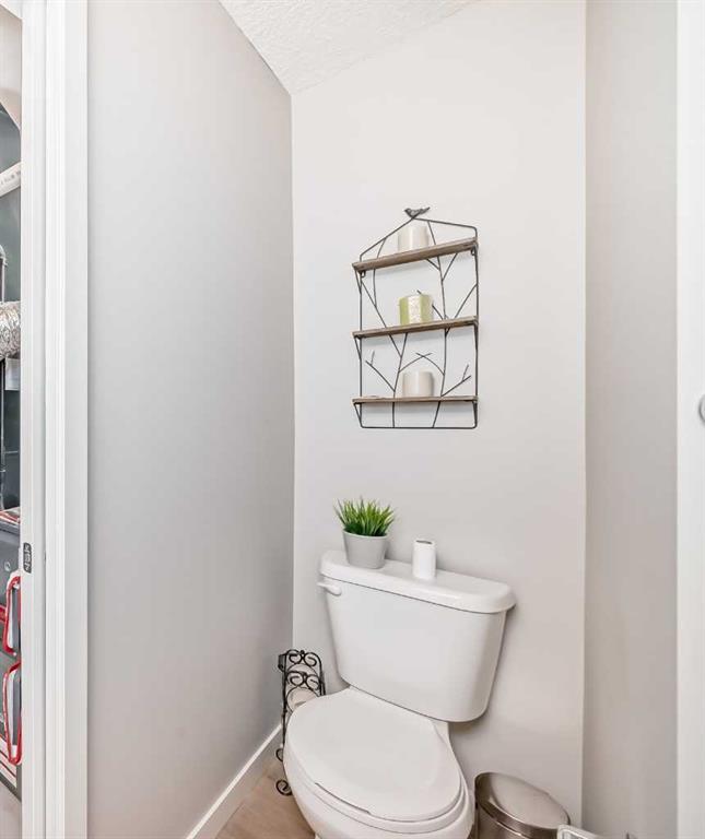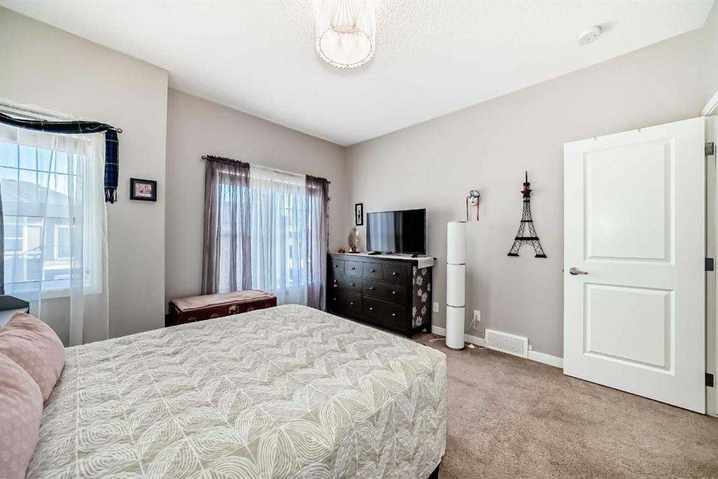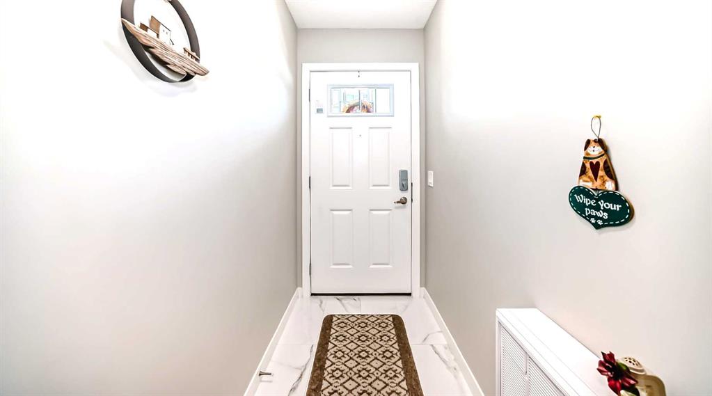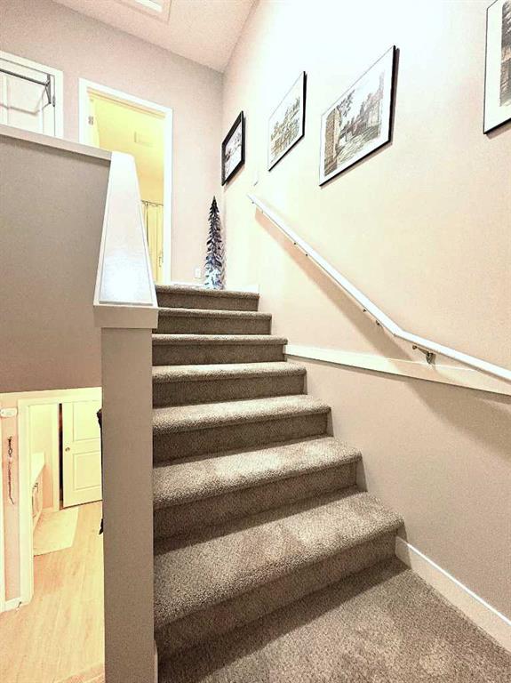Welcome to this immaculate, upgraded townhome in the desirable community of Fireside, Cochrane, featuring peaceful pond and green space views that create a tranquil, nature-inspired setting. The bright, open-concept layout showcases a modern kitchen with quartz countertops, white shaker-style cabinetry with pull-out drawers, stainless steel appliances, and breakfast bar; other upgrades include wide plank flooring, plush carpets, 9-foot ceilings, quartz counters throughout, and energy-efficient LED lighting. Large windows and patio doors open to two private balconies with views of the pond, ideal for morning coffee or evening relaxation. The home offers two spacious bedrooms, including a primary bedroom with a walk-in closet; a full bathroom and a stylish powder room, upper-floor laundry, ample storage, as well as a separate storage unit, and a titled parking at the side of the front door, just perfect for off loading groceries and everyday errands. Located in a well-managed, family-friendly complex close to schools, parks, walking paths, shopping, and recreation, with easy access to Calgary and approximately one hour from Banff and Canmore, this home delivers exceptional value and lifestyle.