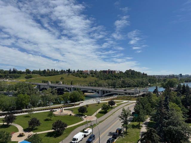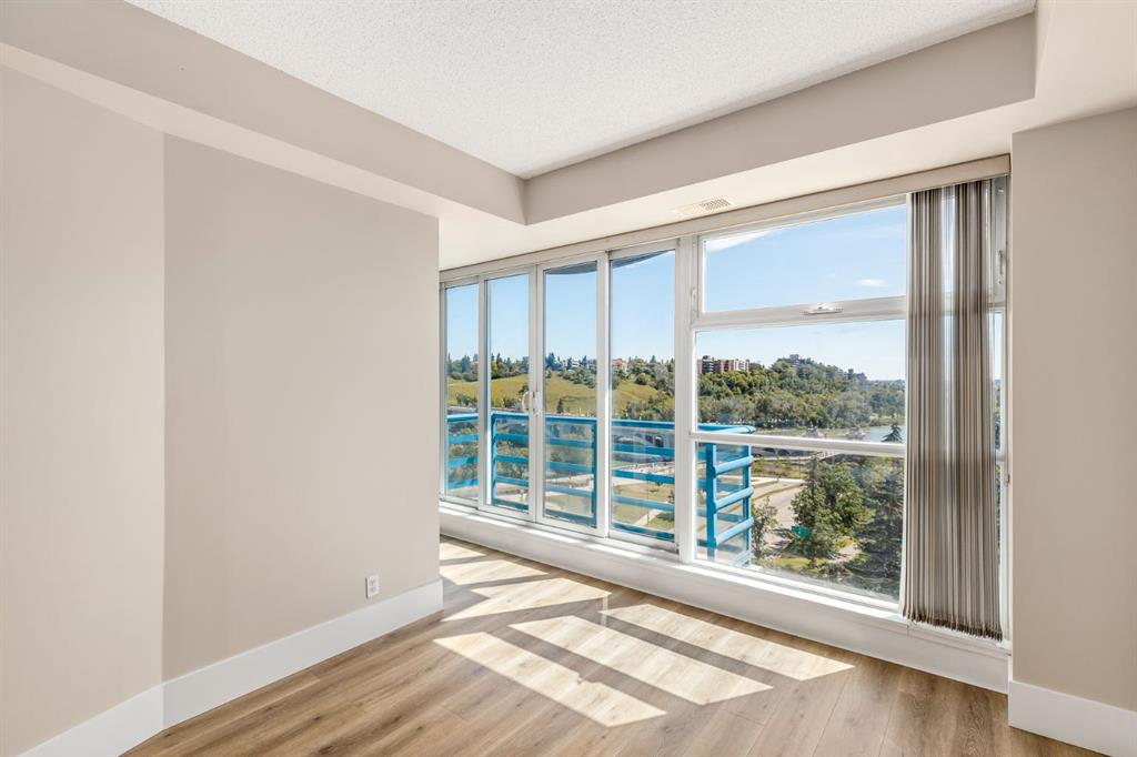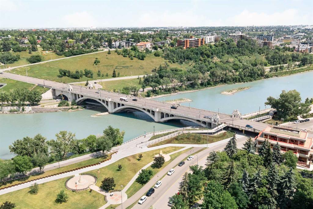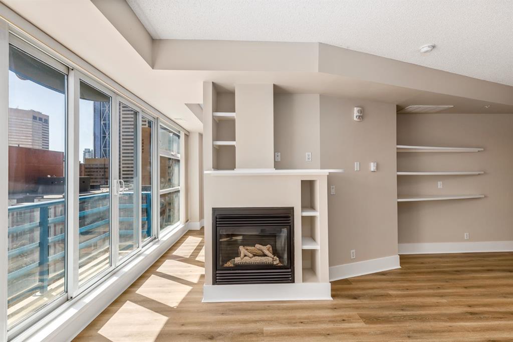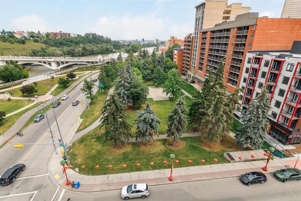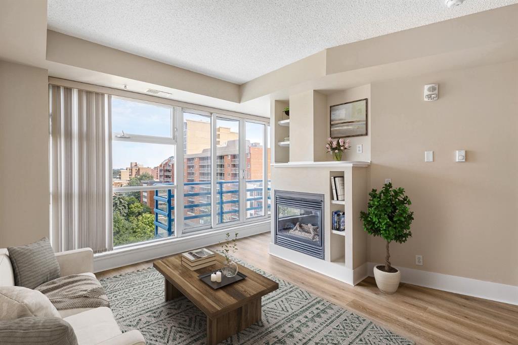 Welcome to 205 Riverfront: an immaculate condo building overlooking the Bow River and situated in the heart of Chinatown. Indulge in a rare opportunity to own a beautifully appointed 8th floor suite in one of Calgary’s most desirable downtown addresses. This spacious and light-filled 1 Bed 1 Bath offers nearly 800 square feet of stylish urban living, highlighted by floor-to-ceiling windows that frame captivating views of the Bow River, Centre Street Bridge, and the vibrant city skyline. The thoughtfully designed open concept layout features a modern kitchen with granite countertops and stainless-steel appliances, seamlessly flowing into the living and dining areas—perfect for both entertaining and everyday living. A cozy gas fireplace and custom built-ins add warmth and character, while the expansive private balcony invites you to relax and take in sweeping views of the stunning surroundings. The serene bedroom retreat includes a walk-through closet and luxurious 4-piece ensuite. A versatile den upon entering is the perfect home office, fitness area, reading nook, or bonus storage space. Additional highlights include fresh paint and brand new laminate flooring throughout, central A/C and heat, in-suite laundry, and an underground parking stall in the heated parkade. Positioned directly across from the Bow River Pathway system and Sien Lok Park, and mere steps to shops in Eau Claire, Chinatown, East Village, and the Downtown Core, this location offers unmatched convenience. Enjoy 24-hour concierge service, secure concrete construction, and easy access to the LRT, bountiful restaurants, cafes and lounges, entertainment venues, and Calgary’s +15 network. Whether you’re a professional, an investor, or looking to integrate into the heart of the city, this is your chance to live in a truly iconic location where comfort, style, and walkable city living meet.